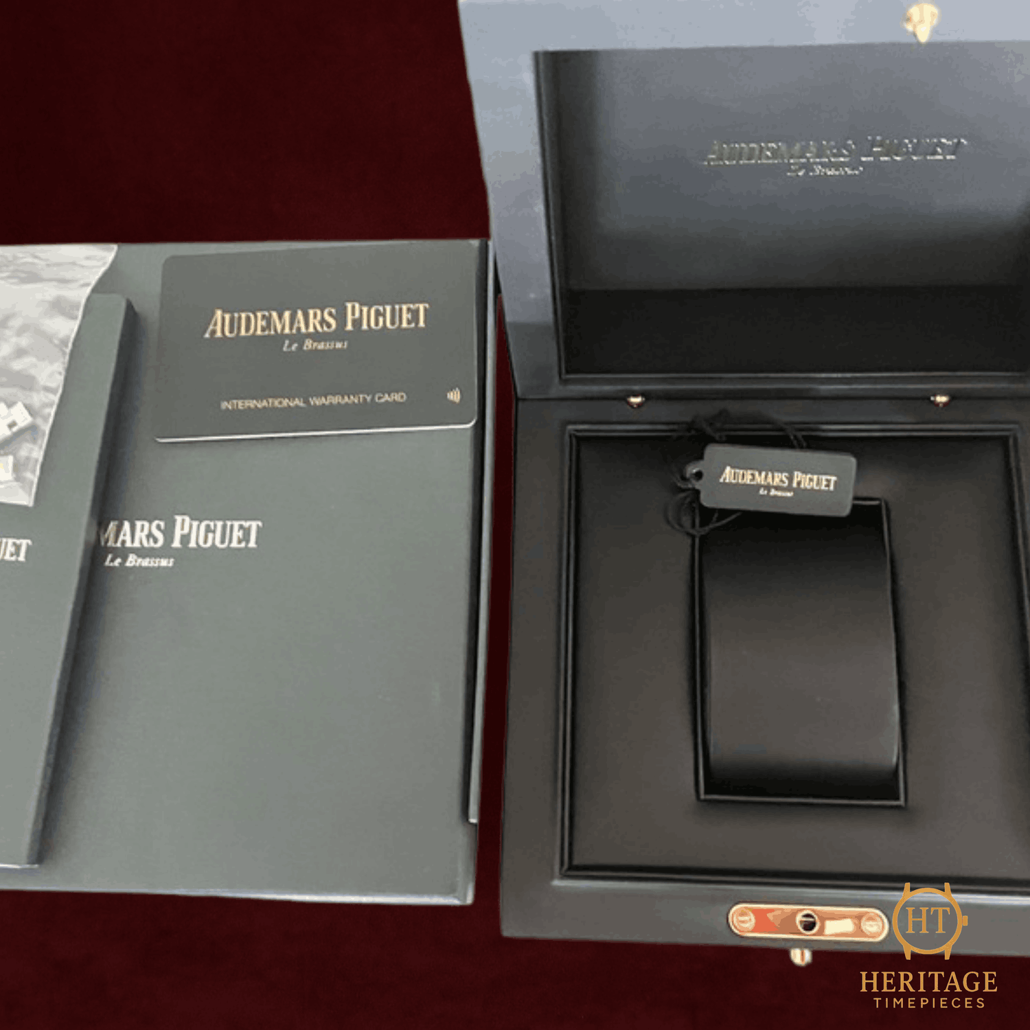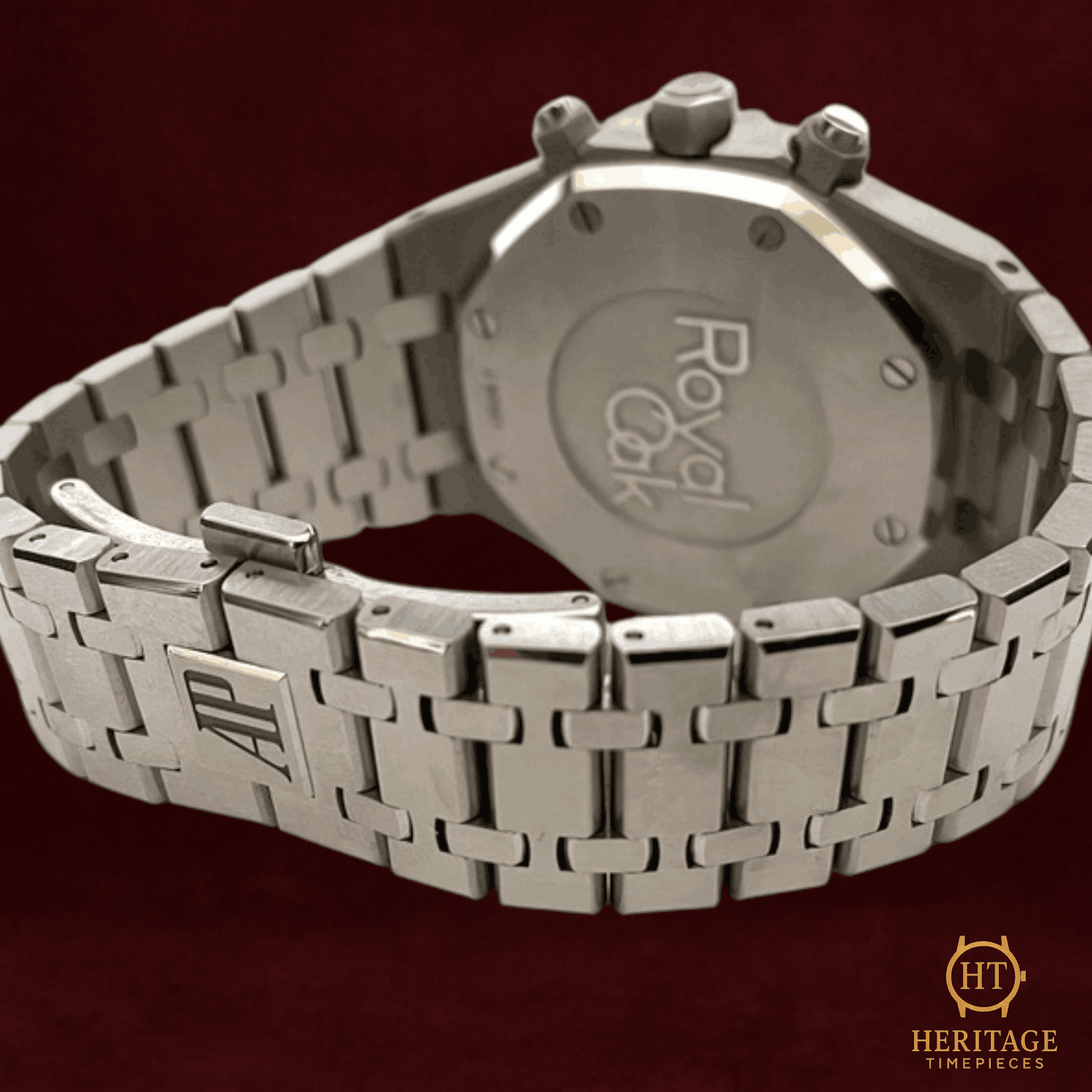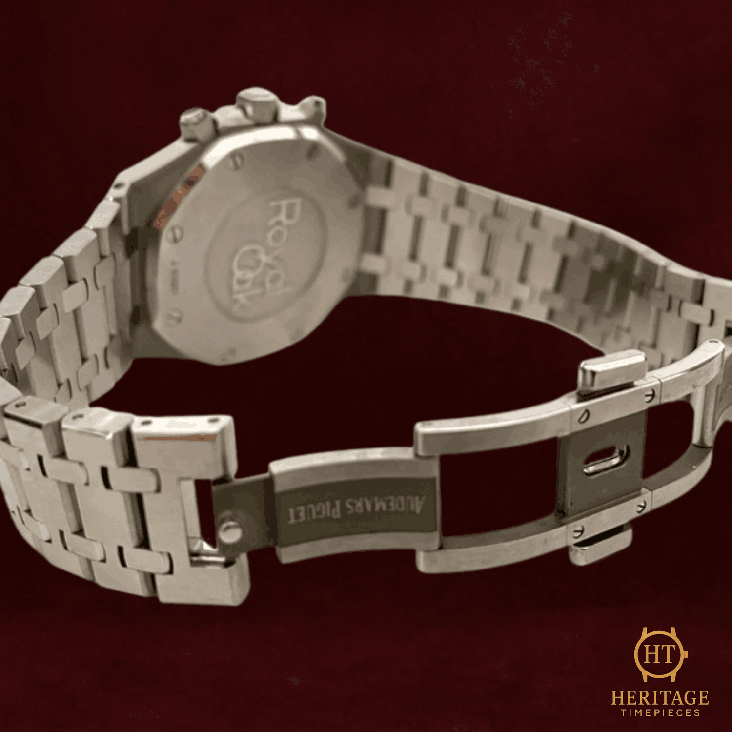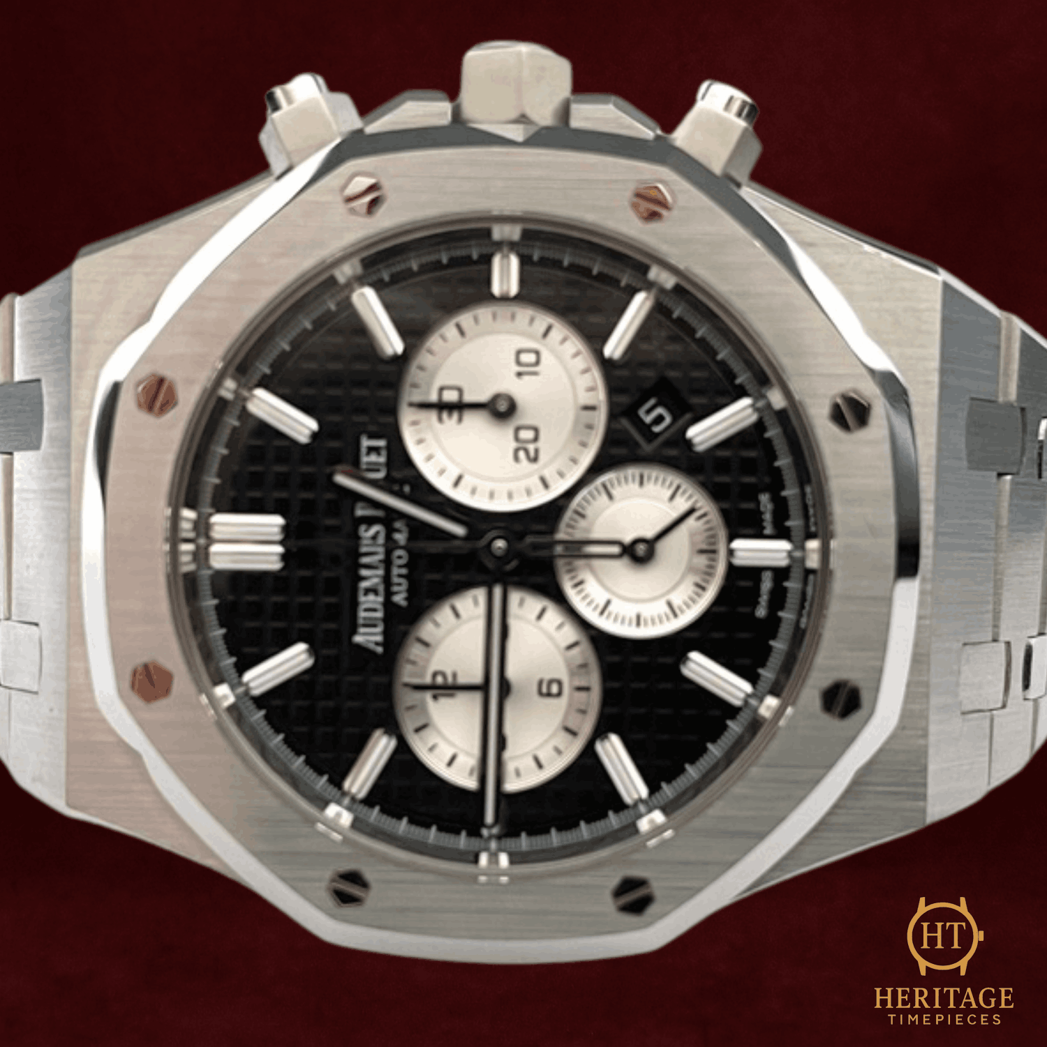 Heritage Narrative The Audemars Piguet Royal Oak Chronograph reference 26331ST represents a modern evolution of Gérald Genta’s iconic Royal Oak design. Combining the signature octagonal case and integrated bracelet with a sporty chronograph layout, it balances high-end finishing with everyday wearability in a distinctly contemporary format. Technical Specifications Reference:26331ST.OO.1200ST.02 Year:February 2018 Movement:Automatic chronograph movement Case:41 mm stainless steel case Bezel:Fixed octagonal bezel in stainless steel Crystal:Scratch-resistant sapphire crystal Dial / Hands:Black dial with chronograph subdials and luminous markers Bracelet / Clasp:Integrated stainless steel bracelet with folding clasp Water resistance:50 m (manufacturer specification) Condition & Inclusions Overall grade:Pre-owned — excellent condition Service status:Movement tested and functioning correctly Set:Full set — original box and warranty card Shipping & Logistics Stored off-site and shipped fully insured within 1–3 business days.Worldwide shipping available; buyer responsible for any import duties or taxes. Shipping & Returns Complimentary insured worldwide shipping and a 14-day return window (watch must be returned in the same condition supplied). Each timepiece is authenticated, time-tested, and professionally prepared prior to dispatch. All shipments include secure packaging, tracking, and full insurance coverage.