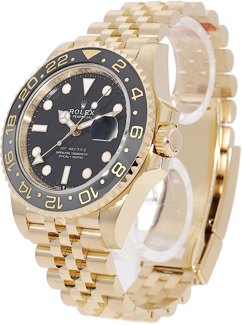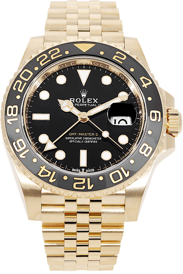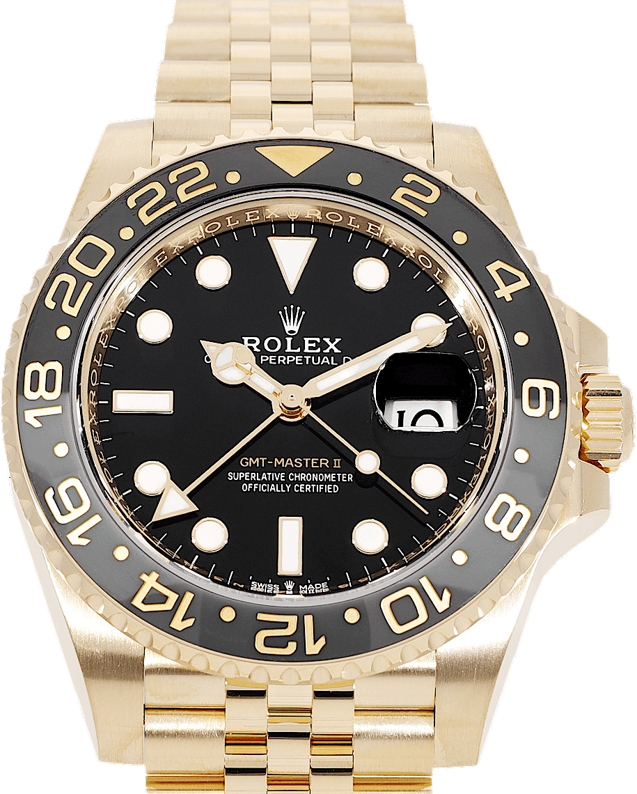 Rolex GMT-Master II, Reference: 126718GRNR, Gender: Male, Size: 40mm, Dial color: Black, Strap material: Yellow Gold, Movement: Automatic, Year: 2024, Condition: New and unworn. An inspection by our certified watchmakers guarantees authenticity., Documents: Chronext Certificate