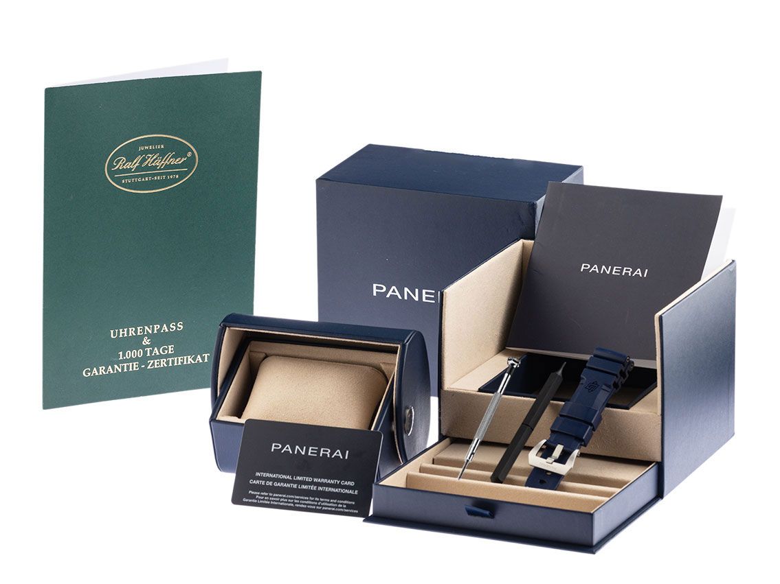 Stalen kast met satijnglans, kastdiameter zonder kroon 42mm, kasthoogte 13,1mm. Gepolijste stalen lunette met blauwe inlay en 60-minuten schaal met een lichtpunt, eenzijdig draaibaar. Gepolijst en satijnen stalen armband, dubbele veiligheidsvouwsluiting van staal met fabrikantlogo. Blauwe wijzerplaat met opgezette stalen lichtindexen en lichtgevende wijzers. Automatisch uurwerk, manufactuurkaliber P.900 met 23 edelstenen, gangreserve van ongeveer 72 uur. Weergave van uur en minuut via centrale wijzers, kleine seconde met seconde-stop voor nauwkeurige tijdinstelling bij 9 uur, datumaanduiding met snelle instelling bij 3 uur. Krasbestendig en gebogen saffierglas. Kroon met gepatenteerde Panerai beschermbeugel. Achterkant van staal, geschroefd en gegraveerd. Gewicht van het horloge inclusief armband 171g, lengte van de armband inclusief kast 180mm. Waterdicht tot 30 ATM. Referentienummer: PAM02068, ID: ST1160174181124H-11900, artikelnummer: 10000076992. Originele Panerai doos en garantiepapieren van november 2024, evenals beschrijving, verwisselbare rubberen band en bandwisselgereedschap, Full Set. Ongebruikt. Leveringstijd direct.