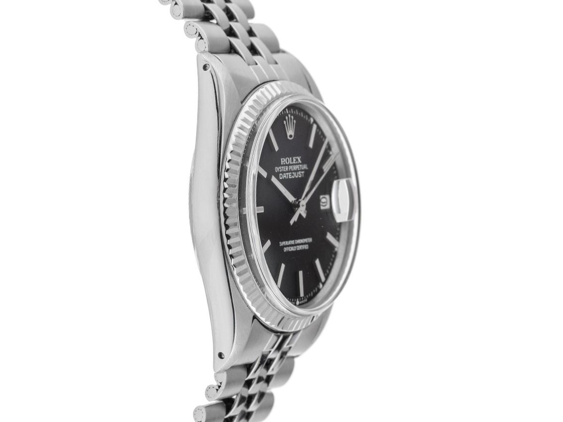 Behuizing van gepolijst en gesatineerd staal, behuizingsdiameter zonder kroon 36mm, behuizingshoogte 11,6mm. Lunette van 18kt witgoud, geribbeld en gepolijst. Jubileearmband van gevouwen, gepolijst en gesatineerd staal, Rolex vouwsluiting van staal met fabrikantlogo. Wijzerplaat zwart met gekröpter minutenschaal, opgezette witgouden indexen en witgouden wijzers. Uurwerk automatisch, chronometer, Rolex manufaktuurkaliber 1570 met 26 edelstenen. Weergave van uur, minuut en seconde via centrale wijzers, datumaanduiding onder vergrootglas bij 3 uur met open 6/9 (open 6 en 9 in de datumaanduiding). Gebogen plexiglas. Kroon met schroefdraad en fabrikantlogo. Achterkant van staal, geschroefd. Gewicht van het horloge inclusief armband 87g, lengte van de armband inclusief behuizing 180mm. Referentienummer: 1601, behuizingsnummer: 3464XXX, bouwjaar: 1971, ID: P289174000426HW-6900, artikelnummer: 10000085619. Met gangcontrole en volledige uiterlijke opfrissing van april 2026. Originele Rolex doos en garantiepapieren zonder datumvermelding, LC Zwitserland, beschrijving, vertaalboekje, leren etui, Rolex chronometerzegel en uittreksel van het Watch Register van april 2026, The Watch Register certificaat / zonder vermelding (internationale database voor verloren of gestolen horloges), Full Set. Superscherpe aanbieding, investering met waardestijgingspotentieel. Zeer goede staat. Leveringstijd direct.