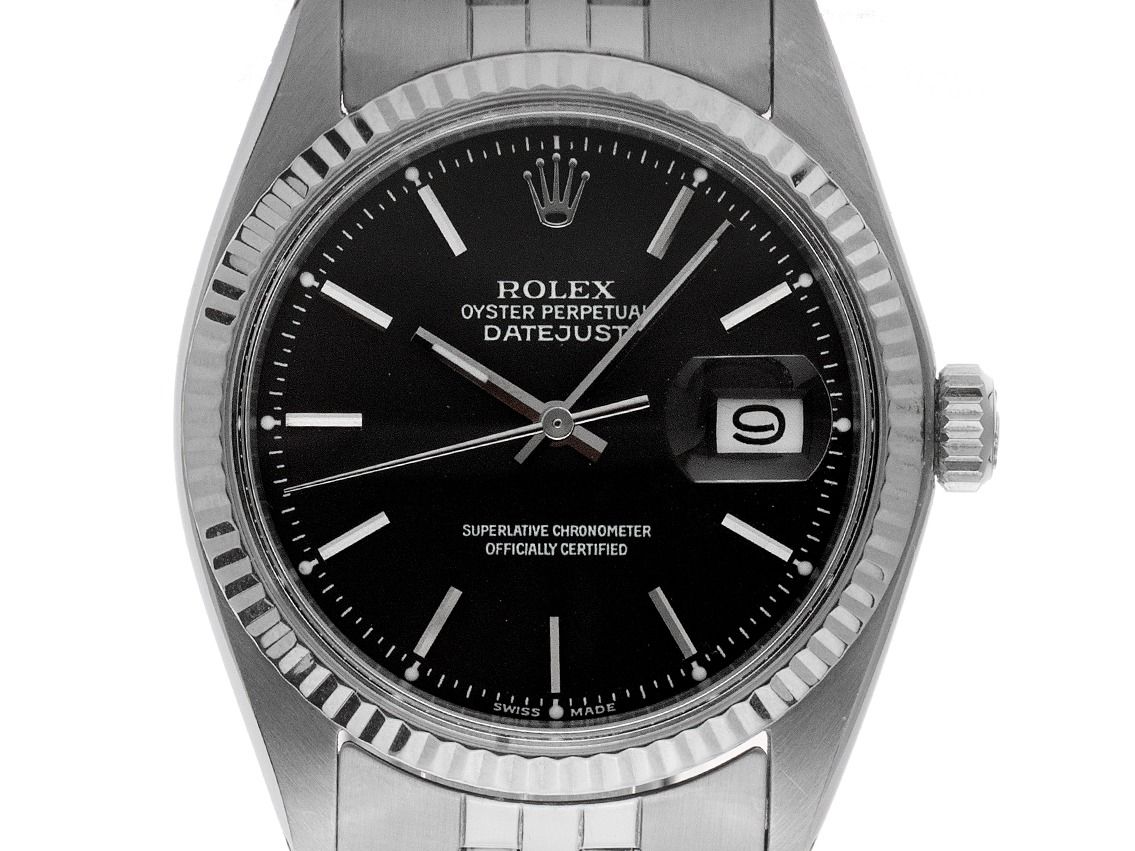 Rolex Datejust Stahl 18kt Weißgold Automatik Armband JubiléGehäuse Edelstahl poliert und satiniert, Gehäusedurchmesser ohne Krone 36mm, Gehäusehöhe 11,6mm. Lünette 18kt Weißgold geriffelt und poliert. Armband Jubilé Edelstahl gefaltet, poliert und satiniert, Rolex Faltschließe Edelstahl mit Hersteller-Logo. Zifferblatt schwarz mit gekröpfter Minuterie, aufgesetzten weißgoldenen Indexen und weißgoldenen Zeigern. Uhrwerk Automatik, Chronometer, Rolex Manufakturkaliber 1570 mit 26 Edelsteinen. Anzeige von Stunde, Minute und Sekunde über Zeiger aus der Mitte, Datumsanzeige unter Glaslupe bei 3 Uhr mit open 6/9 (offene 6 und 9 in der Datumsanzeige). Plexiglas gewölbt. Krone verschraubbar mit Hersteller-Logo. Boden Edelstahl verschraubt. Gewicht der Uhr inklusive Armband 87g, Länge des Armbandes inklusive Gehäuse 180mm. Referenznummer: 1601, Gehäusenummer: 3464XXX, Baujahr: 1971, ID: P289174000426HW-6900, Artikelnummer: 10000085619. Mit Gangkontrolle und kompletter äußerlicher Aufarbeitung von April 2026. Original Rolex Box und Garantie Papiere ohne Datumseintrag, LC Schweiz, Beschreibung, Übersetzungsheft, Ledermäppchen, Rolex Chronometer-Siegel und Watchregister Auszug von April 2026, The Watch Register Zertifikat / ohne Eintrag (Internationale Datenbank für verlorene oder gestohlene Uhren), Full Set. Superschnäppchen, Kapitalanlage mit Wertsteigerungspotential. Sehr guter Zustand. Lieferzeit sofort.