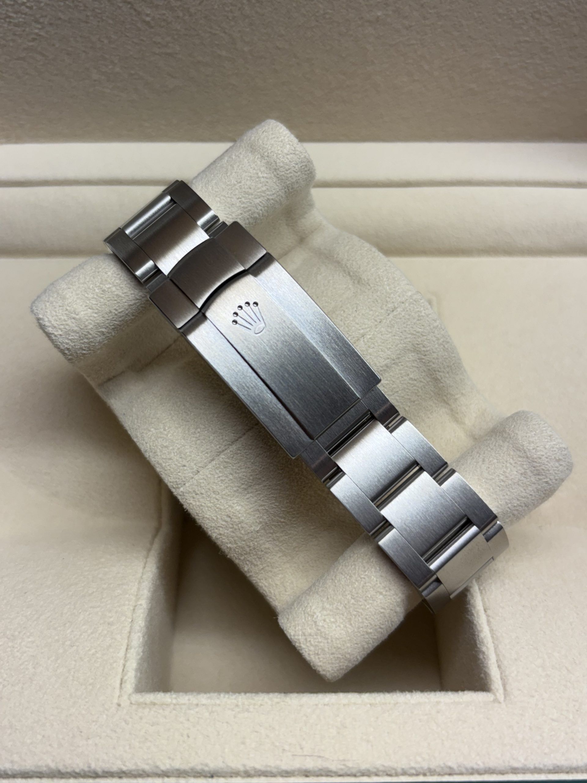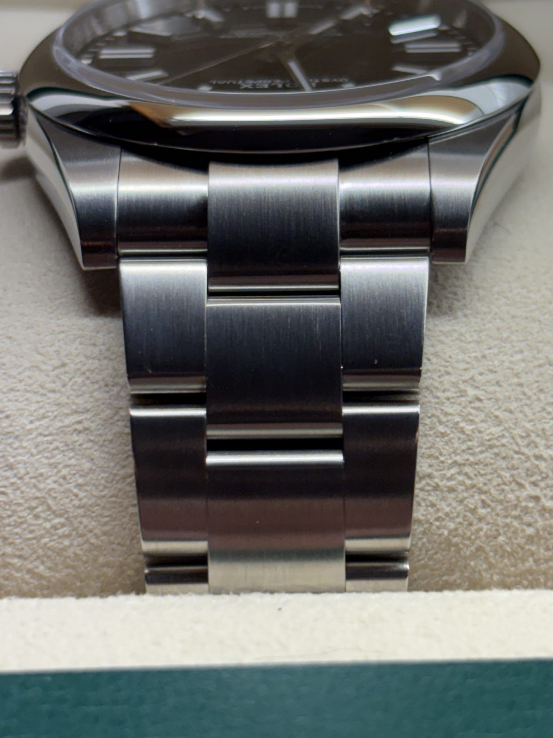 - Lichte gebruikssporen zoals haarlijntjes of kleine oppervlakkige krasjes. Kast, bezel en band behouden hun scherpe randen en oorspronkelijke vorm. Mogelijk professioneel gepolijst zonder de originele contouren aan te tasten. Mechanisch volledig functioneel.