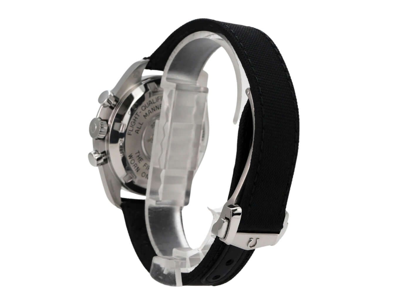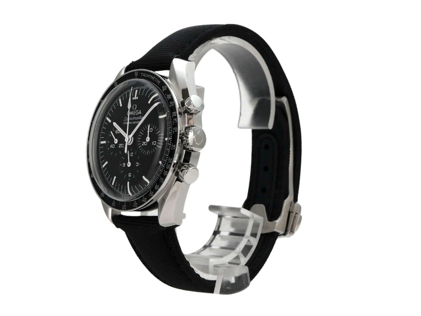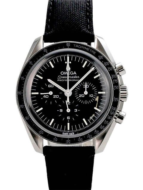 Omega Speedmaster Professional Moonwatch Ref. 310.32.42.50.01.001Case made of polished and satin-finished stainless steel, case diameter 42 mm, case height 14.3 mm, stainless steel bezel with black insert and tachymeter scale, black textile strap with folding clasp, black dial with applied luminous indices, luminous hands, manual winding movement, caliber Omega 3861 with 26 jewels, 21,600 A/h, power reserve approx. 50 hours, chronograph, Master Chronometer, Hesalite crystal, screwed and engraved stainless steel case back, water-resistant up to 5 bar.