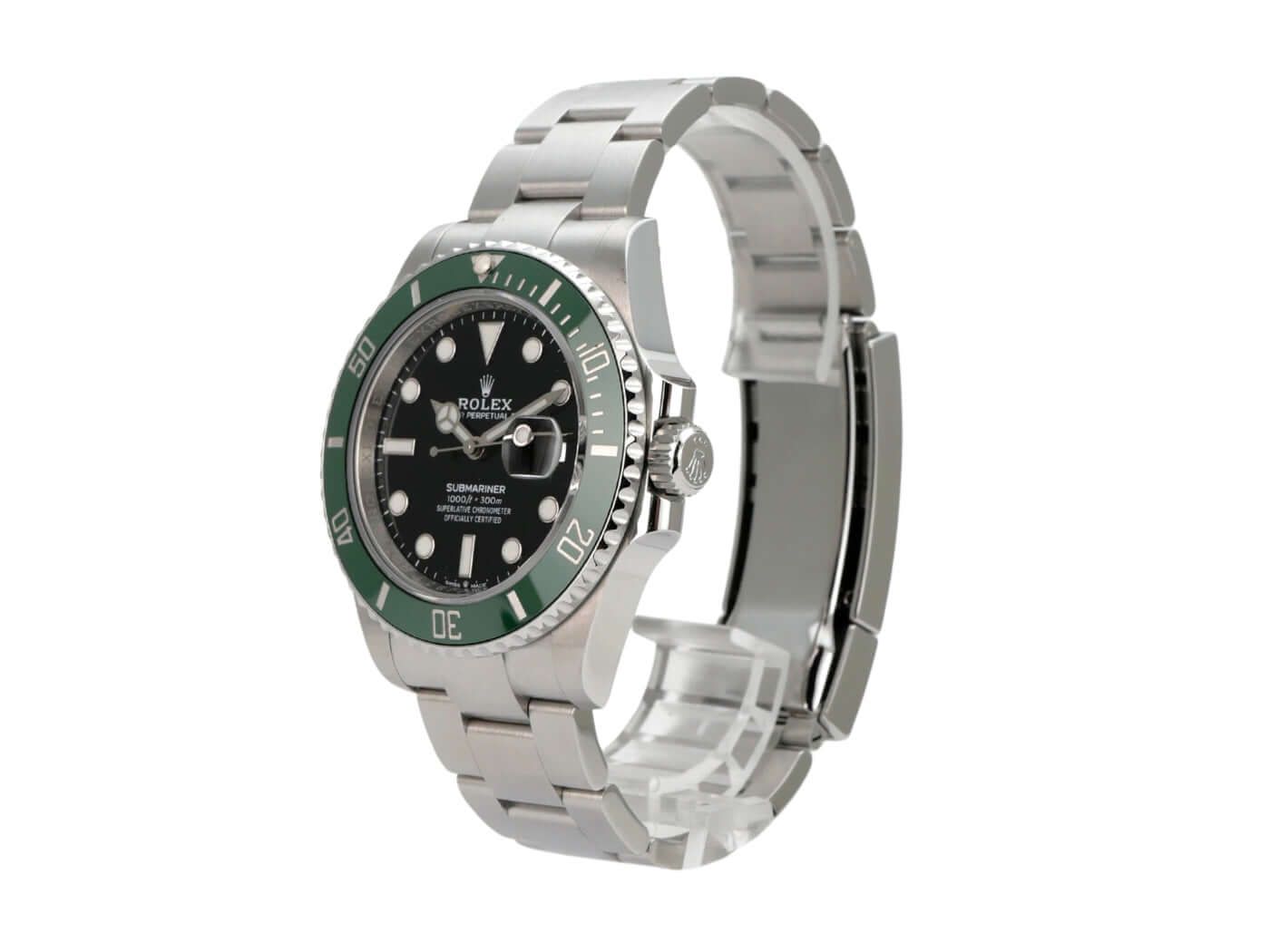 Rolex Submariner Date Stainless Steel Ref. 126610LV from 2021Case made of polished and satin-finished stainless steel, case diameter 41 mm, case height 12.5 mm, stainless steel bezel with green ceramic insert, 60-minute scale and luminous dot, rotatable, Oyster stainless steel bracelet, polished and satin-finished with safety folding clasp, black dial with applied luminous indices, luminous hands, automatic movement, Rolex caliber 3235 with 31 jewels, 28,800 A/h, 70-hour power reserve, date display with quick adjustment and magnifier, chronometer, sapphire crystal, screw-down crown with crown guards, screw-down stainless steel case back, water-resistant up to 30 bar.