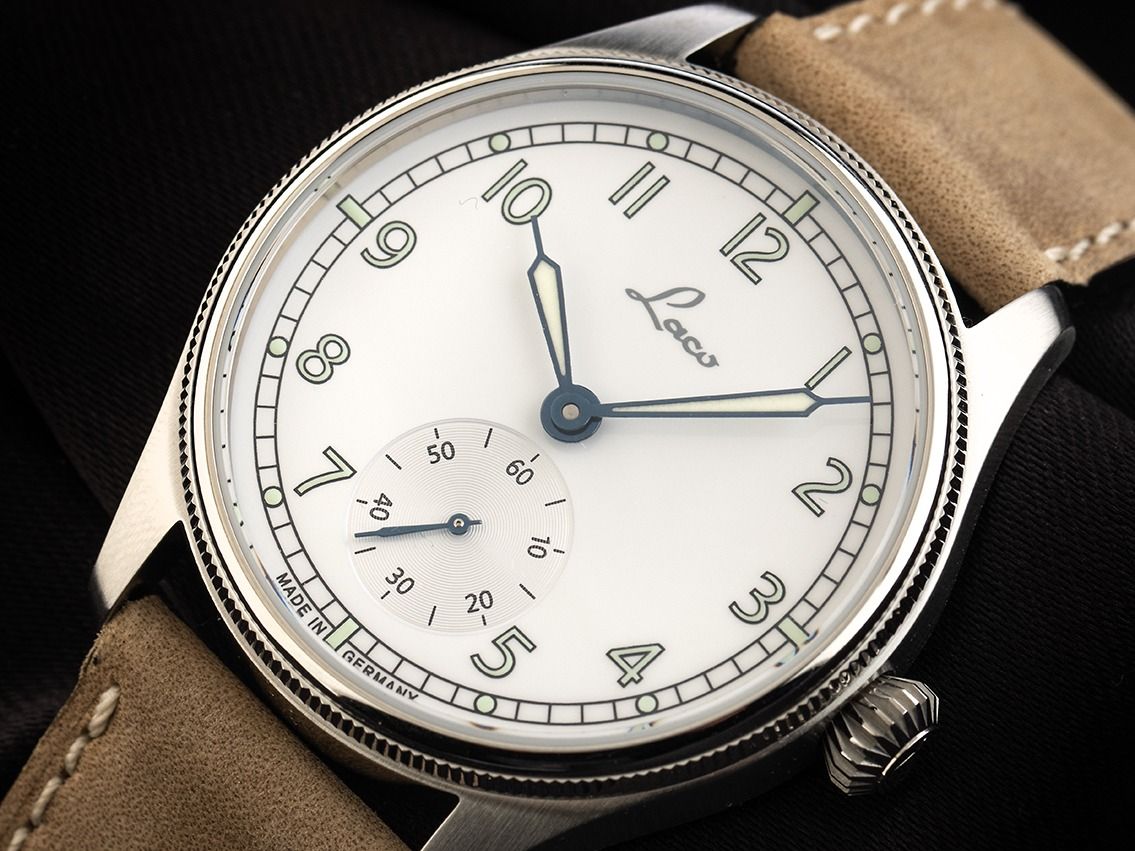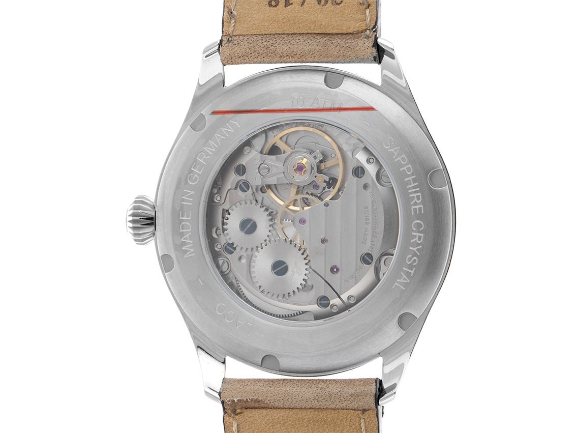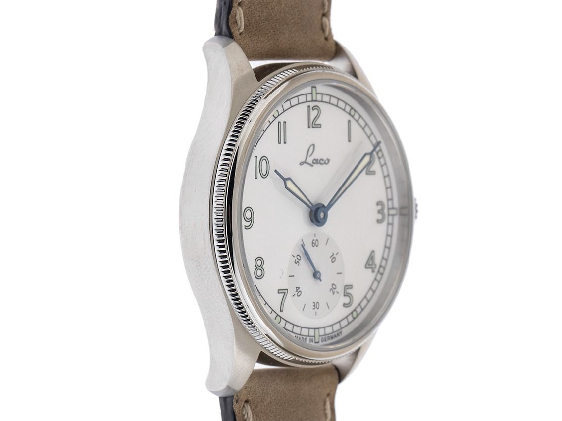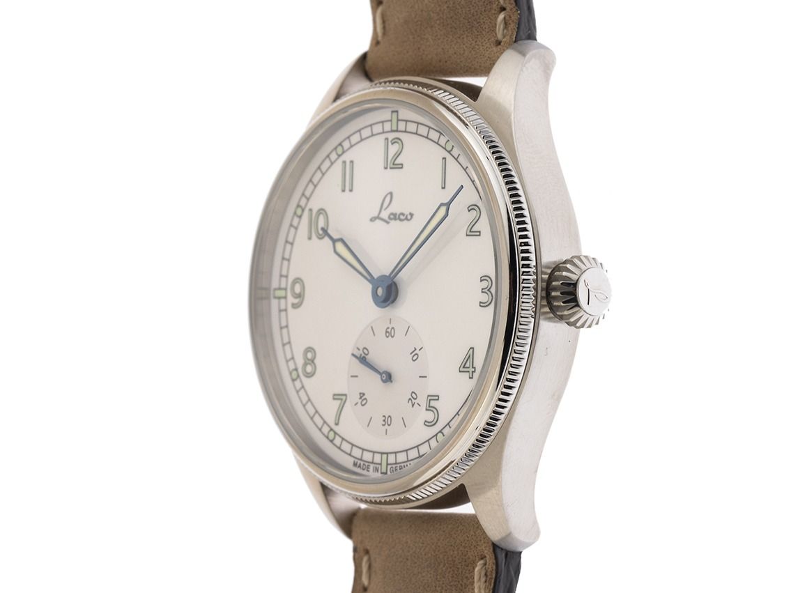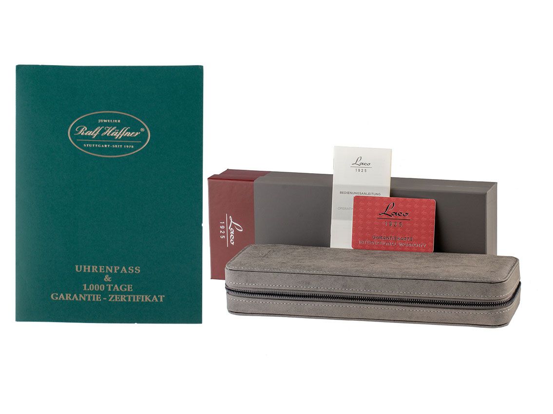 Gehäuse van geborsteld roestvrij staal, Gehäusediameter zonder kroon 39mm, Gehäusehoogte 10,0mm. Armband van bruin leer met lichte siernaad, Anstoßbreite 20mm, pin-buckle van roestvrij staal met fabrikant-logo. Wijzerplaat wit met Arabische cijfers en indexen, evenals geblauwde luminescerende wijzers. Uurwerk Handaufzug, Kaliber Laco 261 met 23 edelstenen. Weergave van uur, minuut en seconde via wijzers vanuit het midden, kleine seconde met seconde-stop voor nauwkeurige tijdinstelling bij 6 uur. Saffierglas krasbestendig. Achterkant van roestvrij staal, geschroefd en gegraveerd met saffierglas kijkvenster. Gewicht van het horloge inclusief armband 65g. Waterdicht tot 10 ATM. Referentienummer: 862168, ID: ST061515480426H-1290, Artikelnummer: 10000085670. Originele Laco doos en garantiepapieren, Full Set. Nieuw. Leveringstijd direct.