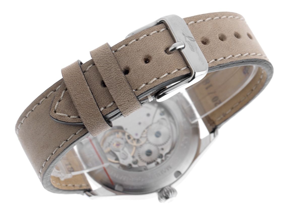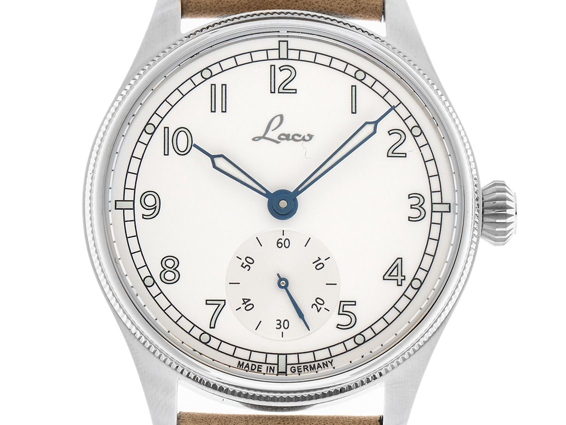 Laco Cuxhaven Handaufzug Armband Leder Gehäuse Edelstahl satiniert, Gehäusedurchmesser ohne Krone 39mm, Gehäusehöhe 10,0mm. Armband Leder braun mit heller Ziernaht, Anstoßbreite 20mm, Stiftschließe Edelstahl mit Hersteller-Logo. Zifferblatt weiß mit arabischen Ziffern und Indexen sowie gebläuten Leuchtzeigern. Uhrwerk Handaufzug, Kaliber Laco 261 mit 23 Edelsteinen. Anzeige von Stunde, Minute und Sekunde über Zeiger aus der Mitte, kleine Sekunde mit Sekundenstop zur Sekunden genauen Einstellung der Uhrzeit bei 6 Uhr. Saphirglas kratzfest. Boden Edelstahl verschraubt und graviert mit Saphirglas Sichtfenster. Gewicht der Uhr inklusive Armband 65g. Wasserdicht bis 10 ATM. Referenznummer: 862168, ID: ST061515480426H-1290, Artikelnummer: 10000085670. Original Laco Box und Garantie Papiere, Full Set. Neu. Lieferzeit sofort.