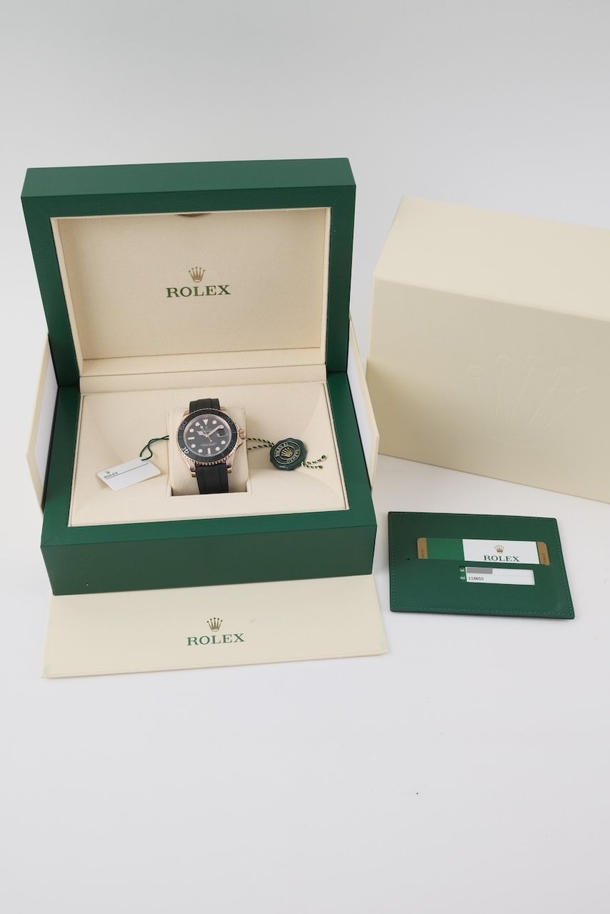 **Watch Description** Ready for your new dream watch? Perhaps this beautiful Rolex Yacht-Master 40 made of Pink gold will soon be on your wrist. Whether vintage or modern - with over 200 watches in stock, we always have your new luxury watch available for you immediately - whether you are a first-time buyer or your watch collection needs a new addition. **FACT CHECK - Everything you need to know:** - Movement checked for running behavior and no pending service. - If you like the watch in the pictures, you'll love it on your wrist. Our macro shots are unedited and show more than your eye can see. **SPECIFICATIONS AND SCOPE OF DELIVERY - This is how your new watch will arrive:** - Case diameter: 40mm - Wrist circumference: up to 17.5cm - Year of manufacture: 2017 - Case material: Pink gold - Strap material: Rubber - Bracelet color: Black - Dial color: Black - Reference number: 116655 - Movement: Automatic - Original box included - Original papers - 12 months warranty - The complete scope of delivery can be seen in the pictures **QUALITY PROMISE** Every watch is checked for authenticity and function by our master watchmaker. So you get the all-round carefree package and an additional 12-month warranty! **INSPECTION AND SHIPPING** - Worldwide insured priority transport with tracking number. We deliver to watch lovers and collectors worldwide. Whether Asia, America, Australia or any other part of the world - the watch pictured can be on your wrist in just a few days. Within the EU even next-day. Alternatively, we would be happy to meet you at one of our 2 locations in southern Germany by prior arrangement: - Bavaria: THE BANK 94436 - Baden-Württemberg: THE LOFT 89073 - We also offer you a trade-in of your watch(es) to make the deal possible. - The purchase price is taxed according to §25 UStG. VAT is therefore not shown. - Prices include all taxes and fees for deliveries within the EU. There are no additional costs. **WatchId:** GID-4614-403a