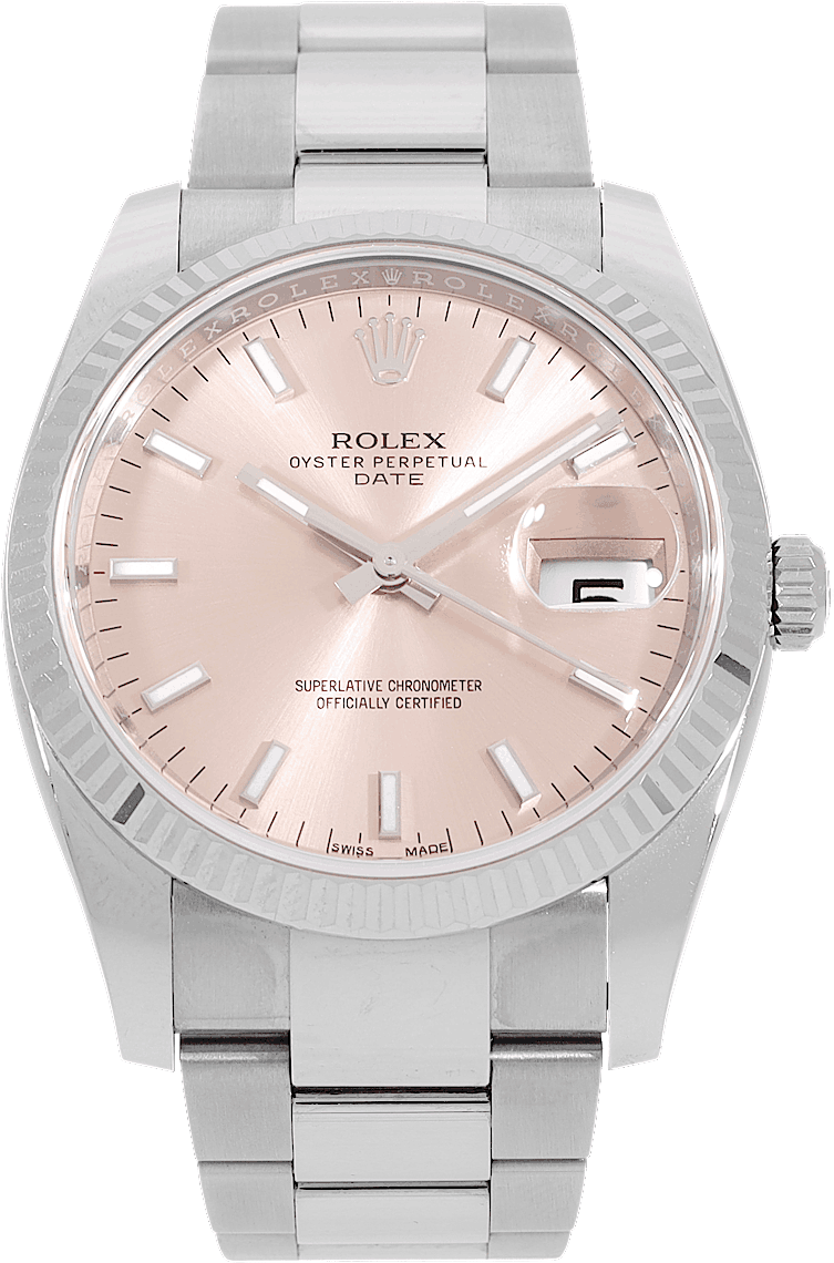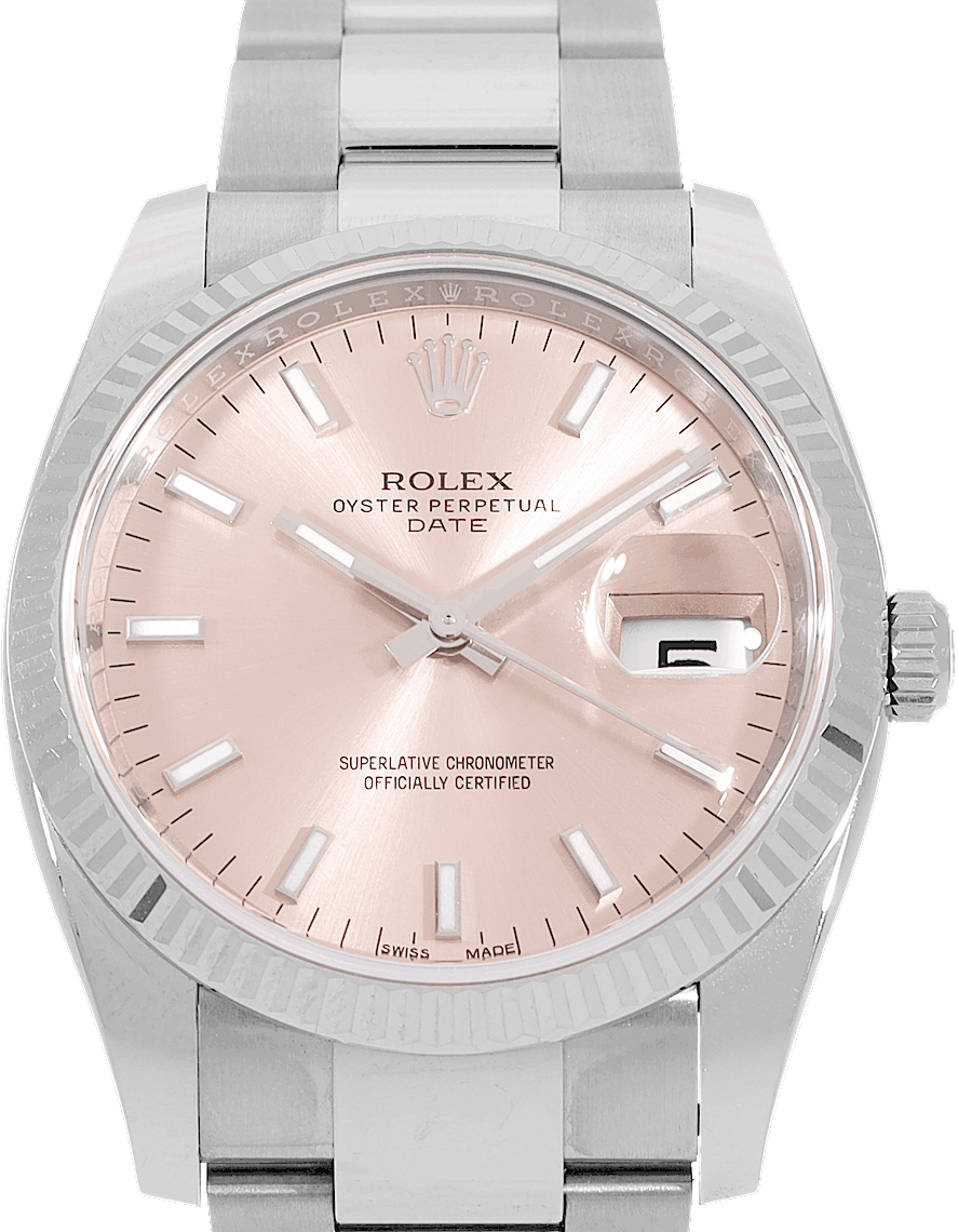 Rolex Date, Reference: 115234, Gender: Female, Size: 34mm, Dial color: Rose, Strap material: Stainless Steel, Movement: Automatic, Year: 2020, Condition: Previously worn, minor to no signs of usage. The movement is flawless and the case has been cleaned. watch tested ensure full functionality. An inspection by our certified watchmakers guarantees its authenticity., Documents: Original papers, CHRONEXT Certificate