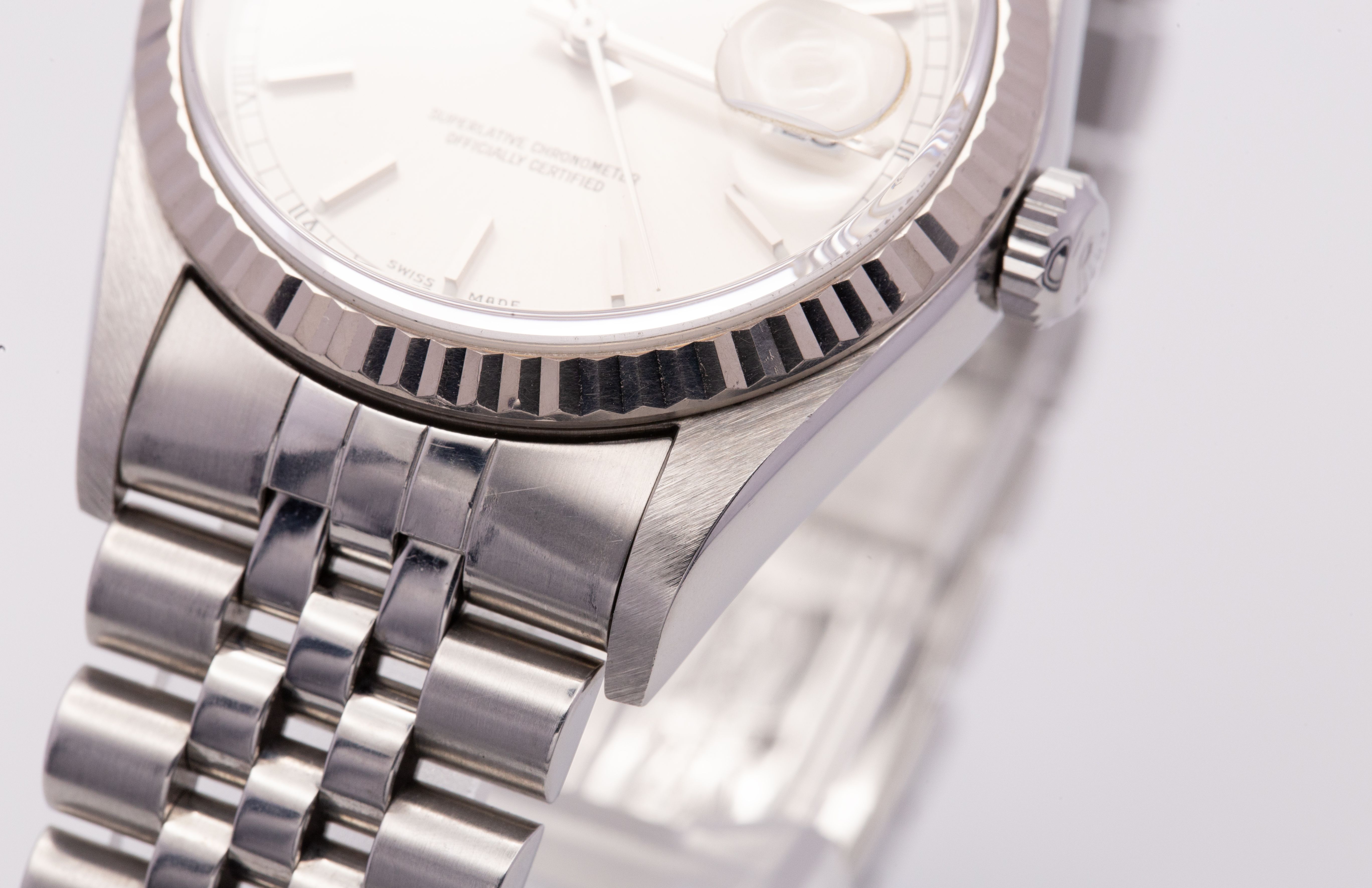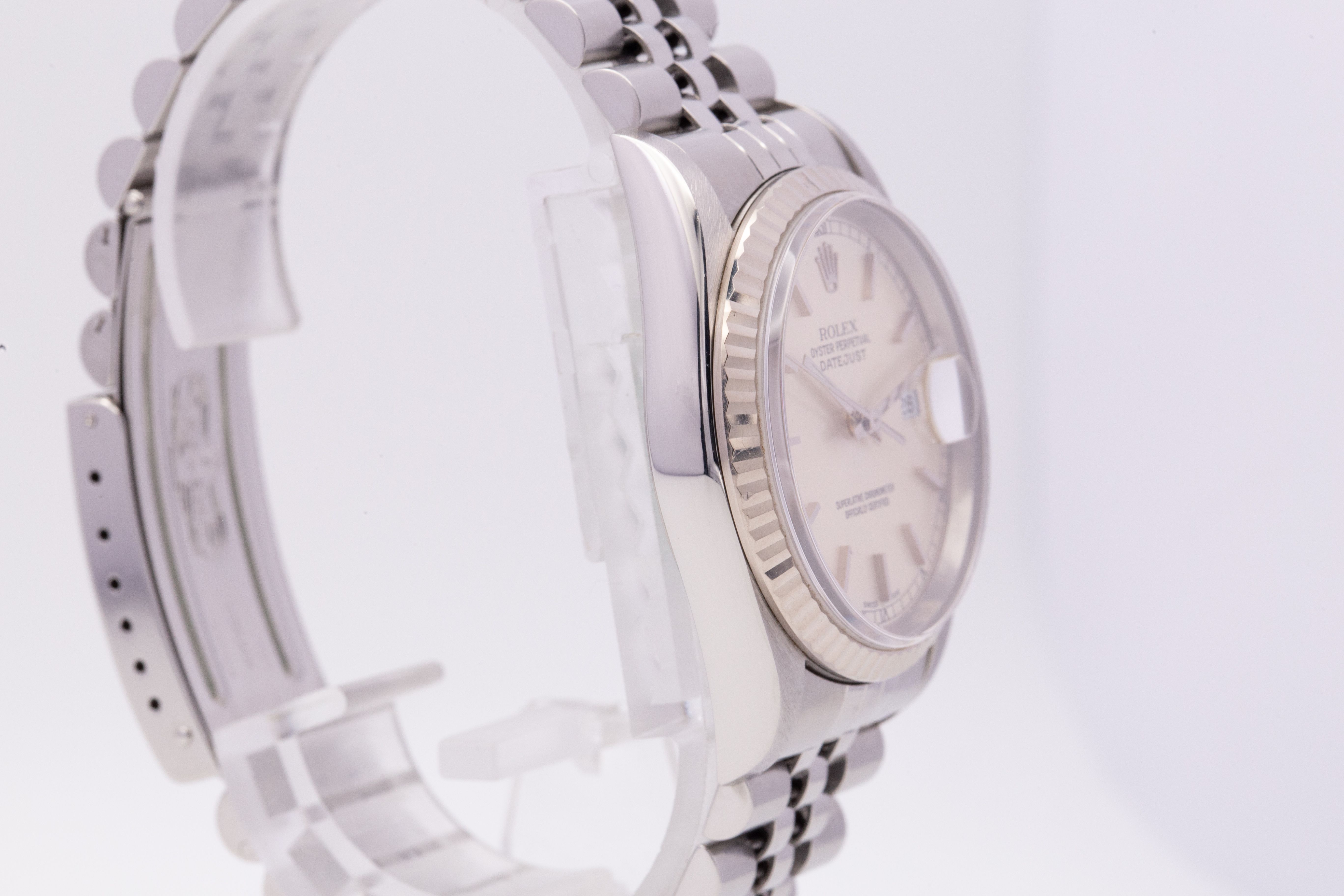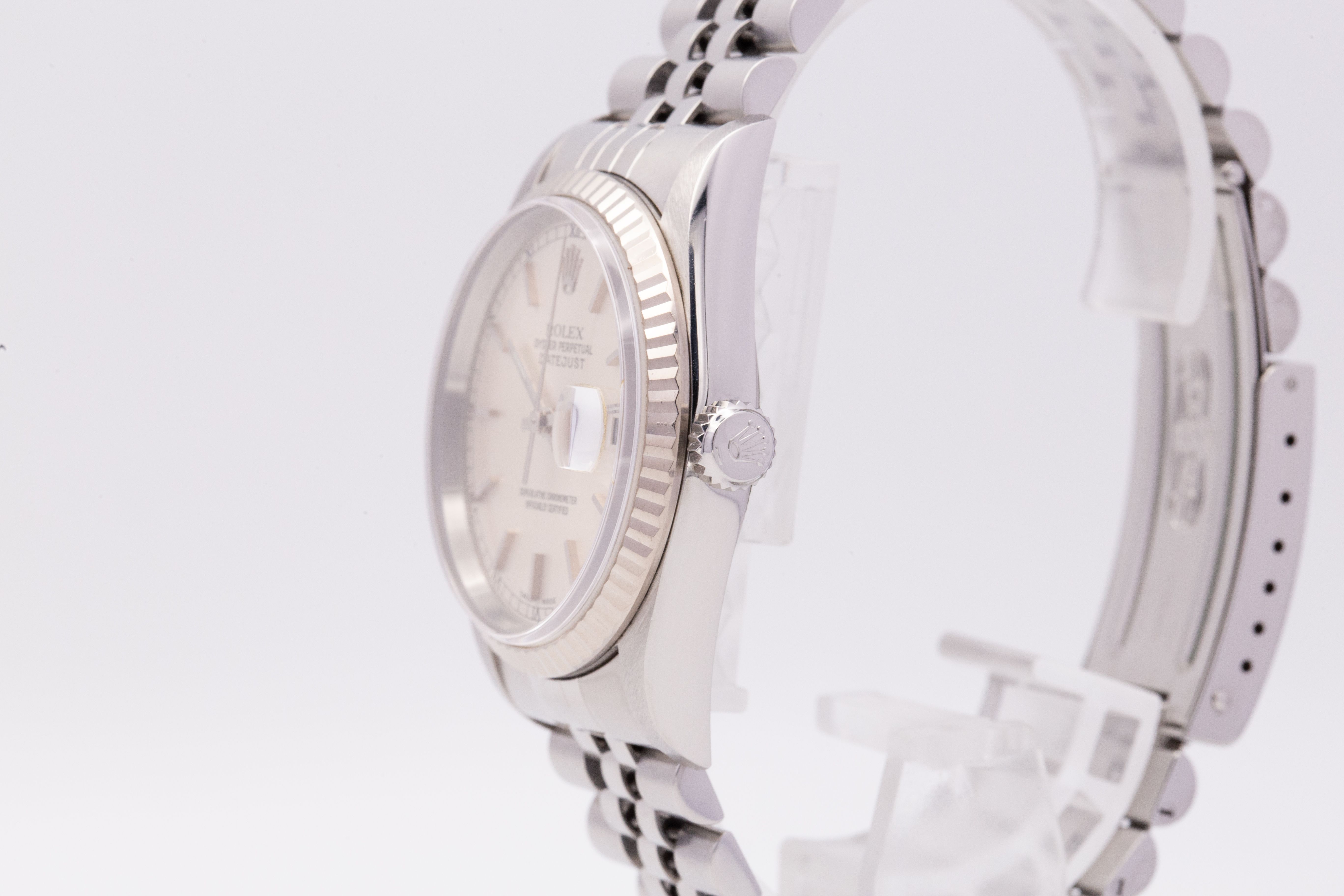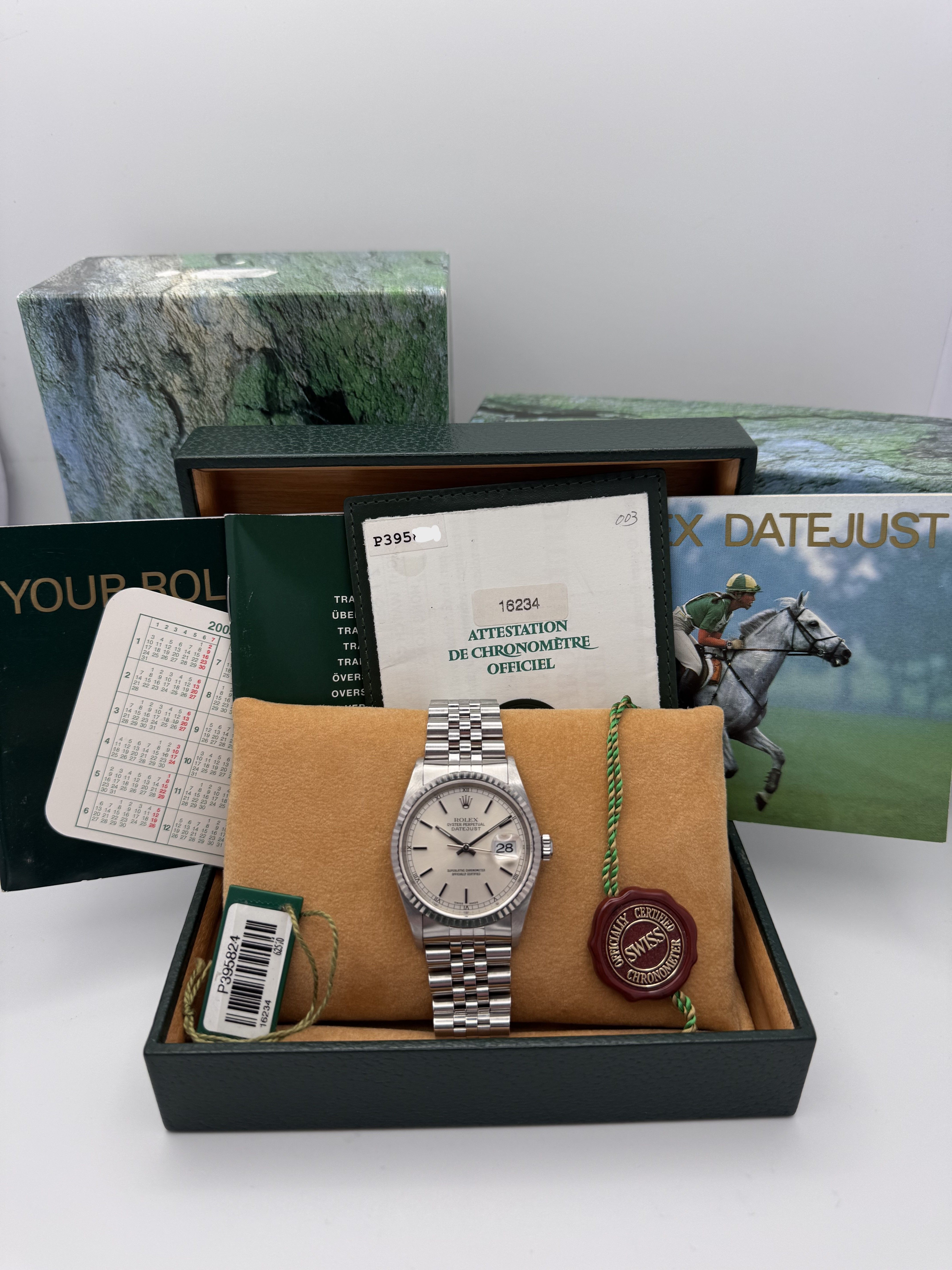 Te koop is een Rolex Datejust 36 Ref. 16234 uit het jaar 2000 in een volledige Full Set, met een zilveren wijzerplaat en No-Hole-Case, in uitzonderlijk goede staat.