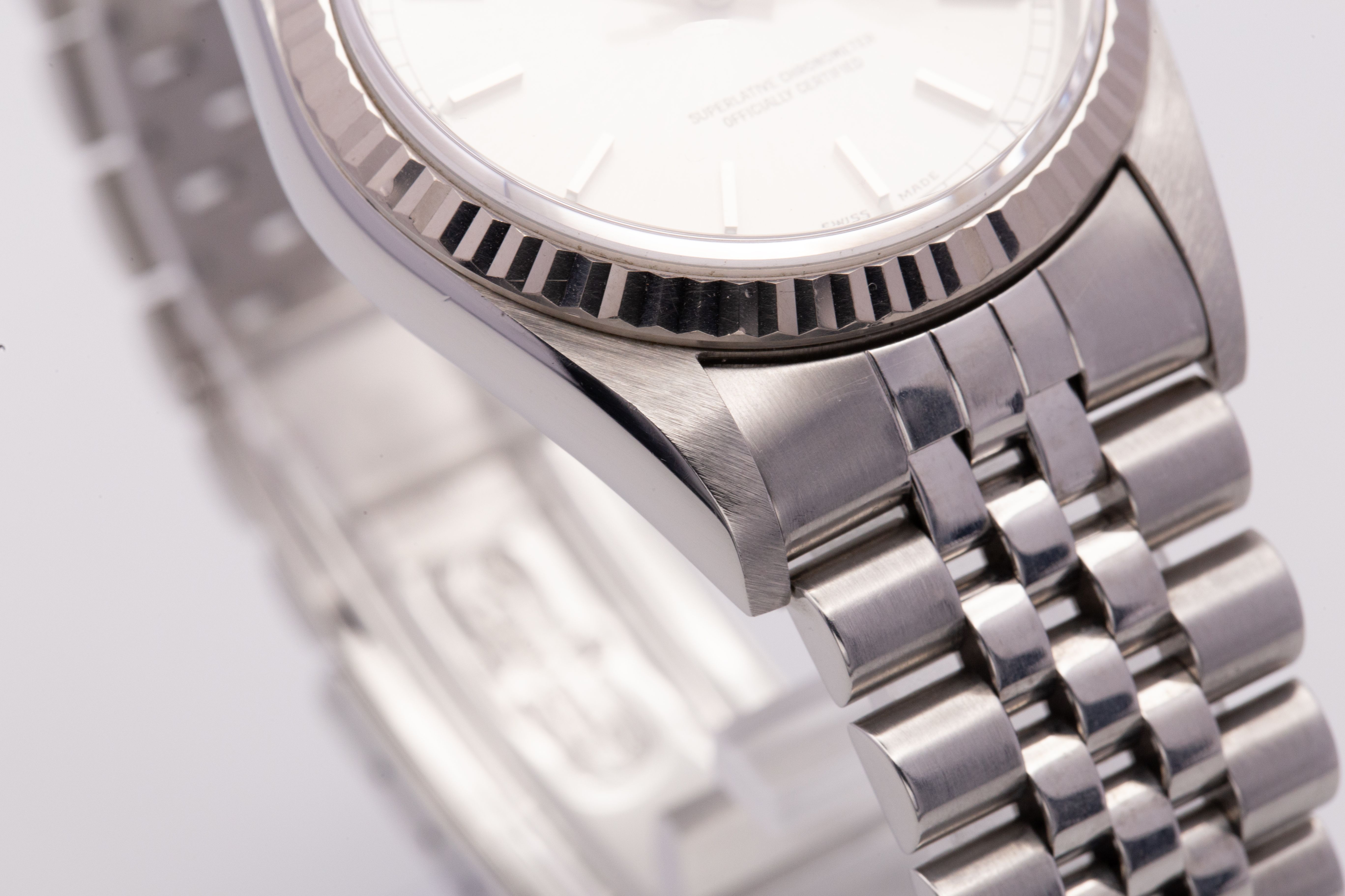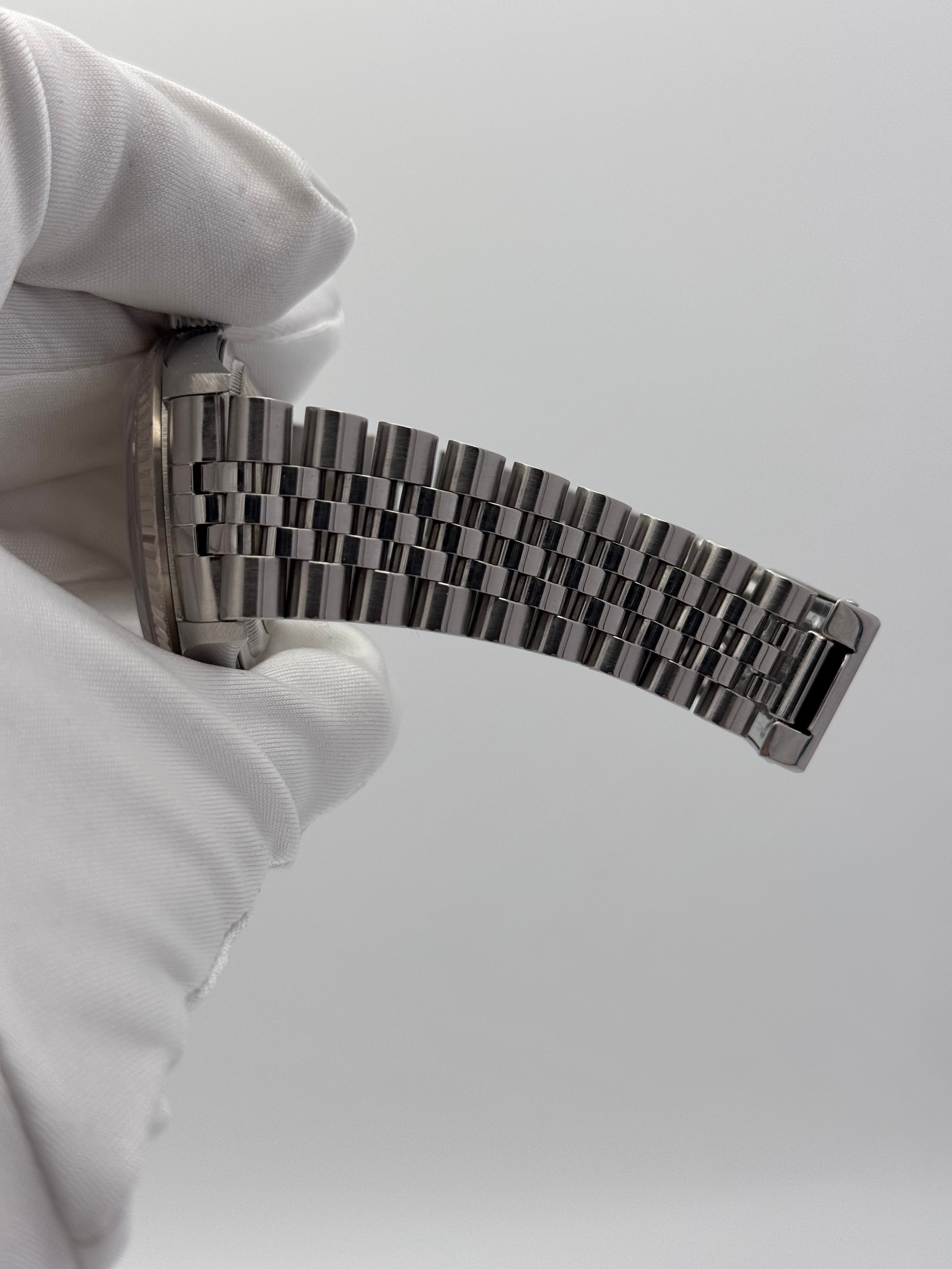 De Datejust 36 van Rolex is een tijdloze klassieker en combineert sportieve elegantie met hoge geschiktheid voor dagelijks gebruik. Dit exemplaar heeft al een No-Hole-Case, waardoor de zijboringen ontbreken en de klok moderner en kwalitatief hoogwaardiger oogt. In combinatie met de zilveren wijzerplaat en de geribbelde witgouden lunette ontstaat een bijzonder harmonisch en klassiek totaalbeeld.