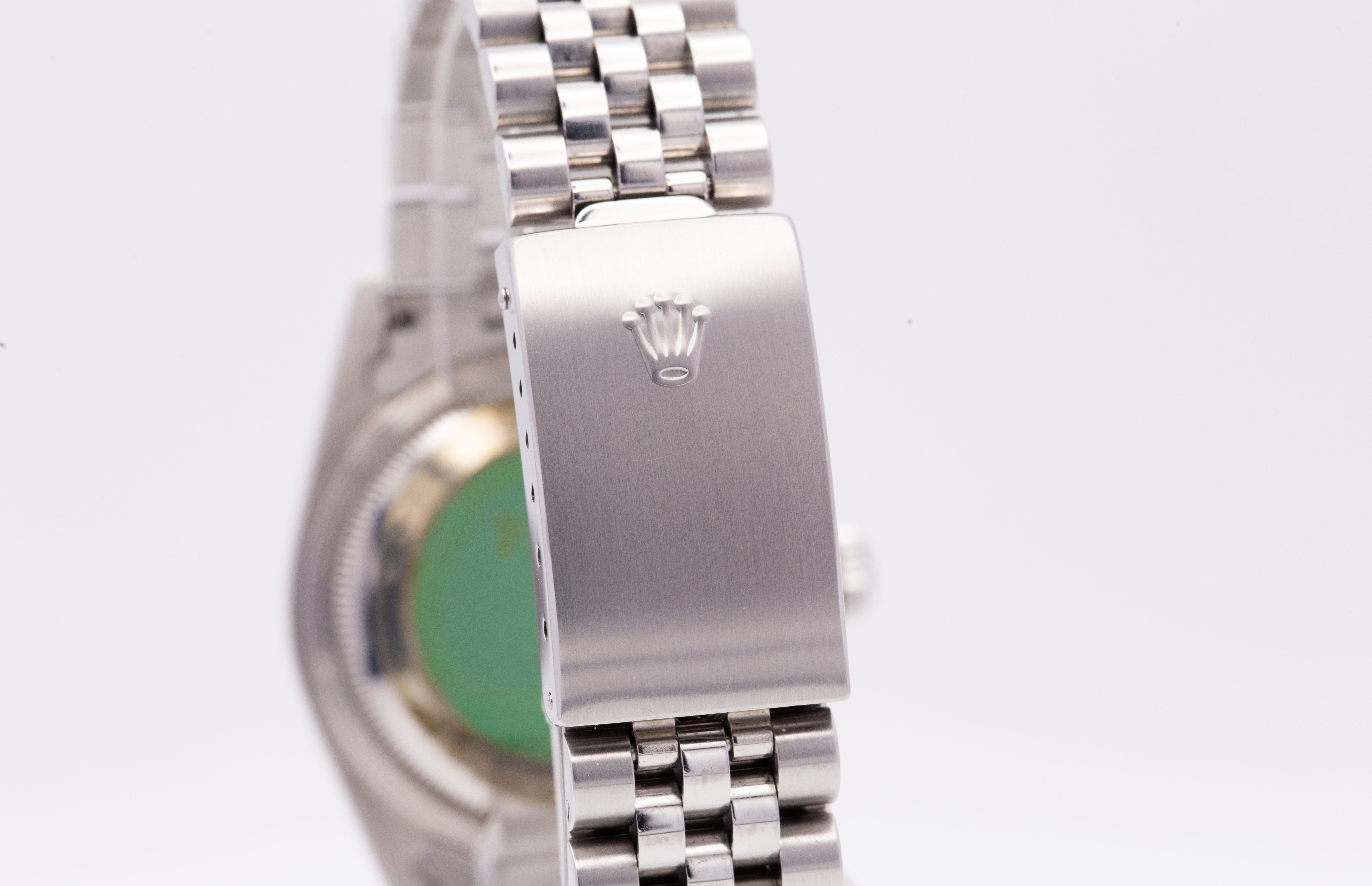 De Jubilee-band met referentie 62510H en de juiste 555B eindlinks verkeert ook in topstaat. De sluiting heeft een zeer uitgesproken Rolex-kroon en nog aanwezige scherpe facetten – details die in deze staat zeldzaam zijn.