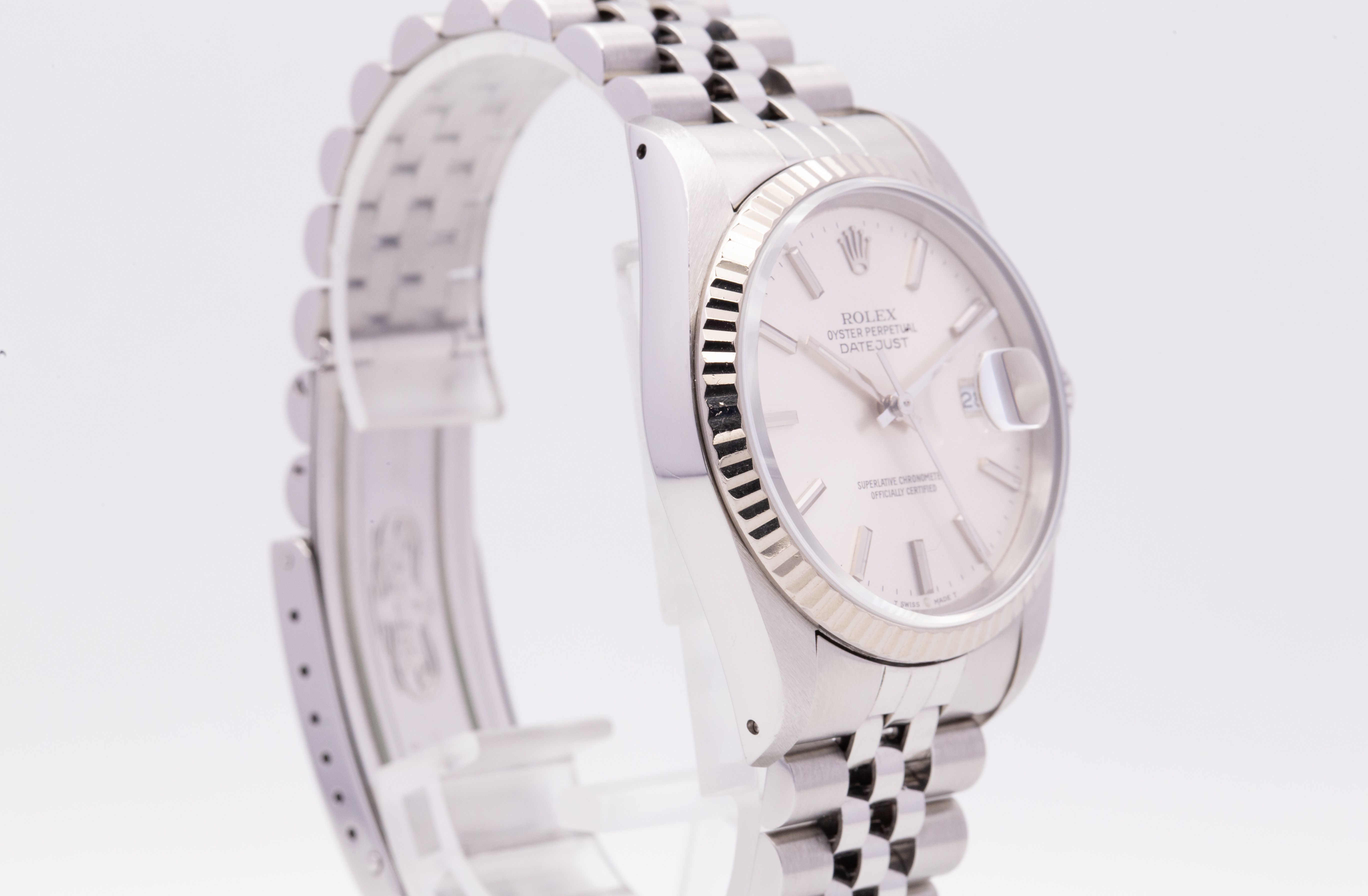 Te koop is een Rolex Datejust 36 Ref. 16234 met een zilveren wijzerplaat uit de E-serie (ca. 1990) in zeer goede staat.