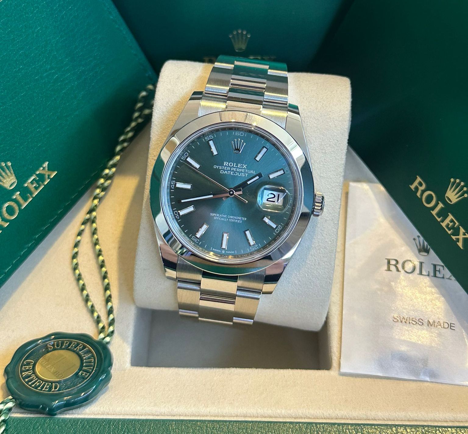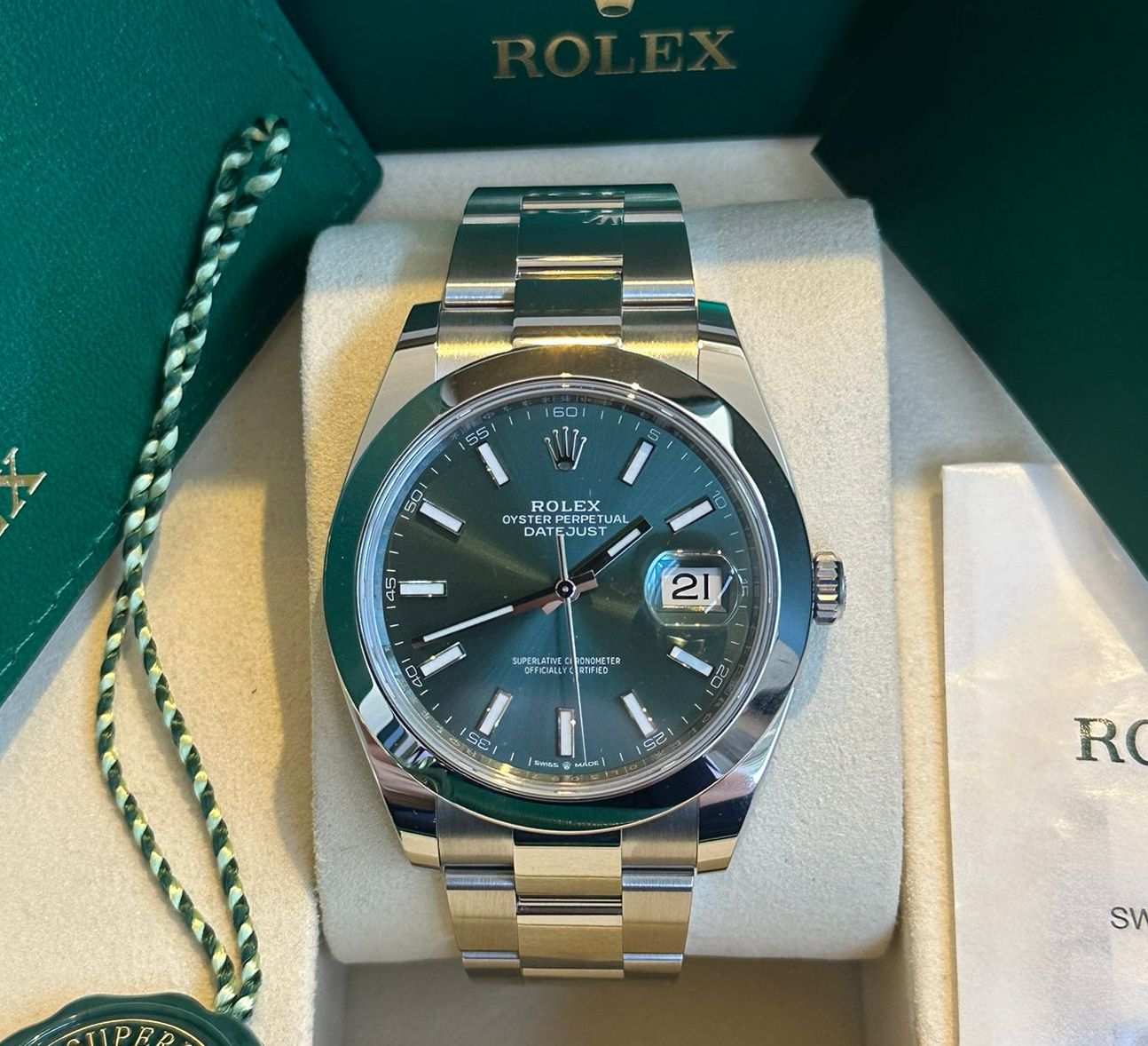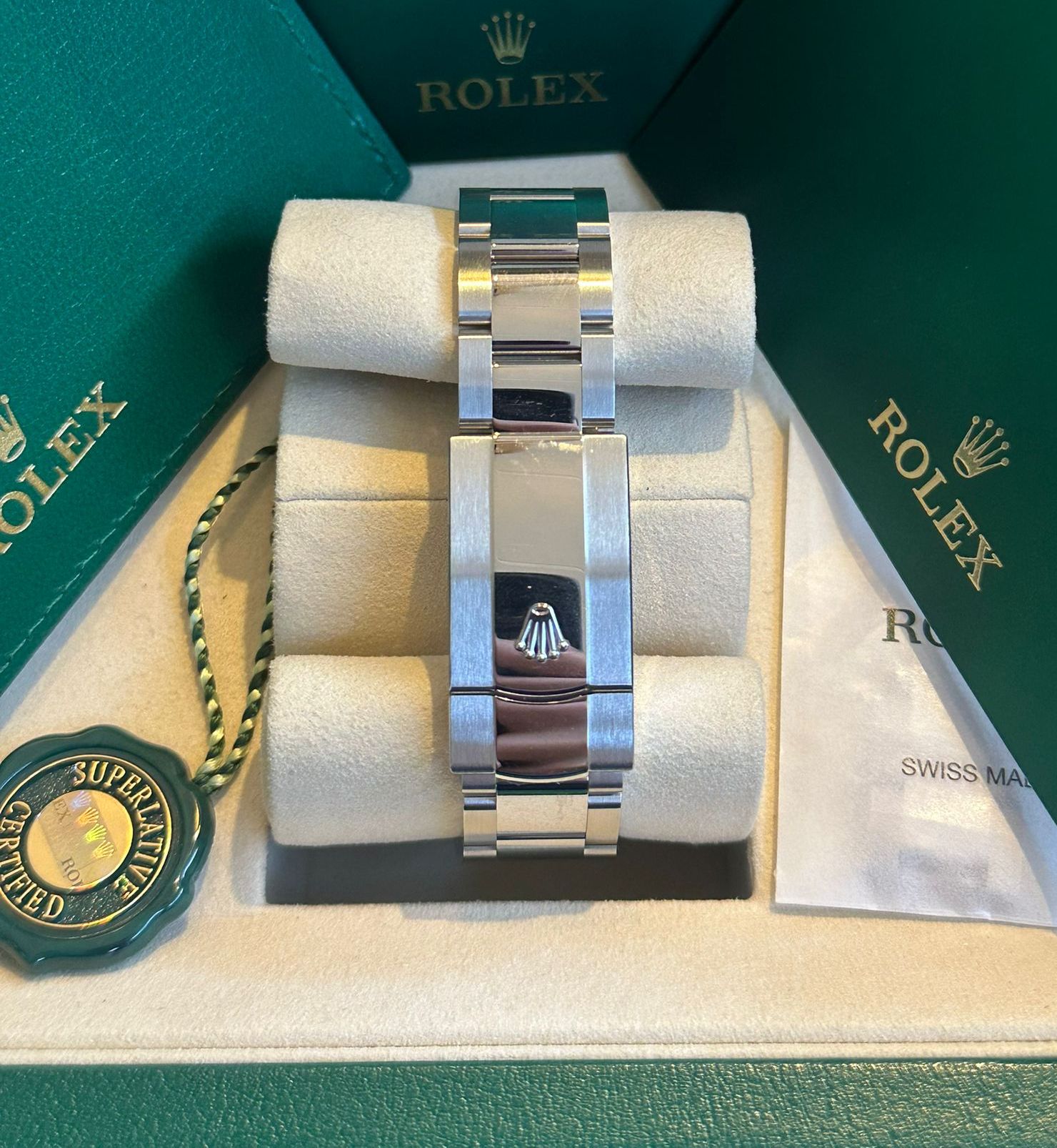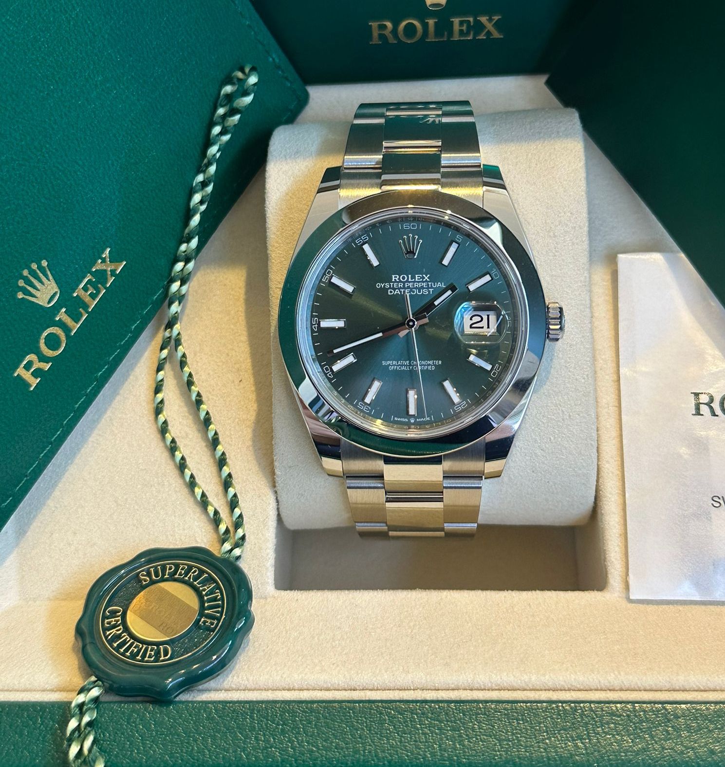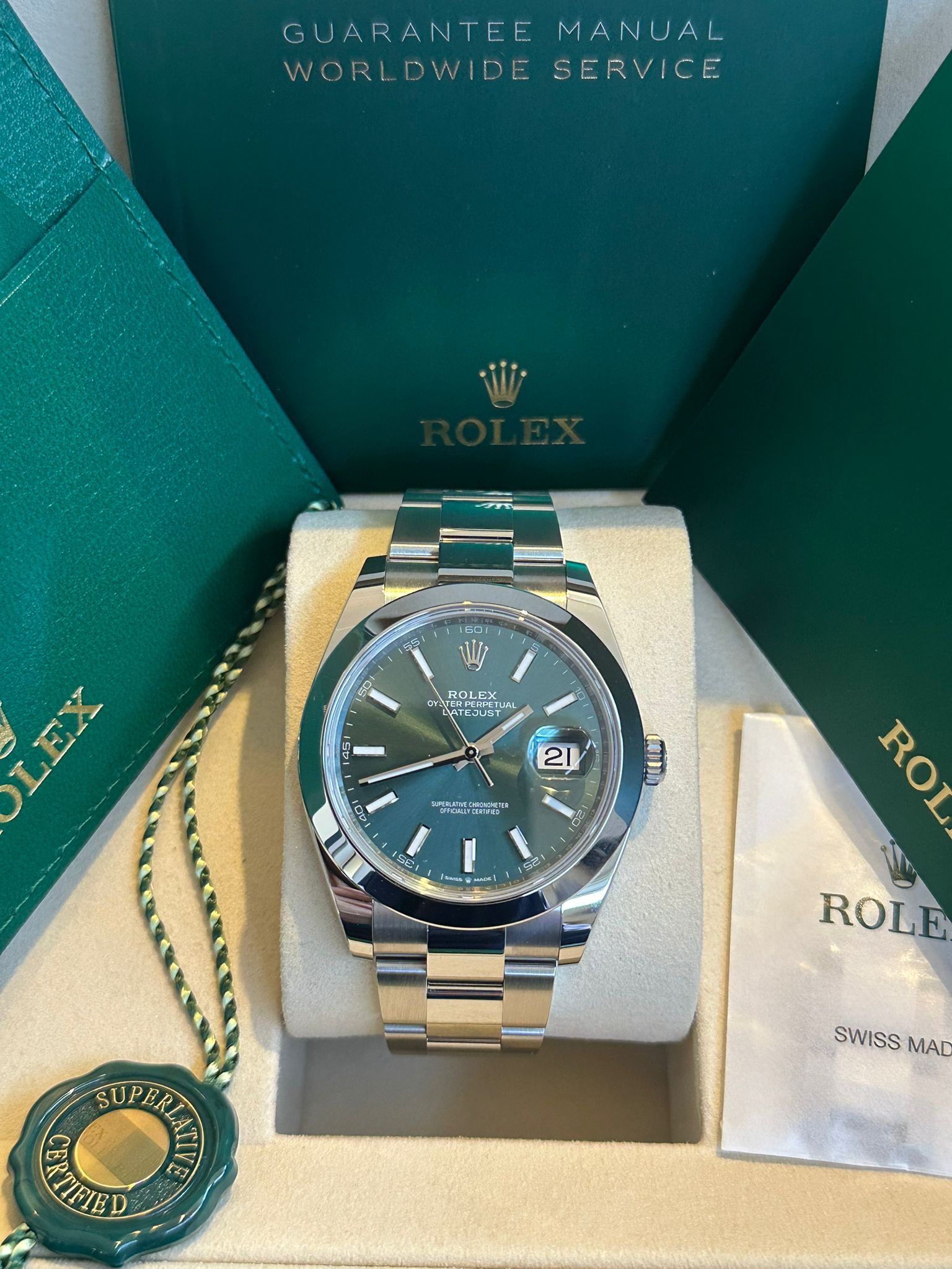 Het horloge wordt geleverd als full set, inclusief originele Rolex box, garantiepapieren, boekjes en alle originele schakels. Een uitstekende kans om een Rolex Datejust 41 met groene wijzerplaat in topstaat te bemachtigen—een van de meest geliefde en veelzijdige uitvoeringen binnen de Rolex collectie.