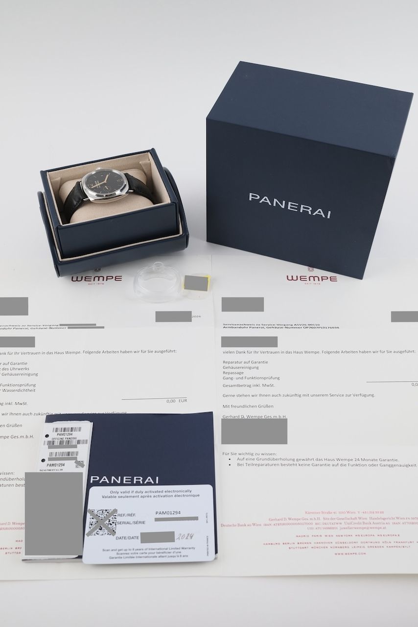 **Watch Description** Ready for your new dream watch? Perhaps this beautiful Panerai Radiomir Quaranta 40mm made of Steel will soon be on your wrist. Whether vintage or modern - with over 200 watches in stock, we always have your new luxury watch available for you immediately - whether you are a first-time buyer or your watch collection needs a new addition. **FACT CHECK - Everything you need to know:** - Movement checked for running behavior and no pending service. - If you like the watch in the pictures, you'll love it on your wrist. Our macro shots are unedited and show more than your eye can see. **SPECIFICATIONS AND SCOPE OF DELIVERY - This is how your new watch will arrive:** - Case diameter: 40mm - Wrist circumference: up to 20cm - Year of manufacture: 2024 - Case material: Steel - Strap material: Leather - Bracelet color: Black - Dial color: Black - Reference number: PAM01294 - Movement: Automatic - Original box included - Original papers - 12 months warranty - The complete scope of delivery can be seen in the pictures **QUALITY PROMISE** Every watch is checked for authenticity and function by our master watchmaker. So you get the all-round carefree package and an additional 12-month warranty! **INSPECTION AND SHIPPING** - Worldwide insured priority transport with tracking number. We deliver to watch lovers and collectors worldwide. Whether Asia, America, Australia or any other part of the world - the watch pictured can be on your wrist in just a few days. Within the EU even next-day. Alternatively, we would be happy to meet you at one of our 2 locations in southern Germany by prior arrangement: - Bavaria: THE BANK 94436 - Baden-Württemberg: THE LOFT 89073 - We also offer you a trade-in of your watch(es) to make the deal possible. - The purchase price is taxed according to §25 UStG. VAT is therefore not shown. - Prices include all taxes and fees for deliveries within the EU. There are no additional costs. **WatchId:** GID-256f-9d02