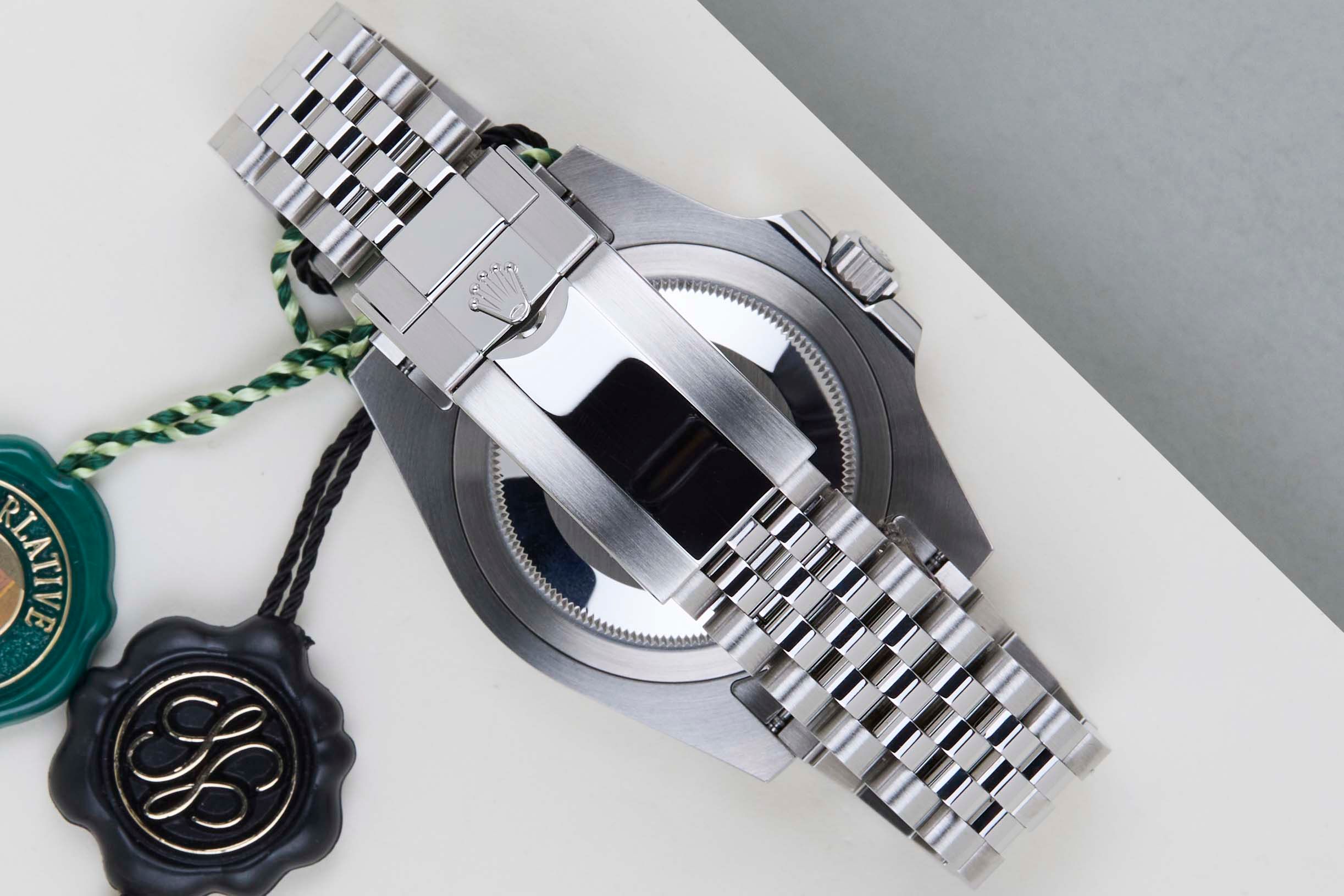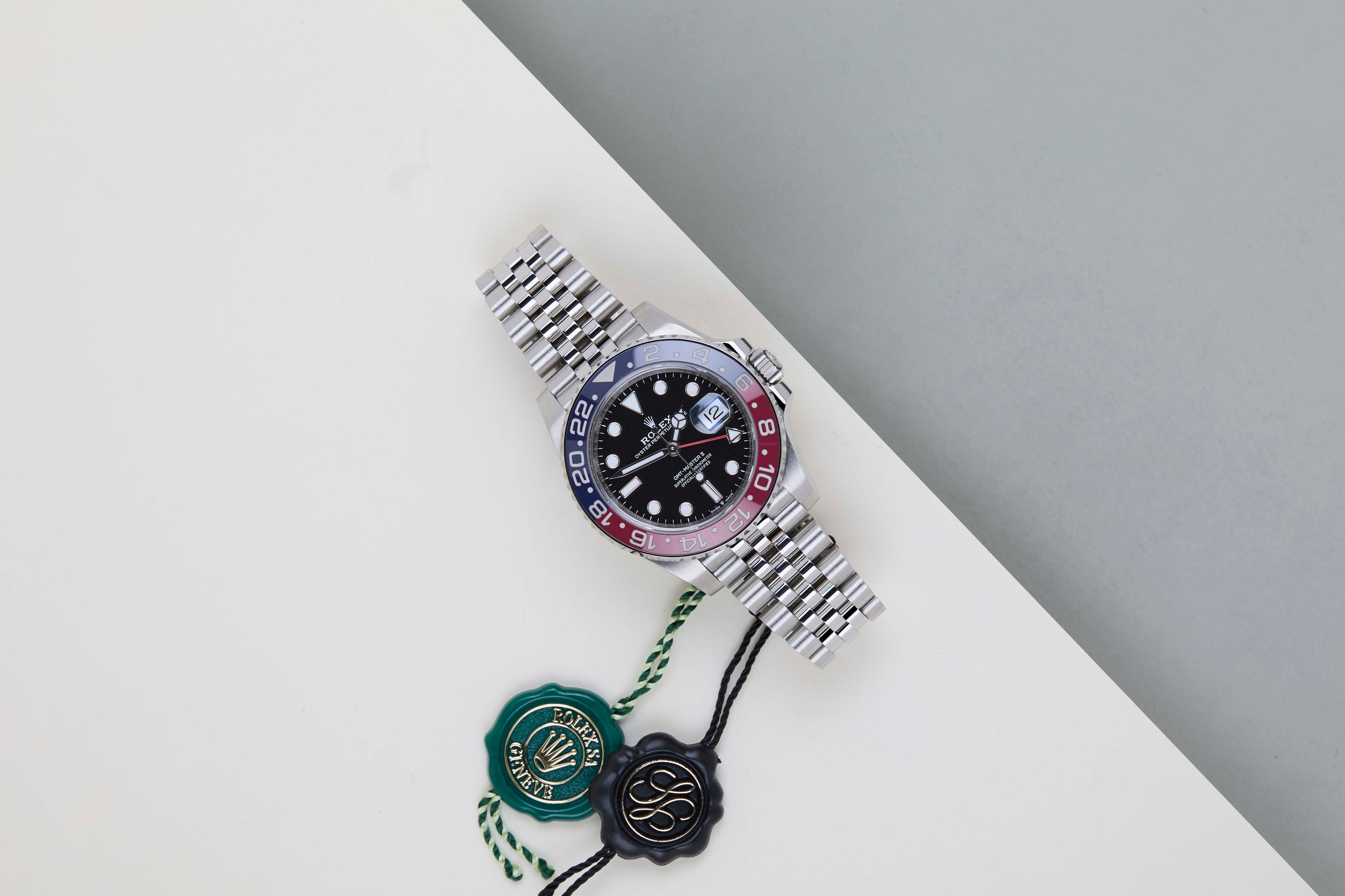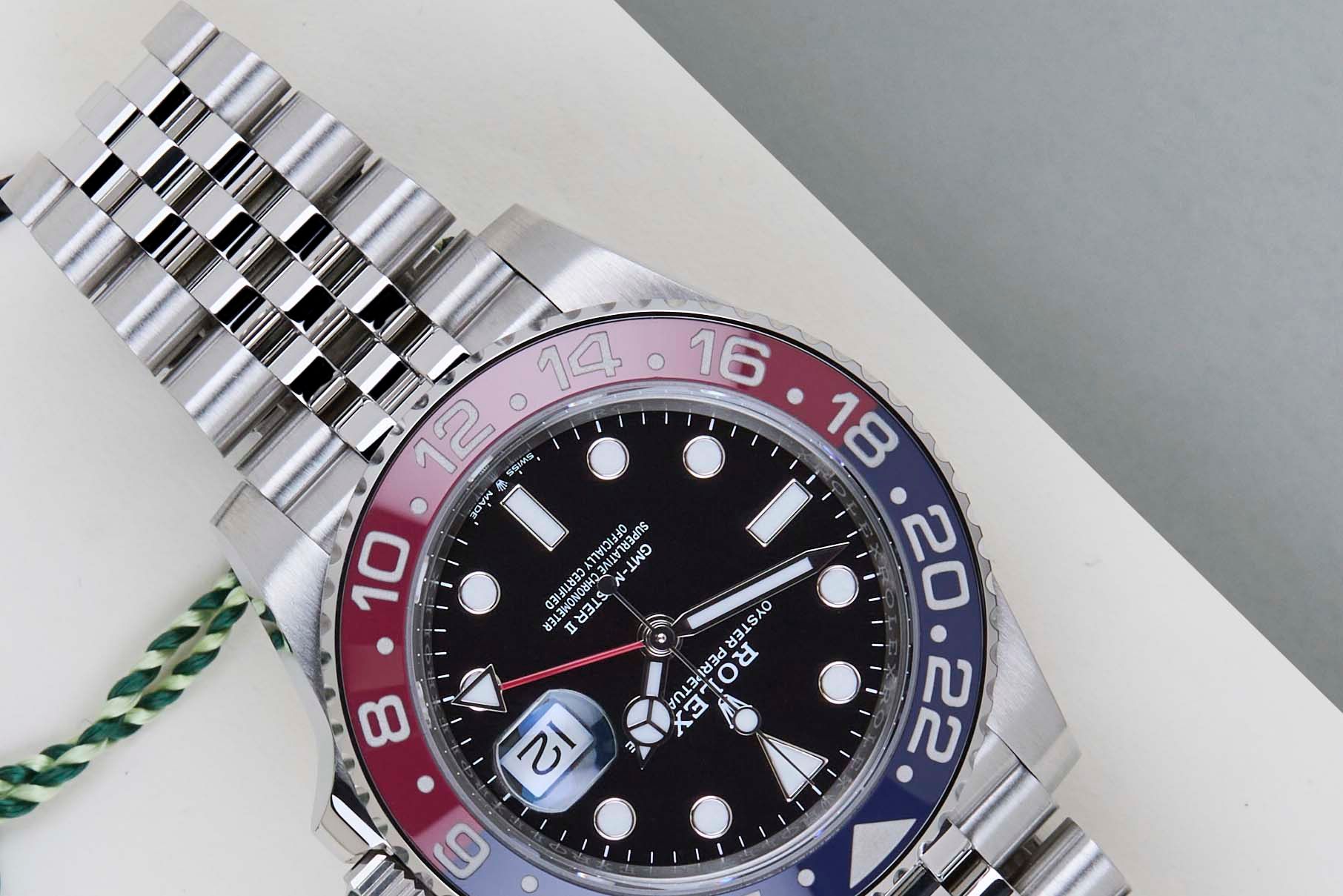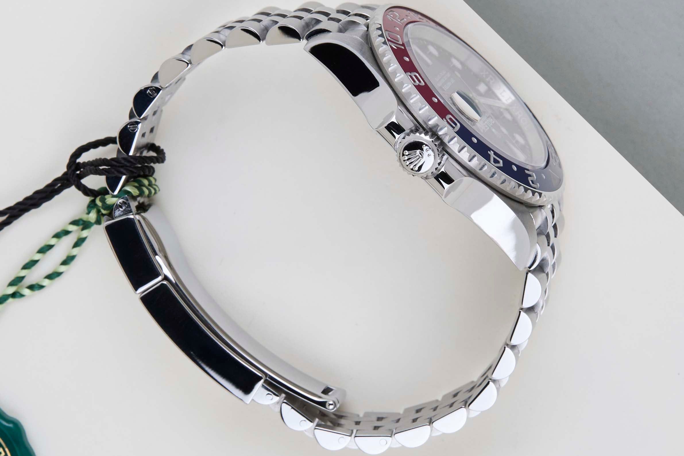 Deze GMT is uitgerust met de rode en blauwe bezel, die kan worden afgeleid van referentie 126710BLRO, Lunette Blue Rouge. Deze Rolex GMT-Master II 'Pepsi - Jubilee' werd voor het eerst verkocht in september 2018.
