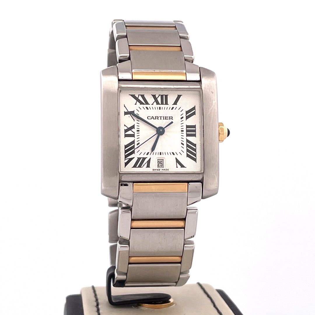 Cartier Tank Française Automatic Gouden/Staal Armband Witte Wijzerplaat 28MM B&P 2012. Wij garanderen dat al onze horloges ongedragen (tenzij anders aangegeven), authentiek, met alle originele documenten en verpakking zijn zoals afgebeeld. We geven 2 jaar garantie op gloednieuwe horloges en 1 jaar garantie op tweedehands horloges. De foto's die je ziet zijn foto's van het echte horloge zonder bewerkingen/wijzigingen. Onze tweedehands horloges worden indien nodig gereviseerd en gepolijst. We bieden volledig verzekerde deur-tot-deur verzending wereldwijd, we gebruiken verzekerde FedEx express levering. De meeste Europese verzendingen worden de volgende dag bezorgd, bij andere kan het 2-3 dagen duren, afhankelijk van waar je je in Europa bevindt. Verzendingen naar de VS/Azië en andere overzeese landen kunnen tot 7 dagen duren.