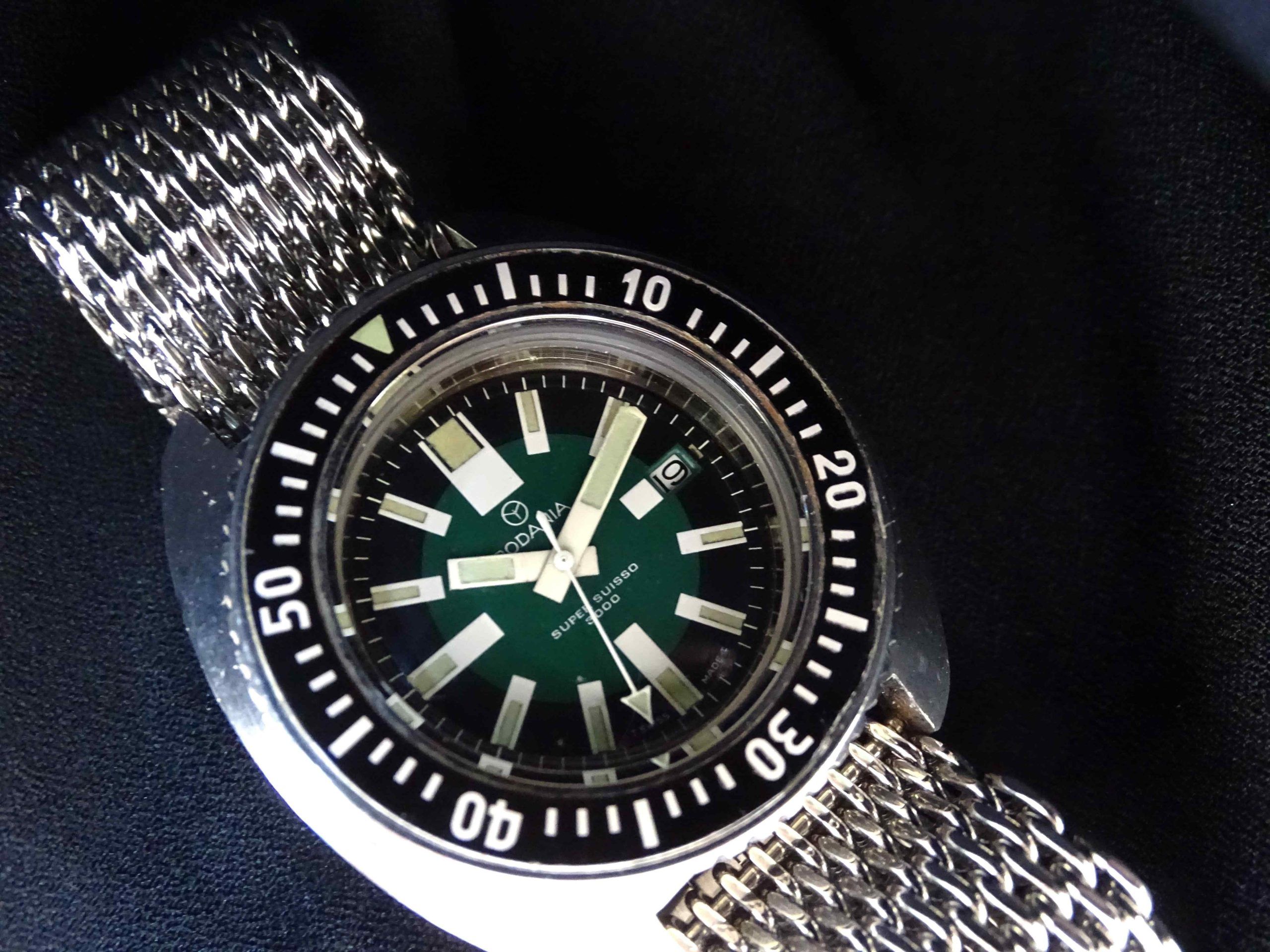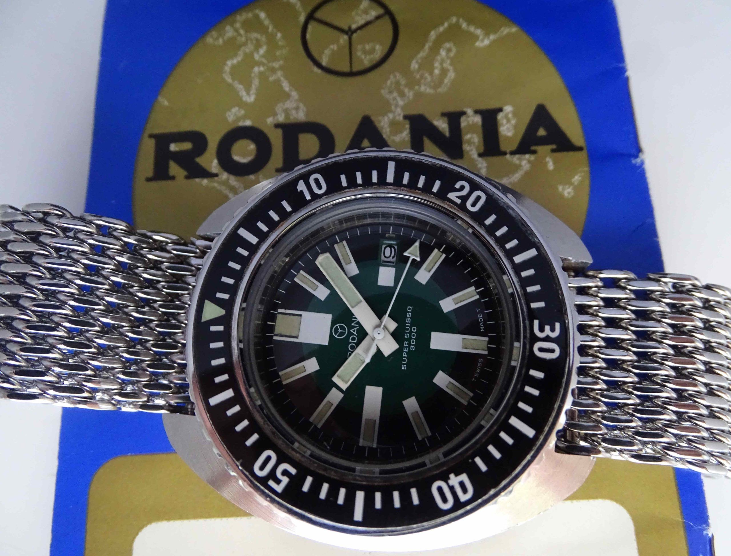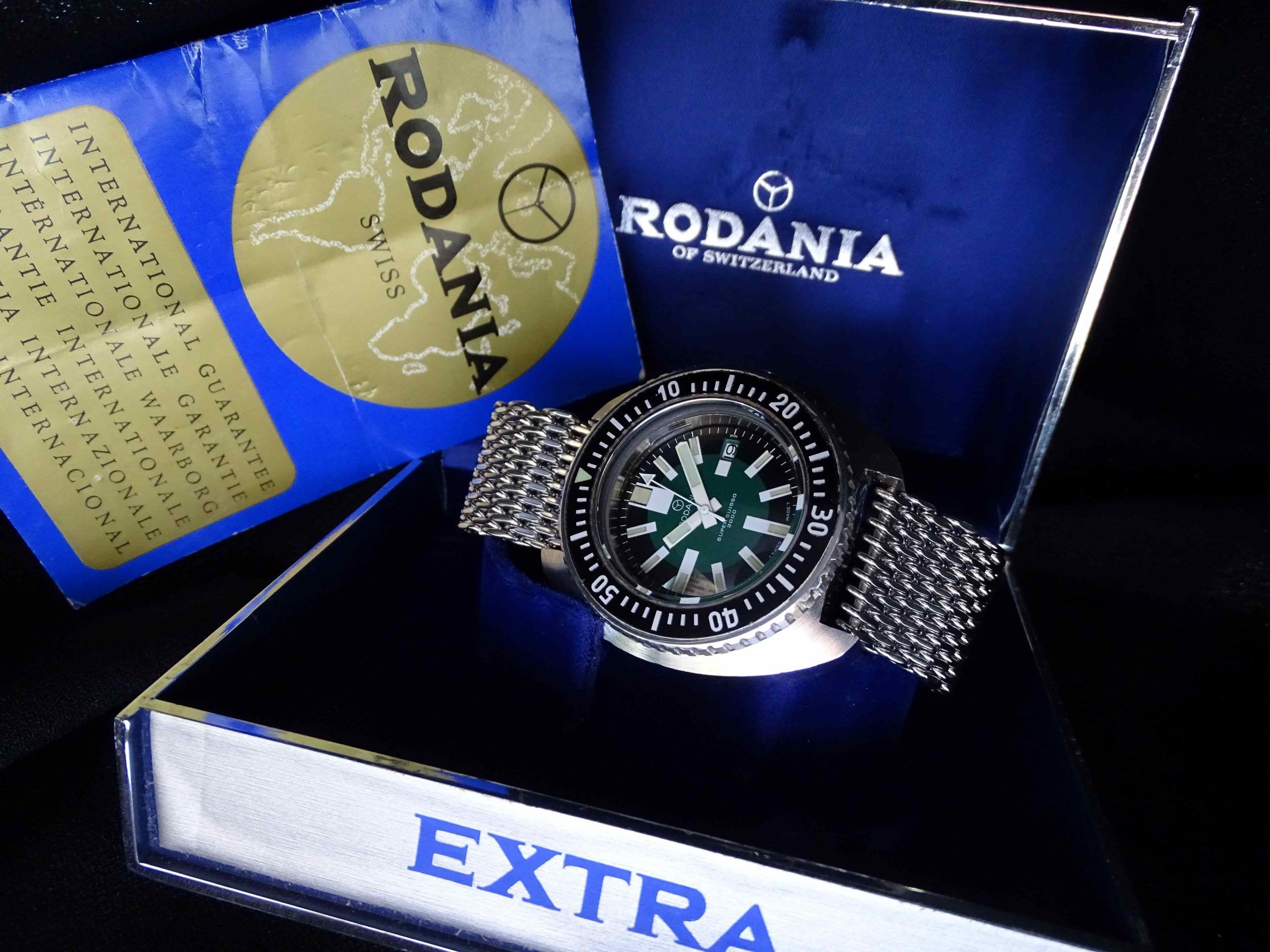 Bijna niet te geloven dat we deze uiterst zeldzame Rodania Suuisso 3000 hebben weten te bemachtigen, een professioneel 100 ATM duikershorloge en bovendien in een bijzonder mooie originele staat met de doos en het garantiebewijs uit 1974.