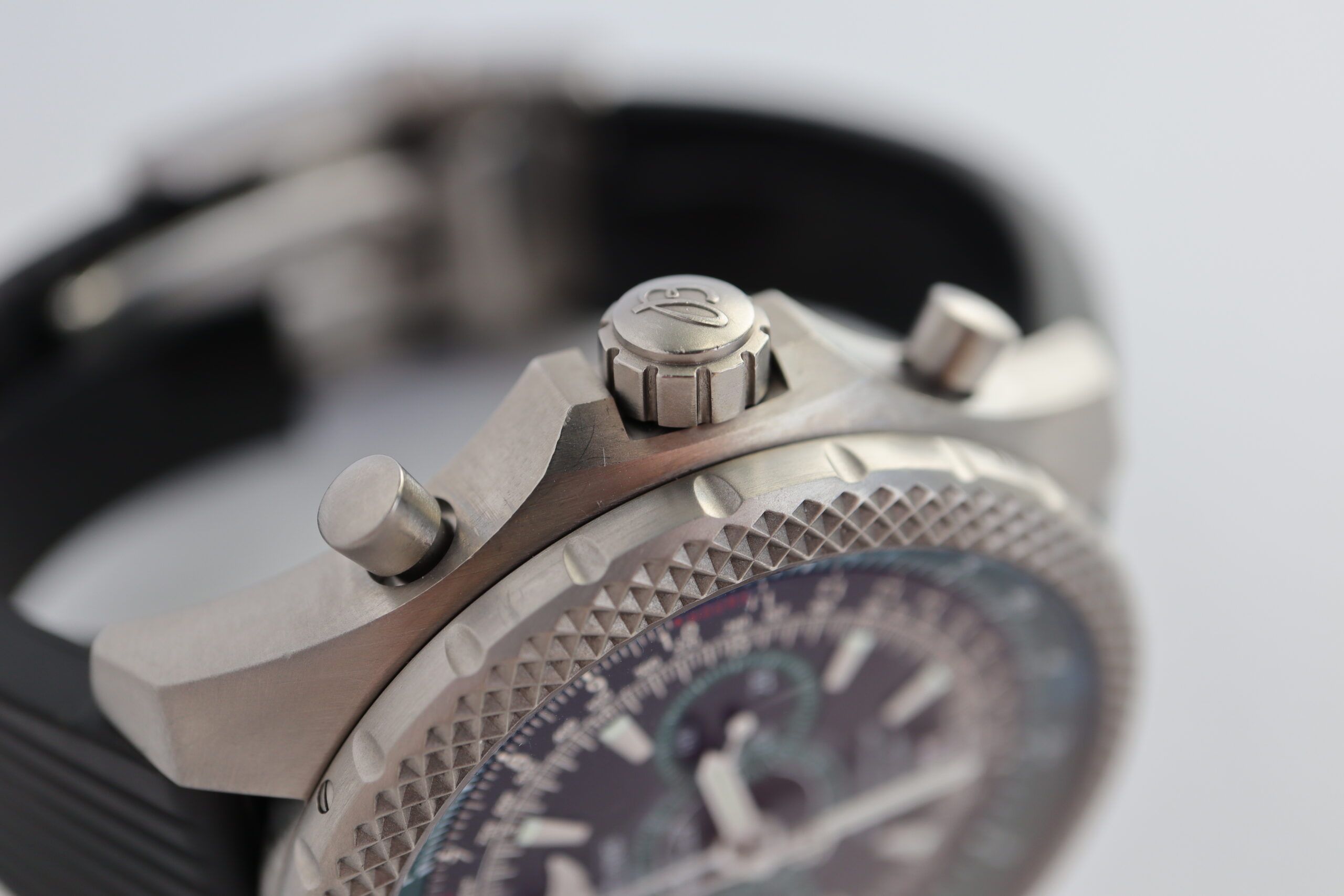 The mens Breitling for Bentley Supersports Lightbody ref. E27365 combines two powerhouse luxury brands into one spectacular watch - Breitling and Bentley. The "Lightbody" ref. E27365 is constructed out of lightweight Titanium and wears on a supple rubber bracelet, creating a lighter hold on the wrist than a stainless steel watch of the same size. It also features a robust 49mm case and will make a bold impression on the wrist. Other iconic features include classic chronograph side pushers, coordinating registers on the dial, and Breitling's iconic textured bezel.