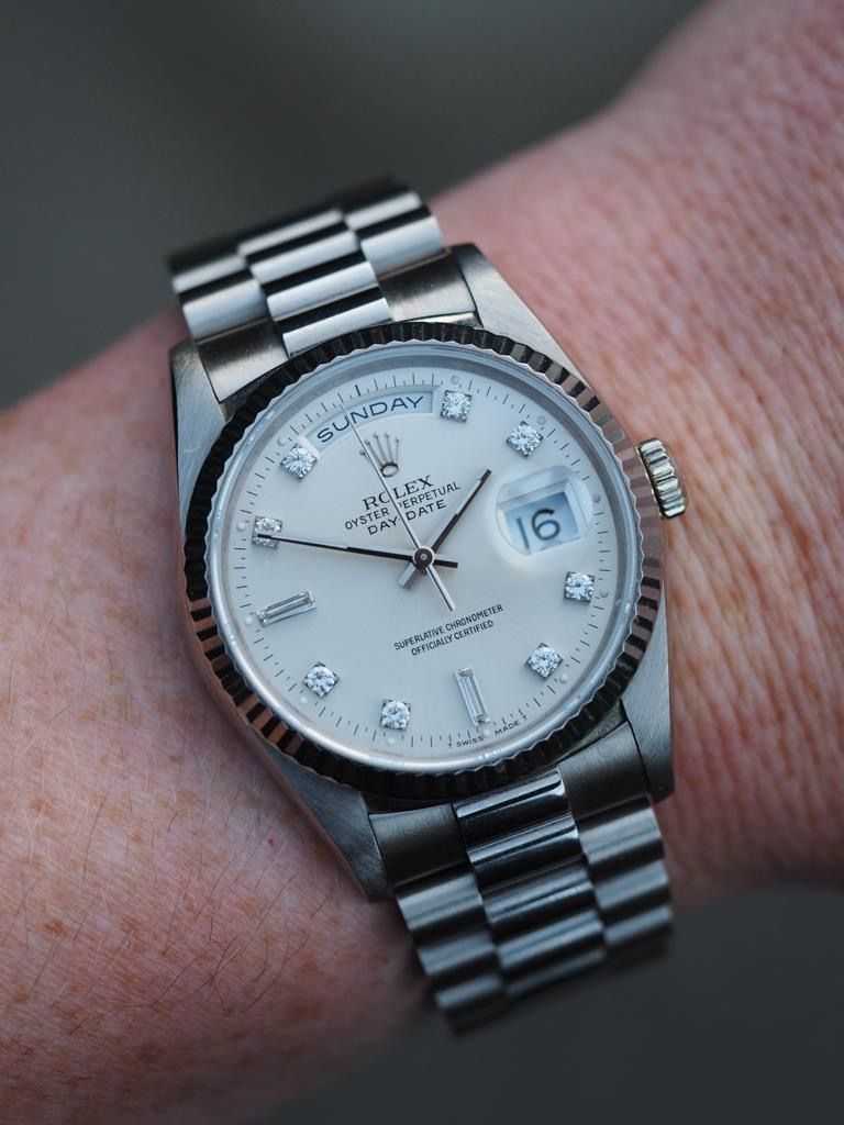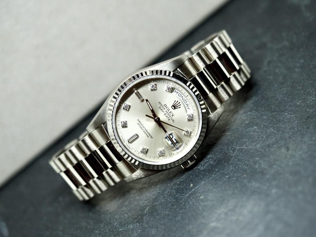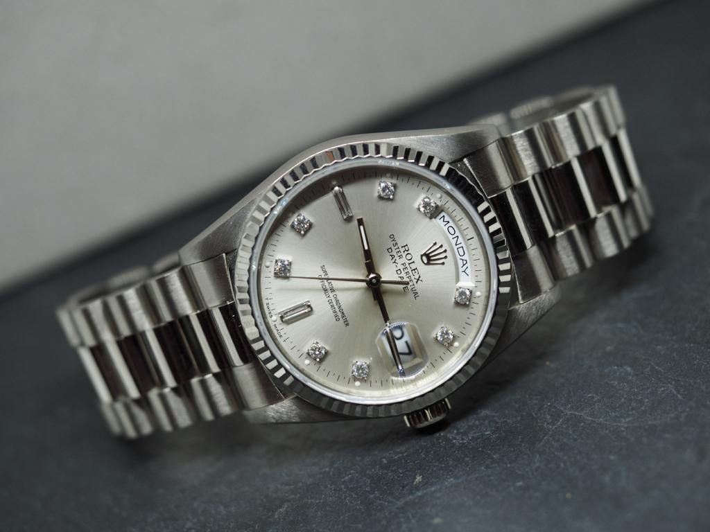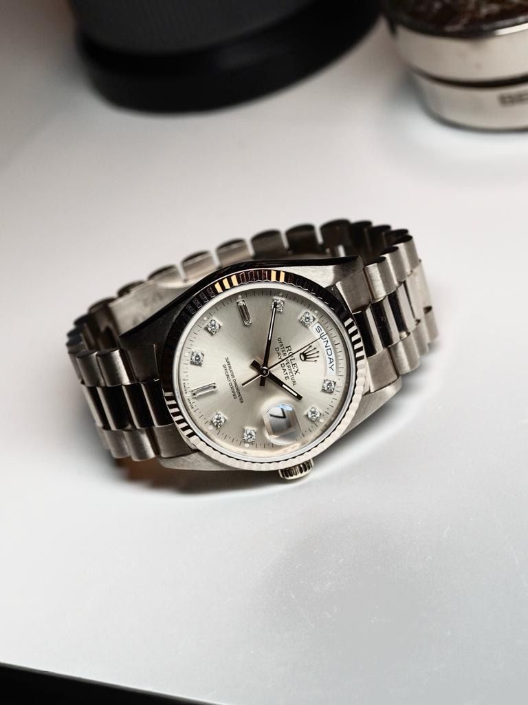 Tempus Horloge service Tempus is een bekend merk in Europa als het gaat om vintage Rolex reparatie en officieel Cartier servicecentrum. Tempus staat voor kwaliteit en service. De expertise van ons team helpt de klant bij de aankoop of verkoop van een horloge. Hieronder kun je lezen wat de voordelen zijn als je direct bij Tempus koopt.Waarom direct bij de horlogemaker kopen? -Elk horloge wordt door Tempus voorzien van een volledige service -3 jaar garantie op goed lopen-elk jaar welkom voor een gratis waterdichtheid / pakkingen test -Professioneel gepolijst door Tempus.Over het horloge:Merk: Rolex Model:18239 Dag Datum Beweging: 3155 perfecte staat en volledig geserviced Kast: Uitstekende staat en mooi gepolijst Wijzerplaat: Zilveren zeldzame Platina diamanten wijzerplaat. ( grotere diamant) Armband: Originele armband in goede staat. 3 schroefschakels Accessoires:, Tempus garantiekaart Heb je vragen over dit prachtige horloge, aarzel dan niet om contact op te nemen. Inruil en verkoop van je horloge is ook mogelijk.