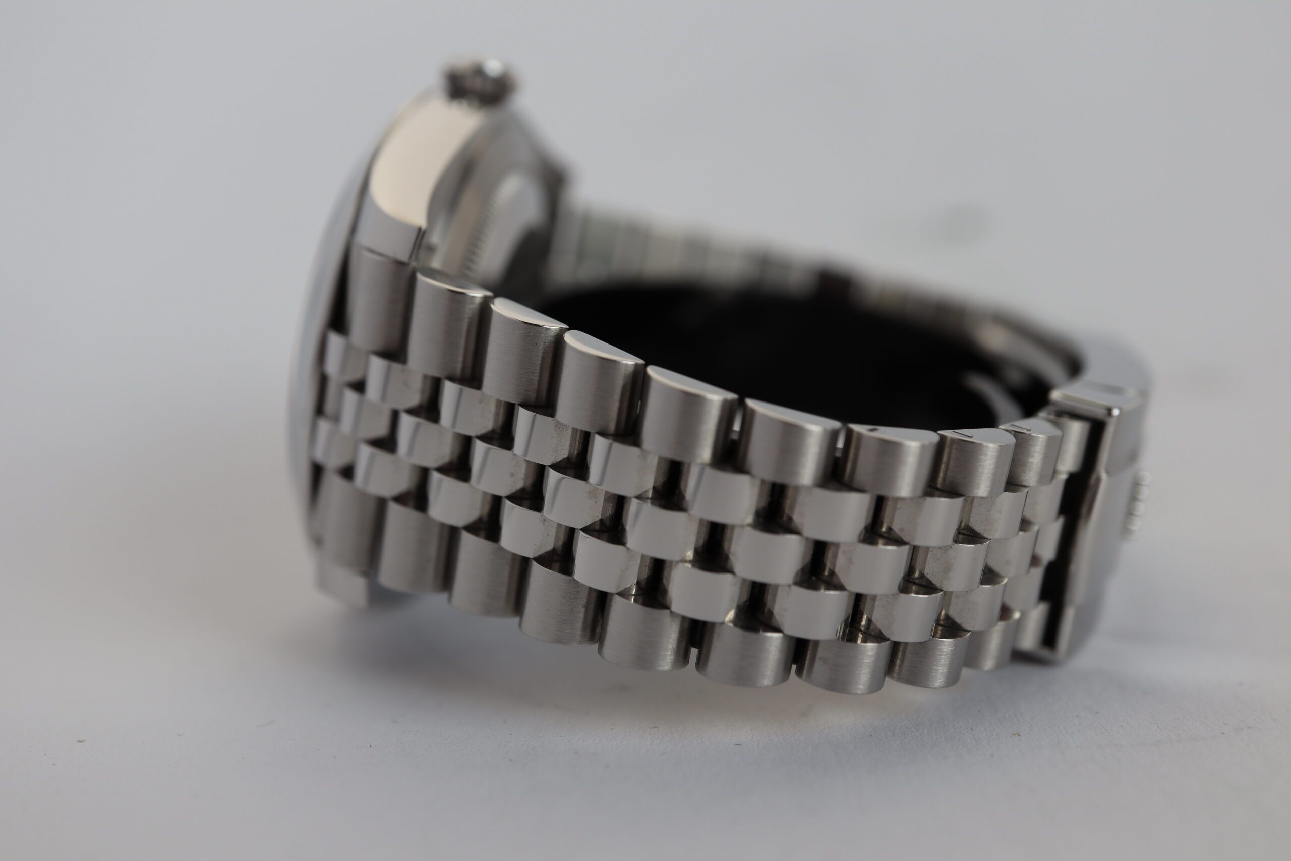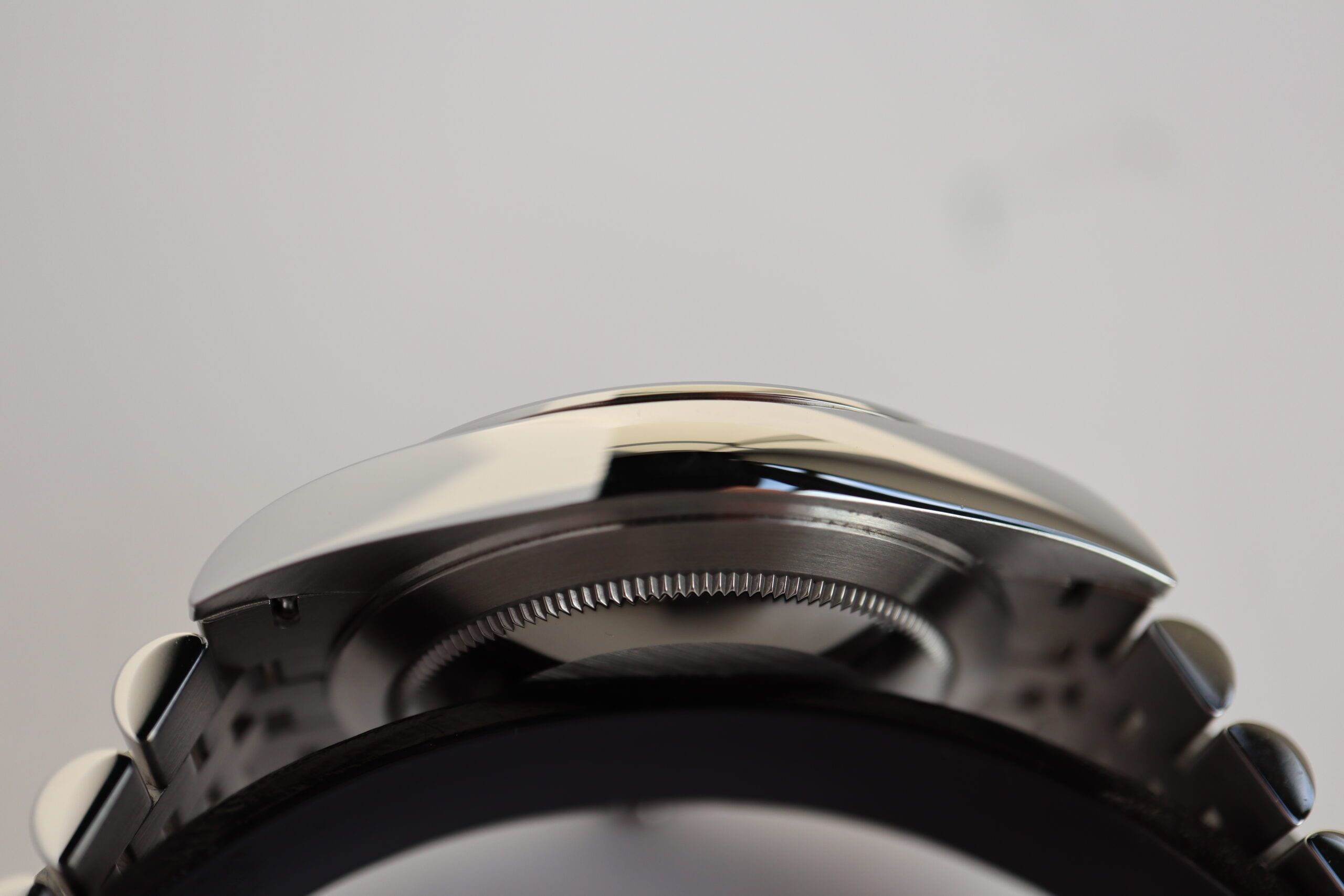 This Oyster Perpetual Datejust 41 in Oystersteel and white gold features an azzurro-blue dial and a Jubilee braceletThe sunray finish creates delicate light reflections on many dials in the Oyster Perpetual collection. It is obtained using masterful brushing techniques that create grooves running outwards from the centre of the dial.