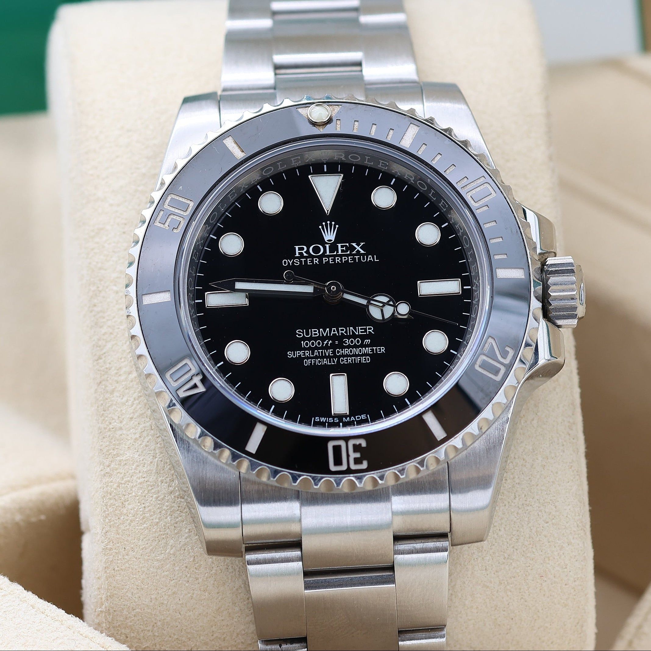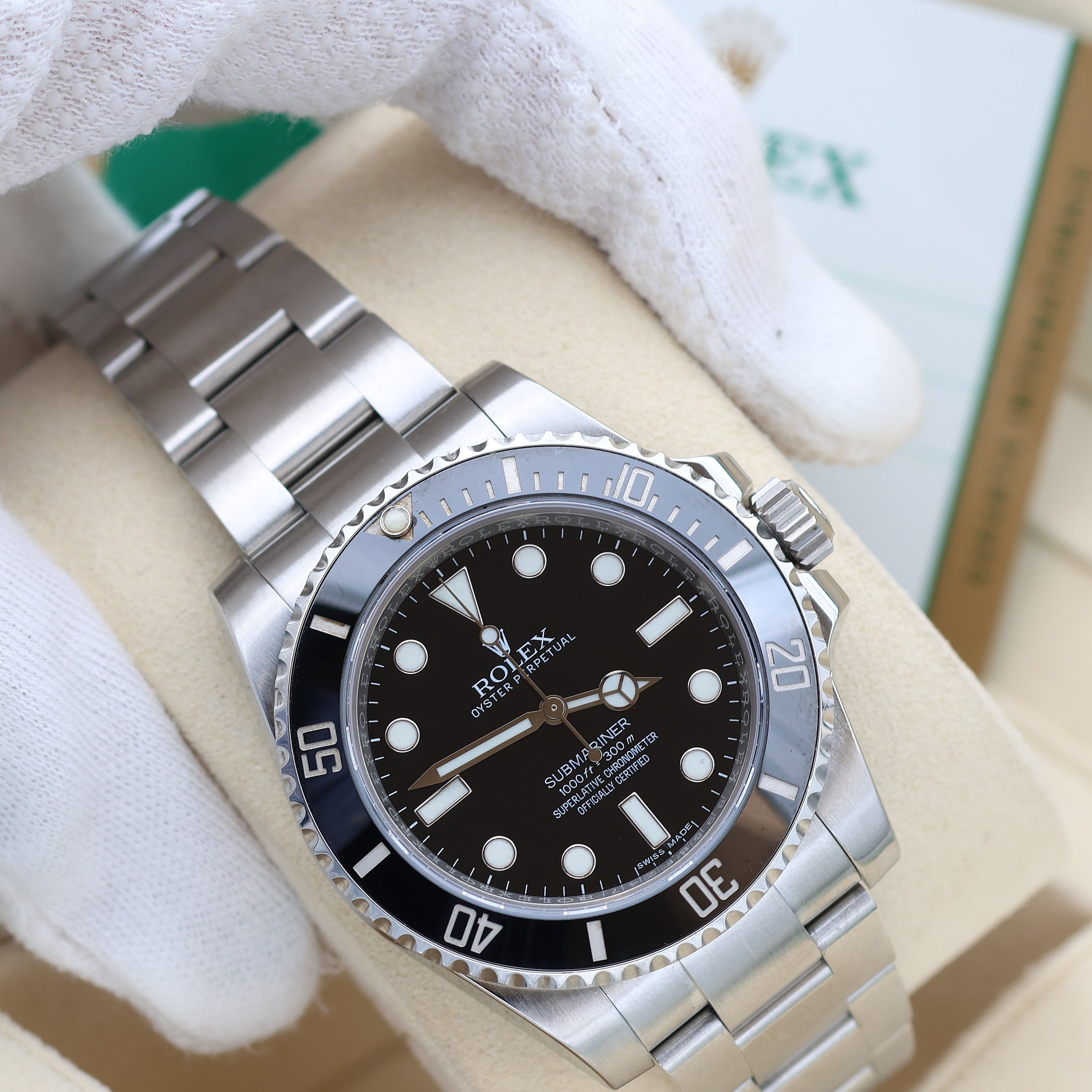 For sale at Debonar Watches: pre-owned Rolex Submariner 114060 No Date, with original papers and box.The perfect watch for whom prefers the original Submariner design for its clean, symmetrical and dateless dial. The 904L stainless steel case is 40mm in diameter, 48mm lug to lug across the wrist (without including the fixed end links of the bracelet), and 12.5mm thick. The case is predominantly satin finished on its front, with the case sides mirror polished. The Rolex Submariner 114060 introduced a uni-directional Cerachrom bezel to the Submariner. BRAND ROLEX MODEL SUBMARINER REFERENCE 114060 CASE MATERIAL STEEL MOVEMENT AUTOMATIC DIMENSION 40 MM DIAL BLACK BEZEL STEEL CRYSTAL SAPPHIRE BRACELET TYPE BRACELET OYSTER 18 CM BRACELET MATERIAL STEEL ORIGINAL BOX YES ORIGINAL PAPERS YES YEAR 2010-15 CONDITION EXCELLENT