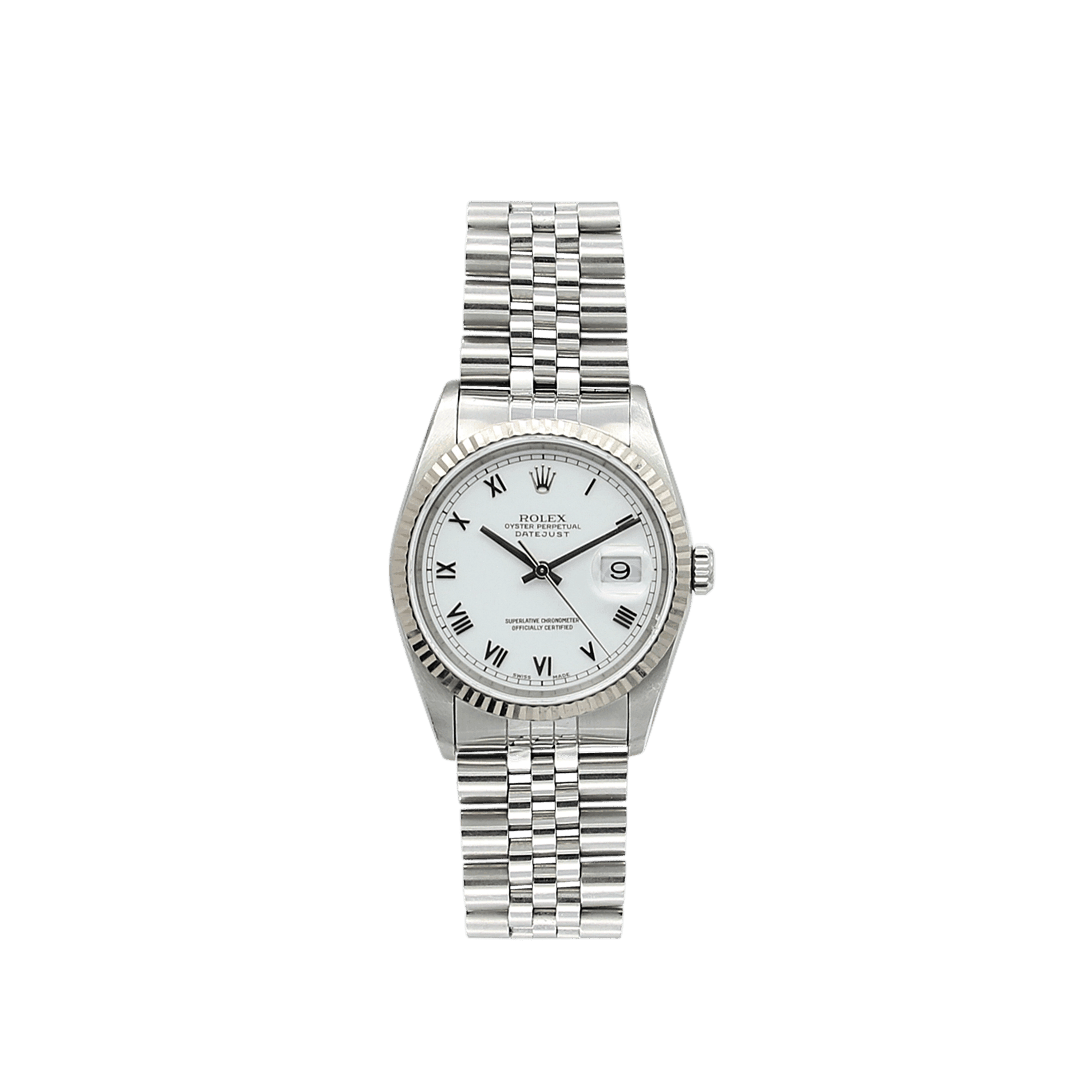 For sale at Debonar Watches: pre-owned Rolex Datejust ref. 16234, full set.This Rolex Datejust in steel presents a sophisticated white roman dial with small numbers, a white gold bezel and a coordinated jubilee bracelet.This 36 mm. diameter stainless steel case is set with screw-down case back and crown, a fluted white gold bezel, a sapphire crystal with cyclops lens.On the dial we find at 12 o'clock the words "ROLEX" - "OYSTER PERPETUAL" - "DATEJUST" and at 6 o'clock the classic writing "Superlative Chronometer Officially Certified". This Datejust's reference has been in production for a long time: you can find Datejust 16234 produced from the late 80s to mid-2000s. BRAND ROLEX MODEL DATEJUST REFERENCE 16234 CASE MATERIAL STEEL MOVEMENT AUTOMATIC DIMENSION 36 MM DIAL WHITE ROMAN CRYSTAL SAPPHIRE BRACELET TYPE JUBILEE BRACELET MATERIAL STEEL ORIGINAL BOX YES ORIGINAL PAPERS YES YEAR APPROX. THE '90s CONDITION VERY GOOD