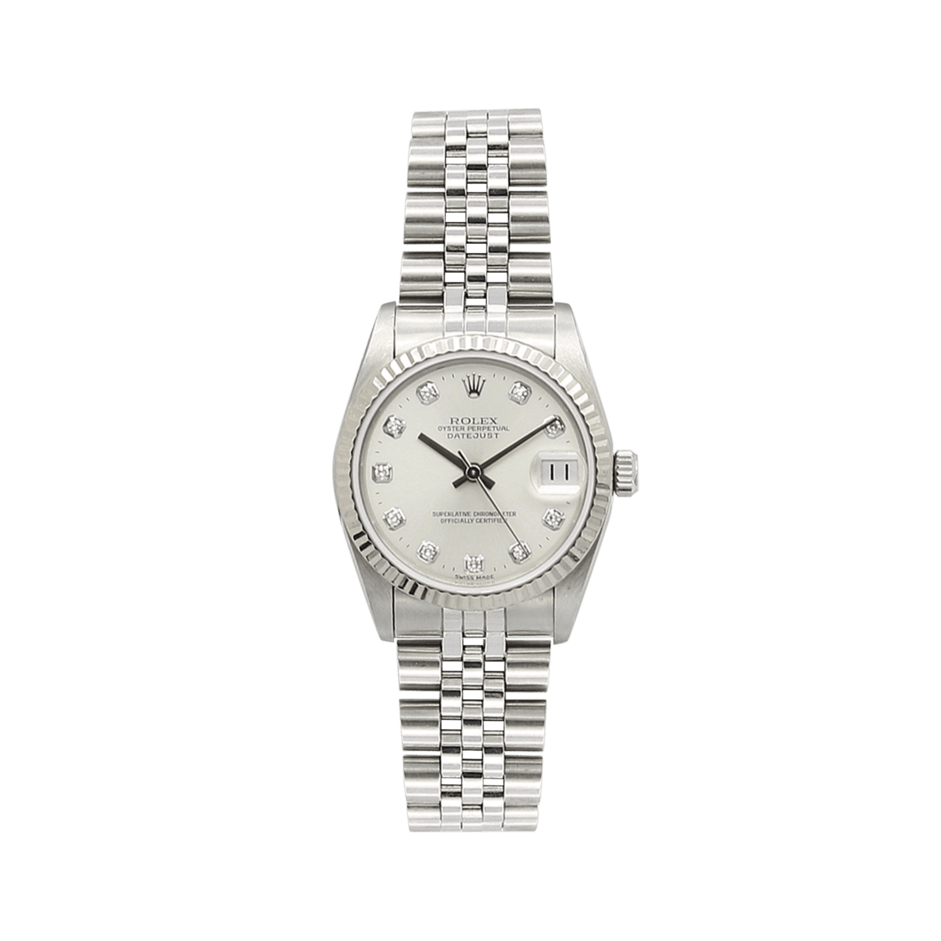 For sale a pre-owned Rolex Oyster Perpetual Datejust reference 68274 watch in steel and white gold, full set.This elegant Rolex features an steel Oyster bracelet, a matching case in stainless steel, and a white gold fluted bezel. The time is displayed on a remarkable silver dial with diamonds. This luxury watch is presents a classic Datejust style with a fluted bezel, a self-winding Perpetual movement, and the iconic 5-point Rolex logo coronet prominently displayed at the 12-hour marker. The mid-size Datejust will appeal to men and women alike: we can consider it ad a unisex Rolex since it offers a larger size and weight for women and a smaller size for men. BRAND ROLEX MODEL DATEJUST 31 REFERENCE 68274 CASE MATERIAL STEEL/GOLD MOVEMENT AUTOMATIC DIMENSION 31 MM DIAL SILVER W/DIAMONDS CRYSTAL SAPPHIRE BRACELET TYPE JUBILEE BRACELET MATERIAL STEEL ORIGINAL BOX YES ORIGINAL PAPERS YES YEAR APPROX. THE '90s CONDITION VERY GOOD