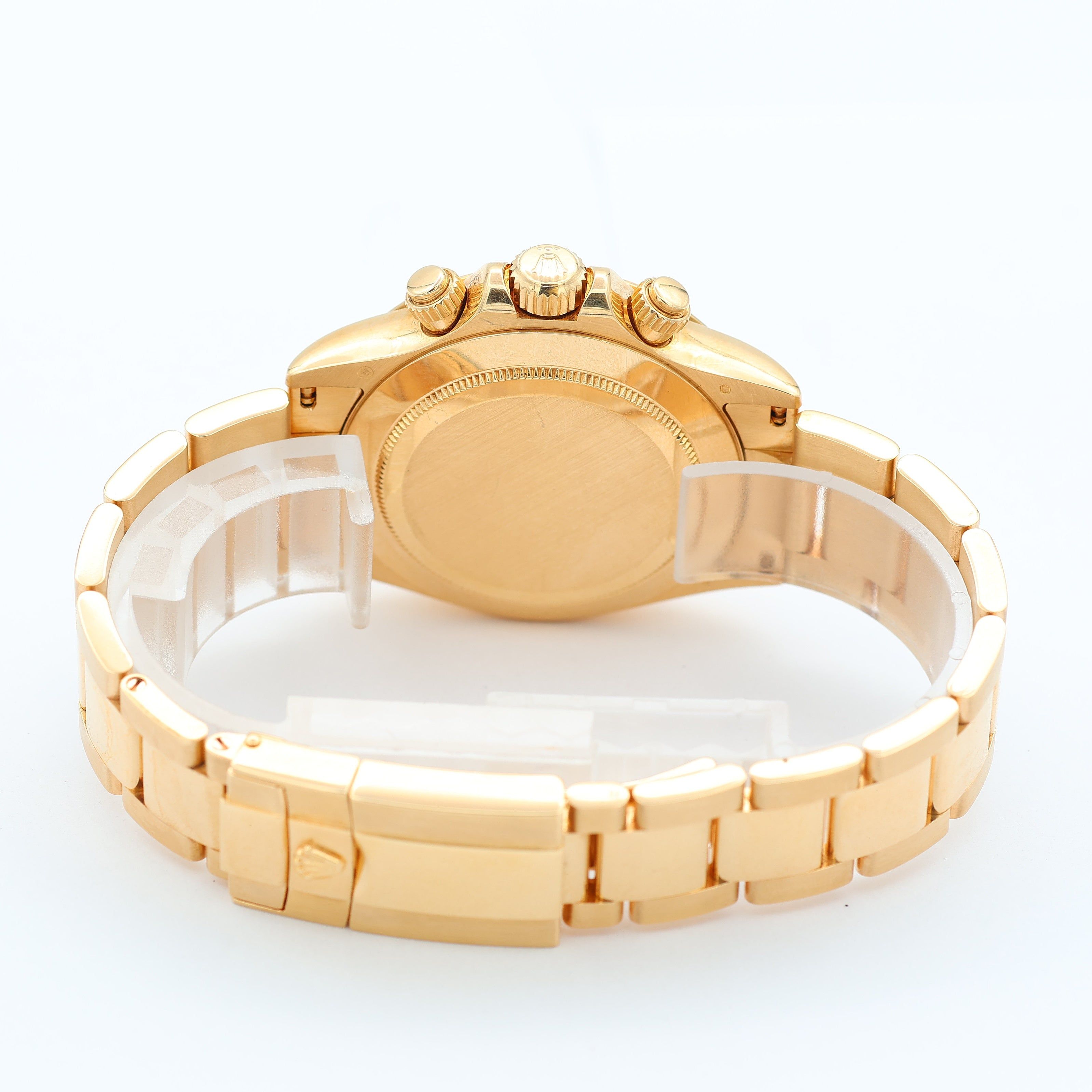 For sale at Debonar Watches: pre-owned Rolex Daytona 116528 in excellent conditions, with card Rolex and box. This 18k gold watch 40mm case carries a champagne dial with black subdials and a yellow gold bracelet. Story:While the Daytona is now widely loved and worn by everyone from the newbie collector to your boss’s boss, the Rolex Daytona is firstly a racing watch.It was made for motorsport professionals and was named after the famous Daytona Beach in Florida, where numerous land speed records were broken.Introduced in 1963, the reference 6239 Daytona was the first Rolex chronograph with a tachymeter bezel that allowed its wearer to measure the speed of an object. The watch gained traction in the racing world but did not gain widespread acceptance until later, thanks in part to a handsome actor/race car driver named Paul Newman. Born in the late '80s, this reference became the first Cosmograph to offer a combination platter of metals.Over the years, the model has seen various updates and has become one of the most desirable watch models in the world. BRAND ROLEX MODEL DAYTONA REFERENCE 116528 CASE MATERIAL 18k GOLD MOVEMENT AUTOMATIC DIMENSION 40 MM DIAL CHAMPAGNE W/ BLACK SUBS BEZEL 18k GOLD CRYSTAL SAPPHIRE BRACELET TYPE OYSTER BRACELET MATERIAL 18k GOLD BRACELET LENGHT 17 CM ORIGINAL BOX YES ORIGINAL PAPERS YES YEAR APPROX. '00s-'10s CONDITION EXCELLENT