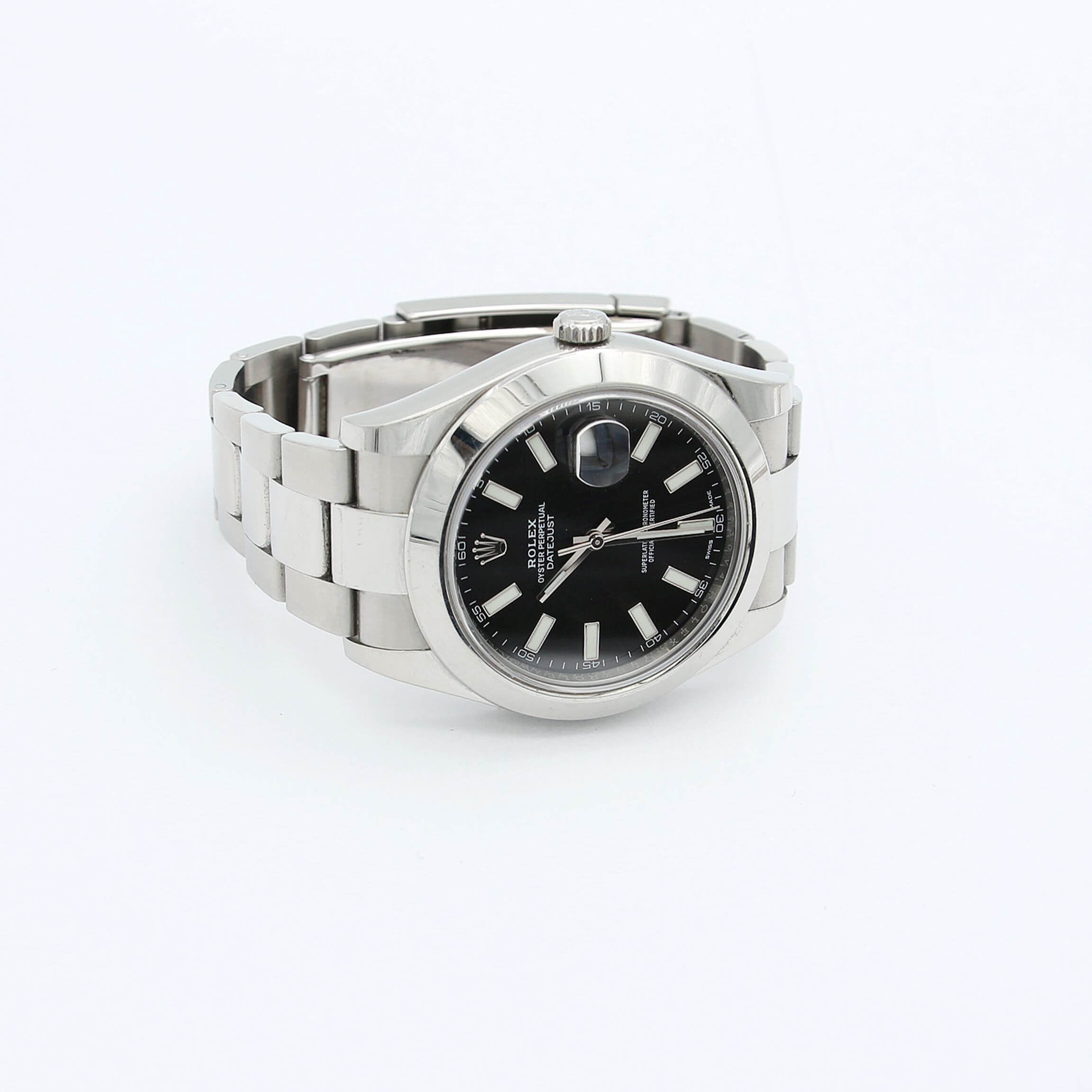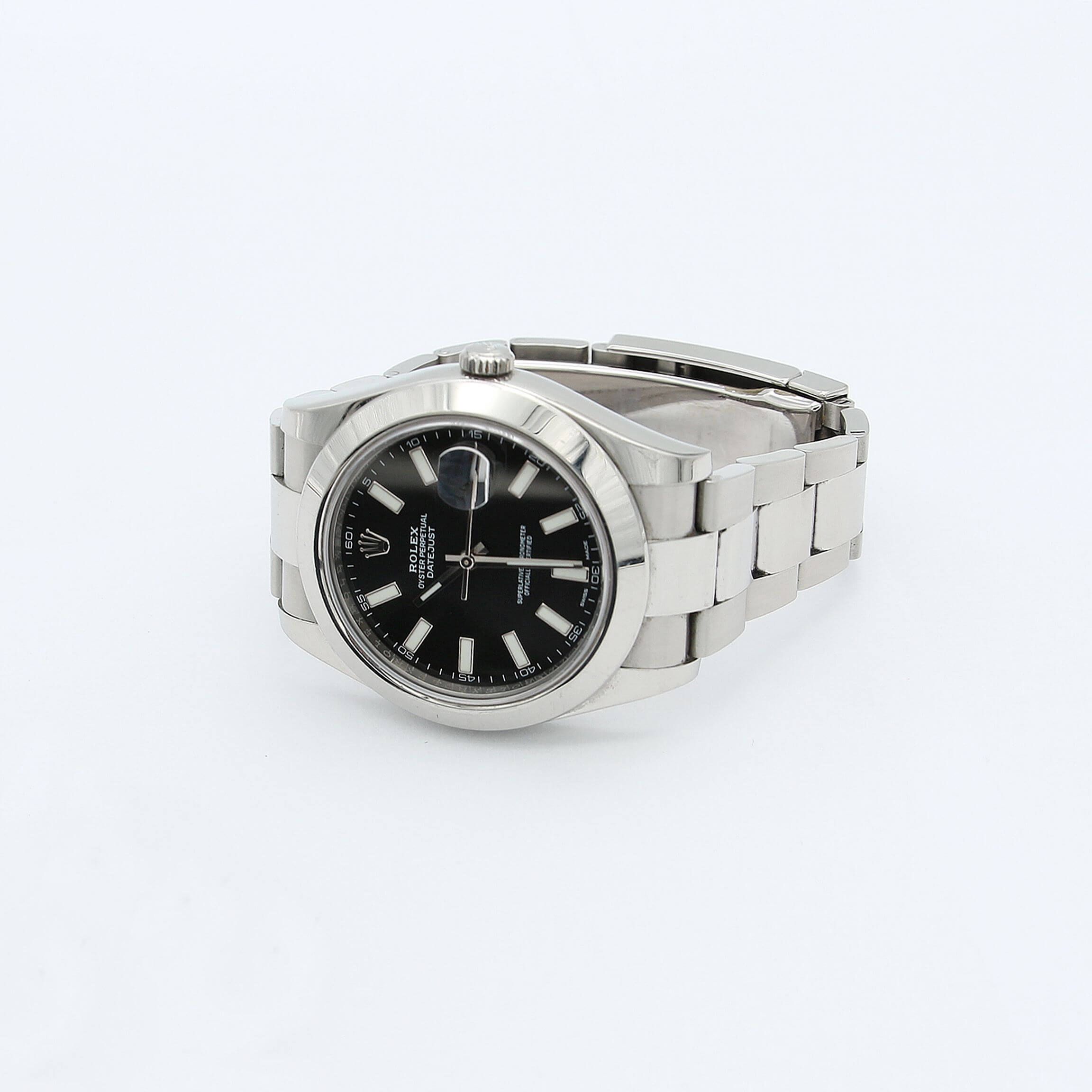 For sale at Debonar Watches: pre-owned Rolex Datejust II 116300, with a deep black dial, full set. Crafted entirely in stainless steel, this reference is ideal for the collector seeking a modern, robust Rolex with clean, contemporary lines.The dial is much larger than the original Datejust’s (which only had a 36mm case). This gives more room for the Datejust II’s best feature: the Cyclops lens. The increased real estate on the dial allows the 116300 to have better proportions between the Cyclops over the date, the hour markings, and the Caliber crown at 12:00 o’clock. The increase in size also creates a much better wrist presence and readability than its’ smaller predecessor.Aesthetically, the DateJust retains relevance and will never go out of fashion. A bit of its story:Rolex DateJust (inspired by Rolex Bubbleback) was first introduced in 1945 to celebrate the 40th anniversary of Rolex. The Datejust is one of the earliest Rolex models that survives till today.From its debut way back in 1945, a revolutionary launch that put the brand firmly on the map, it has remained at the top of the company’s bestseller list for three quarters of a century.Rolex’s ref. 162XX series of Datejust watches first emerged in 1988, a replacement for the relatively short-lived ref. 160XX range. BRAND ROLEX MODEL DATEJUST II REFERENCE 116300 CASE MATERIAL STEEL MOVEMENT AUTOMATIC DIMENSION 41 MM DIAL BLACK BEZEL STEEL CRYSTAL SAPPHIRE BRACELET TYPE OYSTER BRACELET MATERIAL STEEL BRACELET LENGHT 18 CM ORIGINAL BOX YES ORIGINAL PAPERS YES YEAR APPROX. '00s-'10s CONDITION EXCELLENT