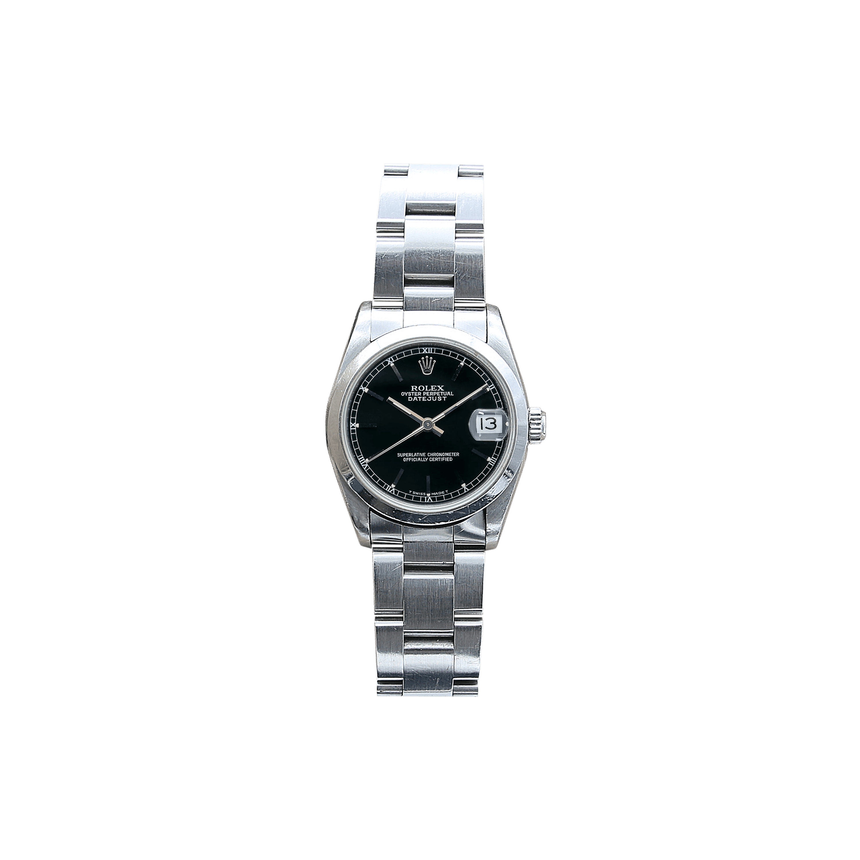For sale at Debonar Watches: pre-owned Rolex Datejust ref. 68240, with a modern black dial with circle minutes and a domed steel bezel.Instead of a traditional 26mm or 28mm ladies case, this mid-size example features a slightly larger 31mm case. Just large enough to make a statement while maintaining a flattering and fashion-forward design.Wear it alone or stack this pre-owned Datejust with other bracelets for a look that will steal the attention of everyone you meet. BRAND ROLEX MODEL DATEJUST REFERENCE 68240 CASE MATERIAL STEEL (DOMED) MOVEMENT AUTOMATIC DIMENSION 31 MM DIAL BLACK CIRCLE HOURS BEZEL STEEL CRYSTAL SAPPHIRE BRACELET TYPE OYSTER BRACELET MATERIAL STEEL BRACELET LENGHT 17 CM ORIGINAL BOX NO ORIGINAL PAPERS NO YEAR APPROX. THE '90s-'00s CONDITION VERY GOOD