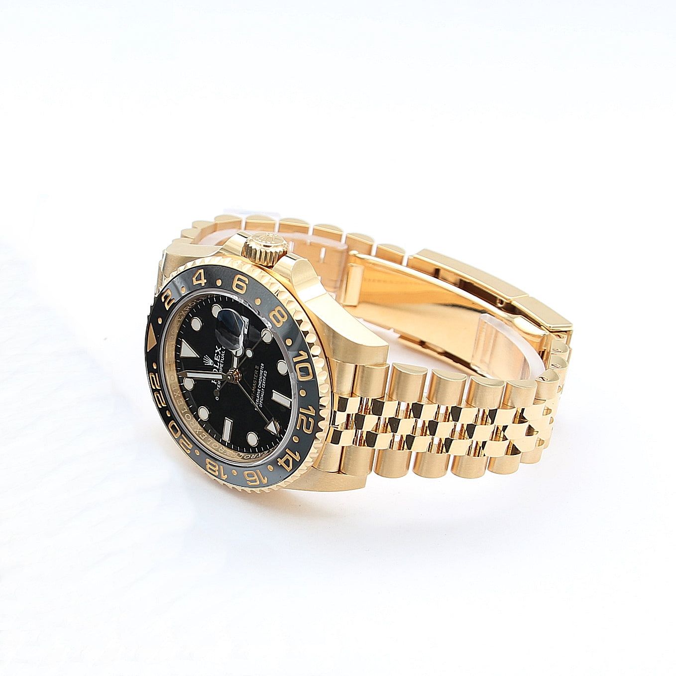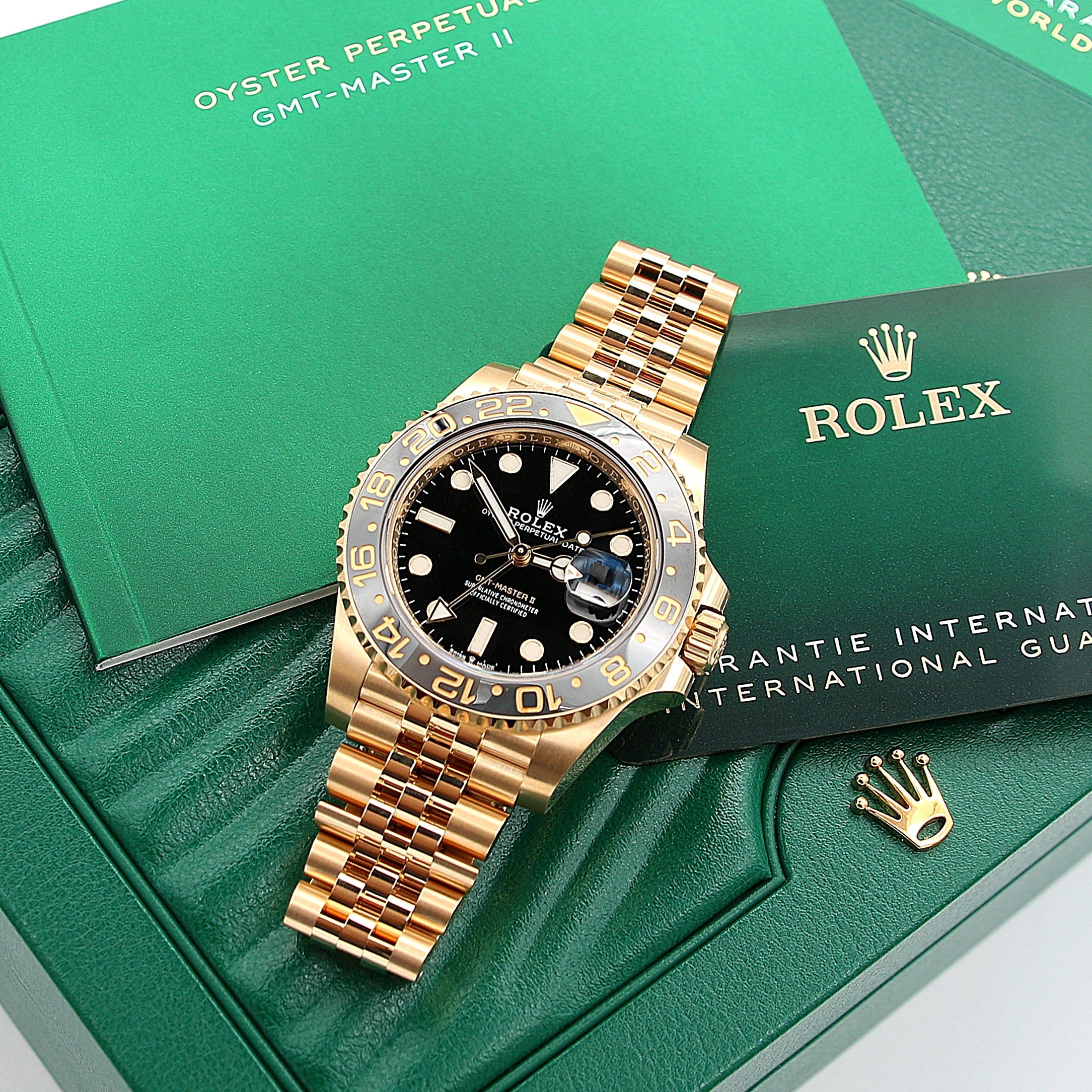 For sale at Debonar Wacthes: pre-owned Rolex GMT Master II 126718GRNR, full set. Today the Rolex 126718GRNR is one of the most sought after watches. This particular reference, 126718GRNR, has a black 24 hour bezel which uses gold for the GMT numerals. The case and bracelet is crafted entirely from yellow gold.Like all Rolex Professional watches, the GMT-Master II offers exceptional legibility in all circumstances, and especially in the dark, thanks to its Chromalight display.In the last couple of years, Rolex has frequently upgraded and updated the GMT-Master II collection. In 2018, Rolex released the ”Root beer” 126711CHNR”. In the same year, Rolex presented the ”Pepsi” 126710BLNR. One year later, Rolex released the 126710BLNR. The GMT-Master II line underwent a complete upgrade starting in 2018 where the old-generation caliber 3186 caliber was upgraded to the 3285. From 2018 onwards, Rolex upgraded all the models in the collection. However, since then, there has been something that has been ”missing”. And that is yellow gold. Rolex discontinued the 116713LN and 116718LN in 2018. Since then, the only gold option has been the 126711CHNR and 126715CHNR, both made in Everose gold. The Rolex 126718GRNR is the premier GMT watch for world travelers launched in 2023. BRAND ROLEX MODEL GMT MASTER II REFERENCE 126718GRNR CASE MATERIAL YELLOW GOLD MOVEMENT AUTOMATIC DIMENSION 40 MM DIAL BLACK BEZEL YELLOW GOLD CRYSTAL SAPPHIRE BRACELET TYPE JUBILEE BRACELET MATERIAL YELLOW GOLD ORIGINAL BOX YES ORIGINAL PAPERS YES YEAR 2023 CONDITION EXCELLENT