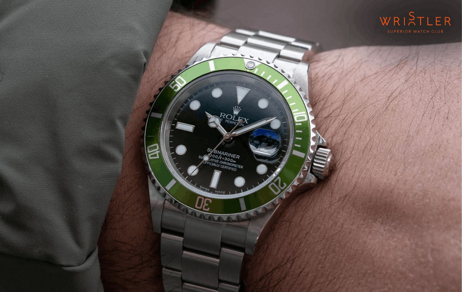 Agora, se o seu objetivo é o longo prazo, o Kermit é a aposta mais rara, especialmente os primeiros modelos Flat 4. Mas o que é ao certo uma luneta Rolex Flat 4? Refere-se ao formato do número 4 no inserto da luneta, especificamente no marcador de minutos "40". Nestas primeiras versões, a parte superior do 4 é plana em vez de pontiaguda. É um pequeno detalhe, mas, para os colecionadores, este tipo de nuance faz toda a diferença. Os Kermits Flat 4 são as versões mais antigas e desejadas, e costumam atingir preços consideravelmente mais elevados.