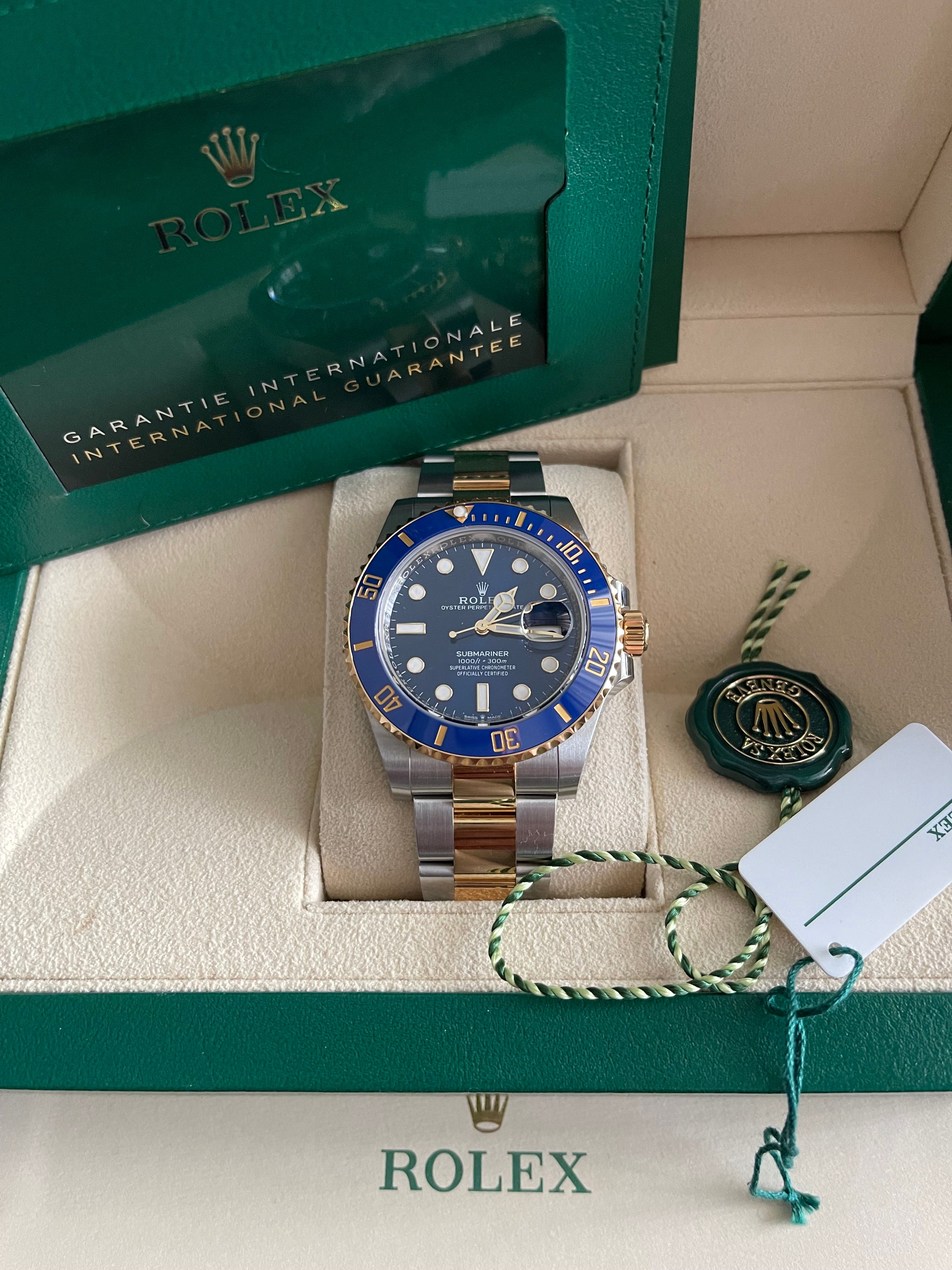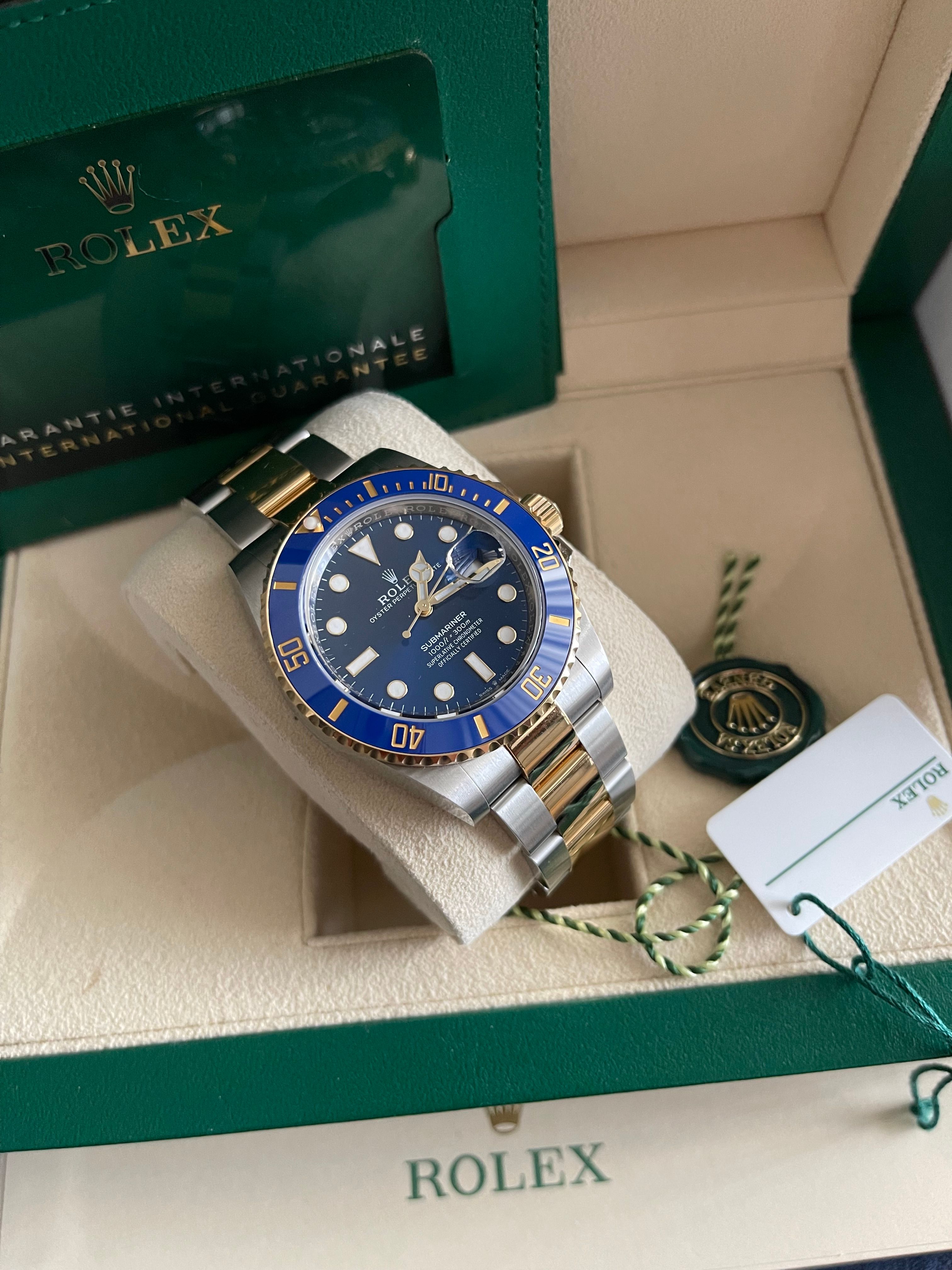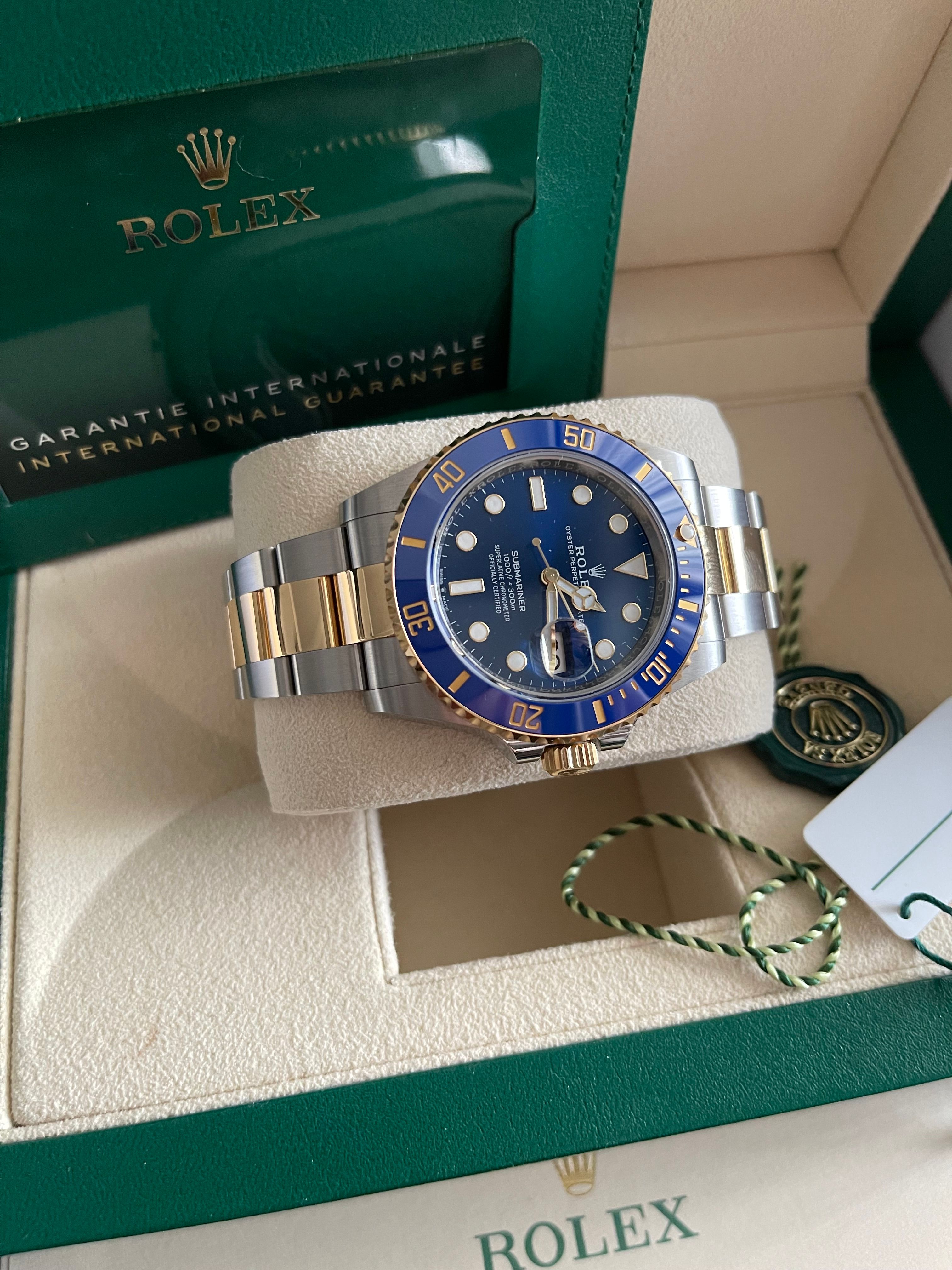 THE OYSTER PERPETUAL SUBMARINER DATE IN OYSTERSTEEL AND YELLOW GOLD WITH A CERACHROM BEZEL INSERT IN BLACK CERAMIC AND A BLUE DIAL WITH LARGE LUMINESCENT HOUR MARKERS.