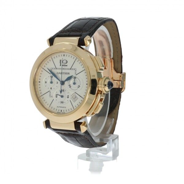 Cartier Pasha 42 2861 W3020151. Beautiful Cartier Pasha chronograph in 18k yellow gold 42mm case, automatic movement Dark brown leather strap, golden folding clasp Generic box and a certificate with 12 months warranty of our shop
