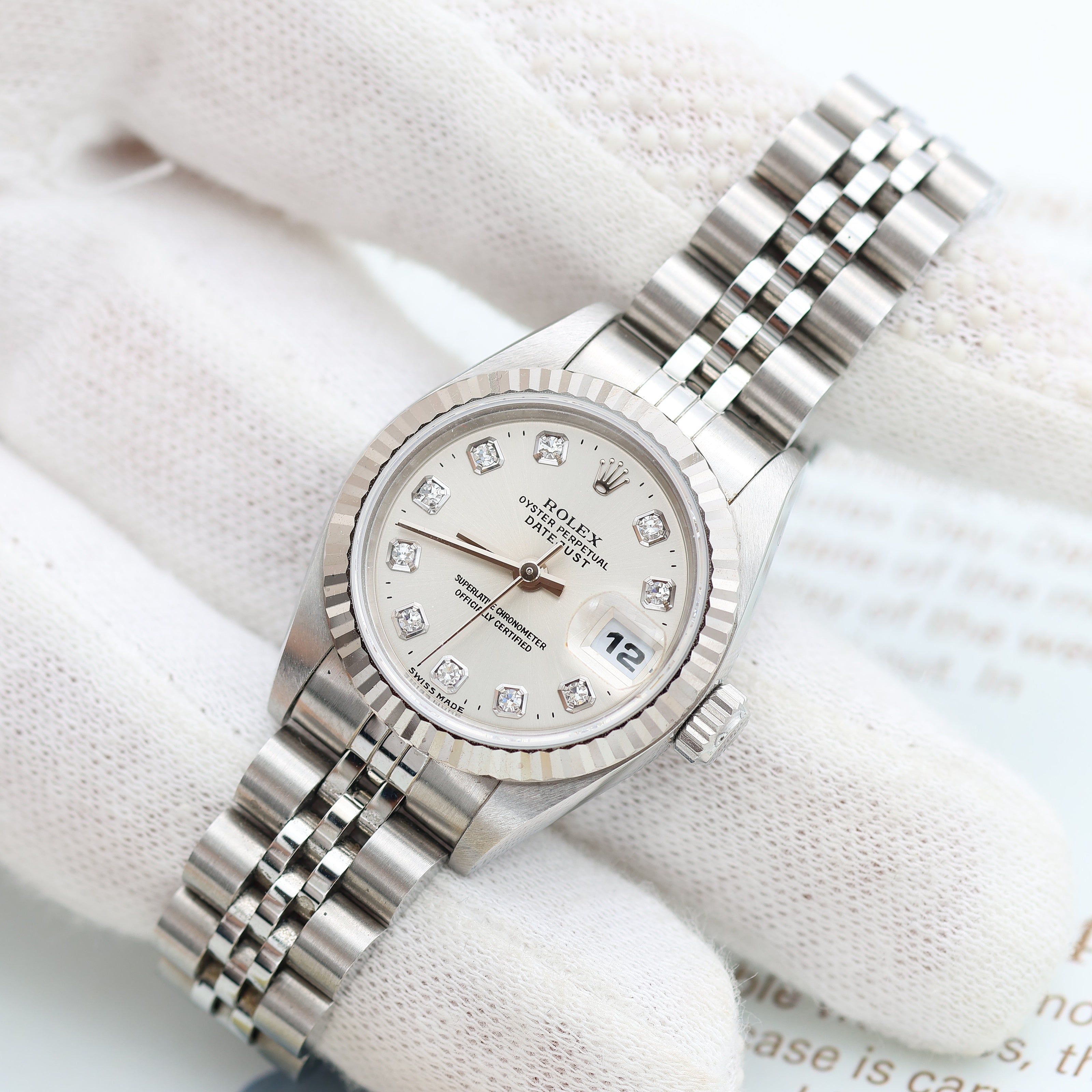For sale at Debonar Watches: pre-owned Rolex Oyster Perpetual Datejust Ref. 69174G with a silver dial with diamonds.The bracelet is around 13.5-14 cm, for little wrists.Fine, center seconds, self-winding automatic, water-resistant, stainless steel and 18K white gold lady's wristwatch with date and a stainless steel Rolex Jubilee bracelet with deployant clasp.The Lady-Datejusts are all about delicacy and finesse, something to accentuate a sophisticated outfit. BRAND ROLEX MODEL DATEJUST LADY REFERENCE 69174G CASE MATERIAL STEEL MOVEMENT AUTOMATIC DIMENSION 26 MM DIAL SILVER WITH DIAMONDS BEZEL 18K GOLD CRYSTAL SAPPHIRE BRACELET TYPE JUBILEE BRACELET MATERIAL STEEL BRACELET LENGHT 16 CM ORIGINAL BOX NO ORIGINAL PAPERS NO YEAR APPROX. THE '90s CONDITION EXCELLENT