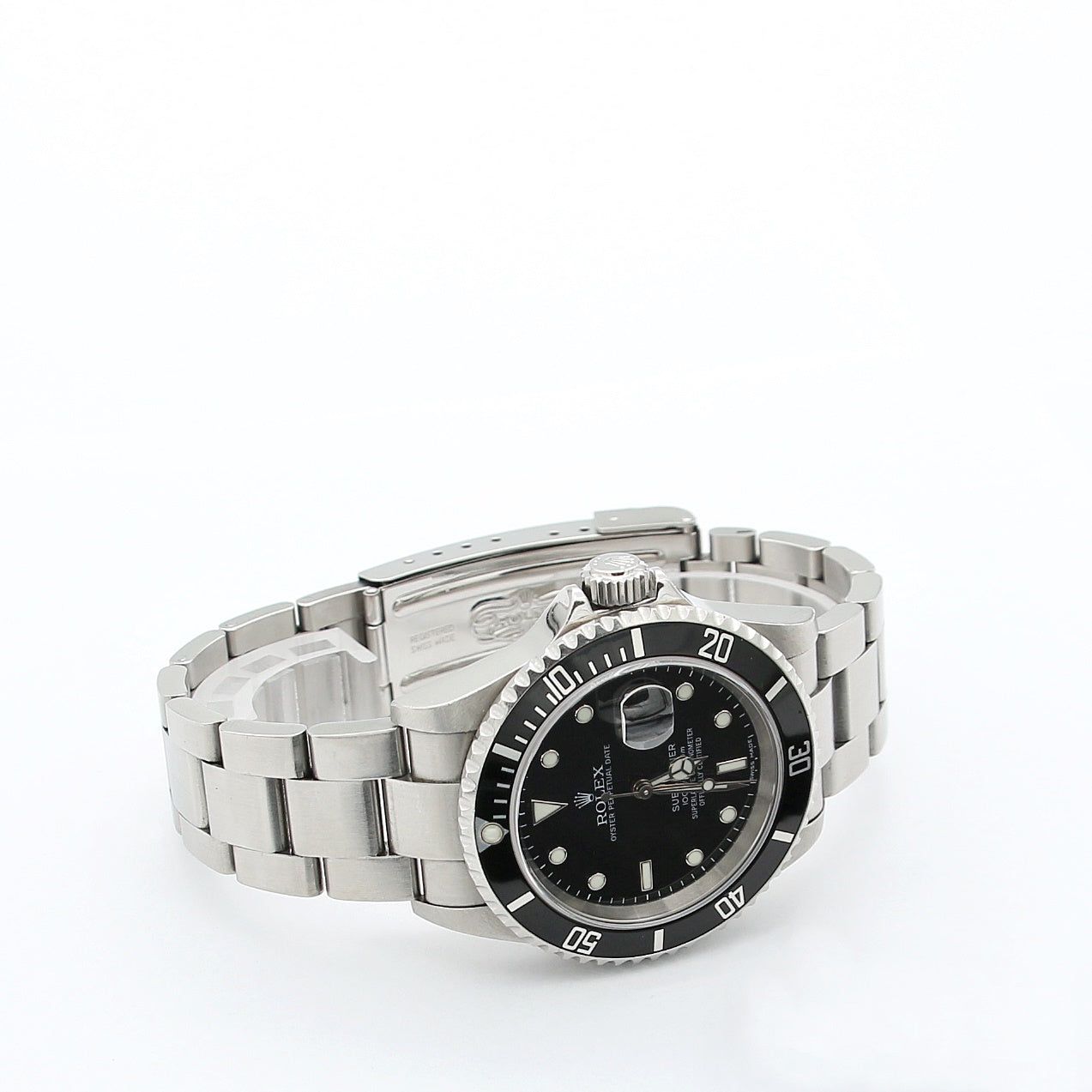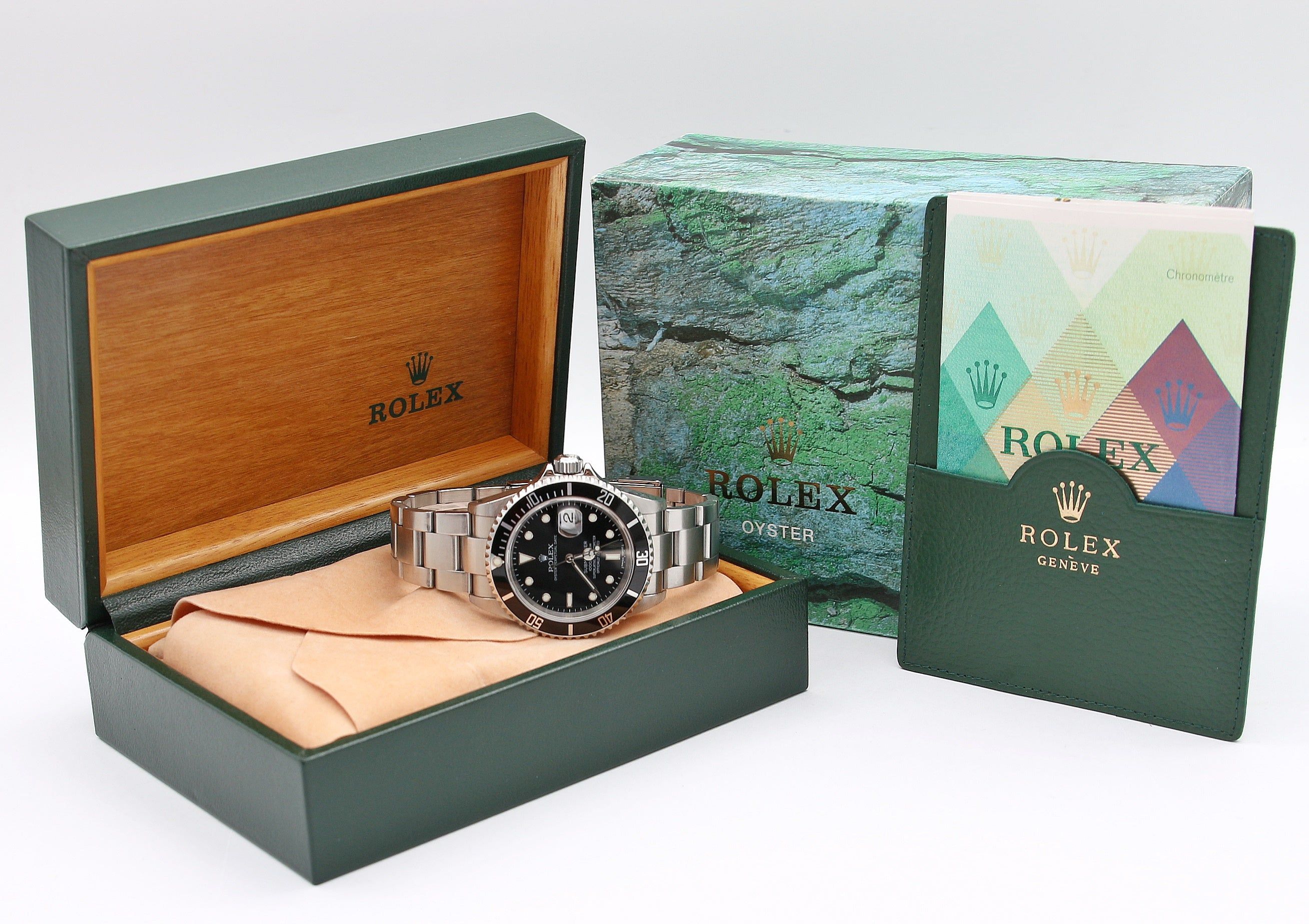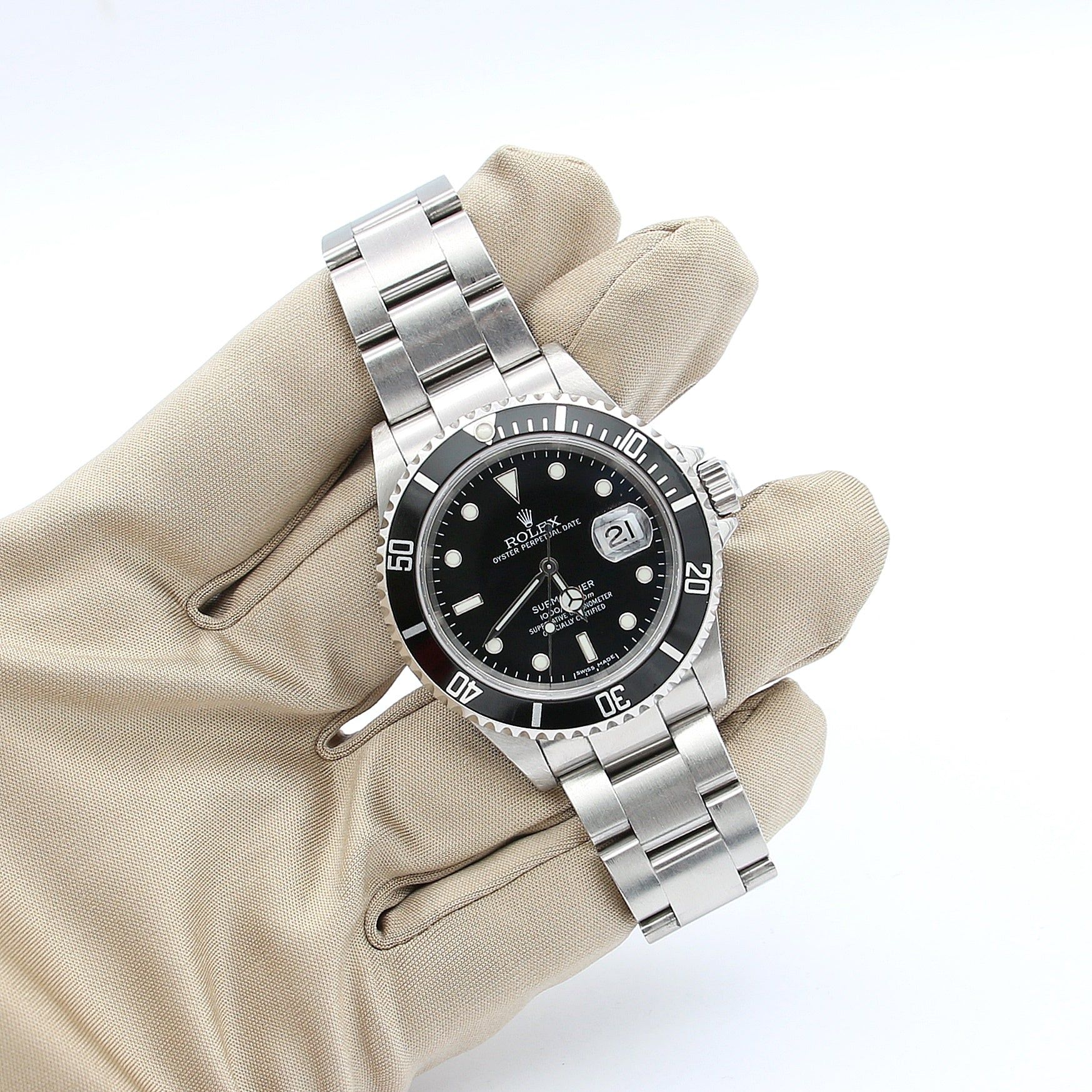 For sale at Debonar Watches: pre-owned Rolex Submariner Date 16610T, with full set. This Rolex Submariner features a 40mm Oyster cases crafted from 904L stainless steel that include Triplock screw-down crowns, flat sapphire crystals with the brand’s signature Cyclops magnification lens, and solid screw-down casebacks. he Rolex Submariner was introduced in 1954 as a robust, highly water-resistant luxury diver’s wristwatch. Its timeless design barely evolved over the course of 60 years, contributing to the legendary status of this model. The reference 16610 was produced for more than 20 years between 1987 and 2010 and introduced major technical innovations. It replaced the outgoing Submariner reference 16800 and is considered by many collectors as the last “pre-modern” iteration, before Rolex introduced the maxi cases and the ceramic bezel insert with ref. 116610. The reference introduced progressive changes over its long production period, such as the transition from Tritium to Luminova luminescent material in the late 1990s, the withdrawal of drilled lugs and the Rolex engraving to the dial outer ring. This reference is powered by the caliber 3135 which remains in use for the reference 116610. The addition of the T in the serial, first seen in 2003, means that the lugs do not have holes for the spring bars. BRAND ROLEX MODEL SUBMARINER DATE REFERENCE 16610T CASE MATERIAL STEEL MOVEMENT AUTOMATIC DIMENSION 40 MM DIAL BLACK BEZEL STEEL CRYSTAL SAPPHIRE BRACELET TYPE OYSTER BRACELET MATERIAL STEEL BRACELET LENGHT 17 CM ORIGINAL BOX YES ORIGINAL PAPERS YES YEAR 2006 CONDITION VERY GOOD