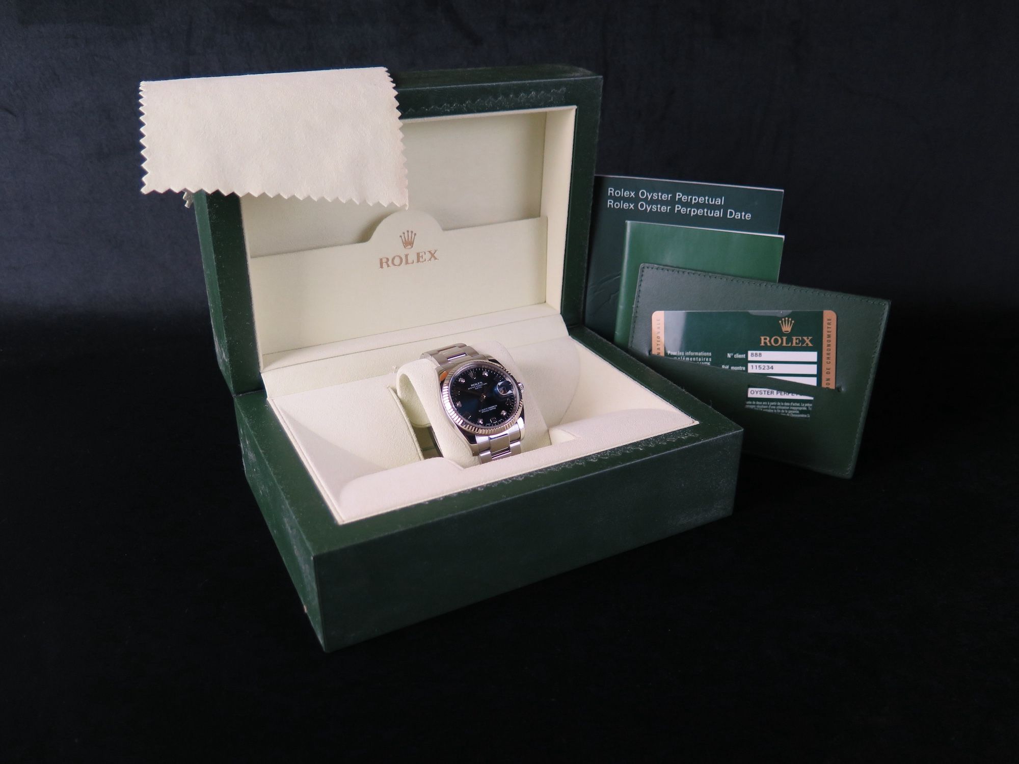 Dial colour is blue set with 5 diamonds.Originally sold by Rolex 02/2014, LC888 (Hong Kong)