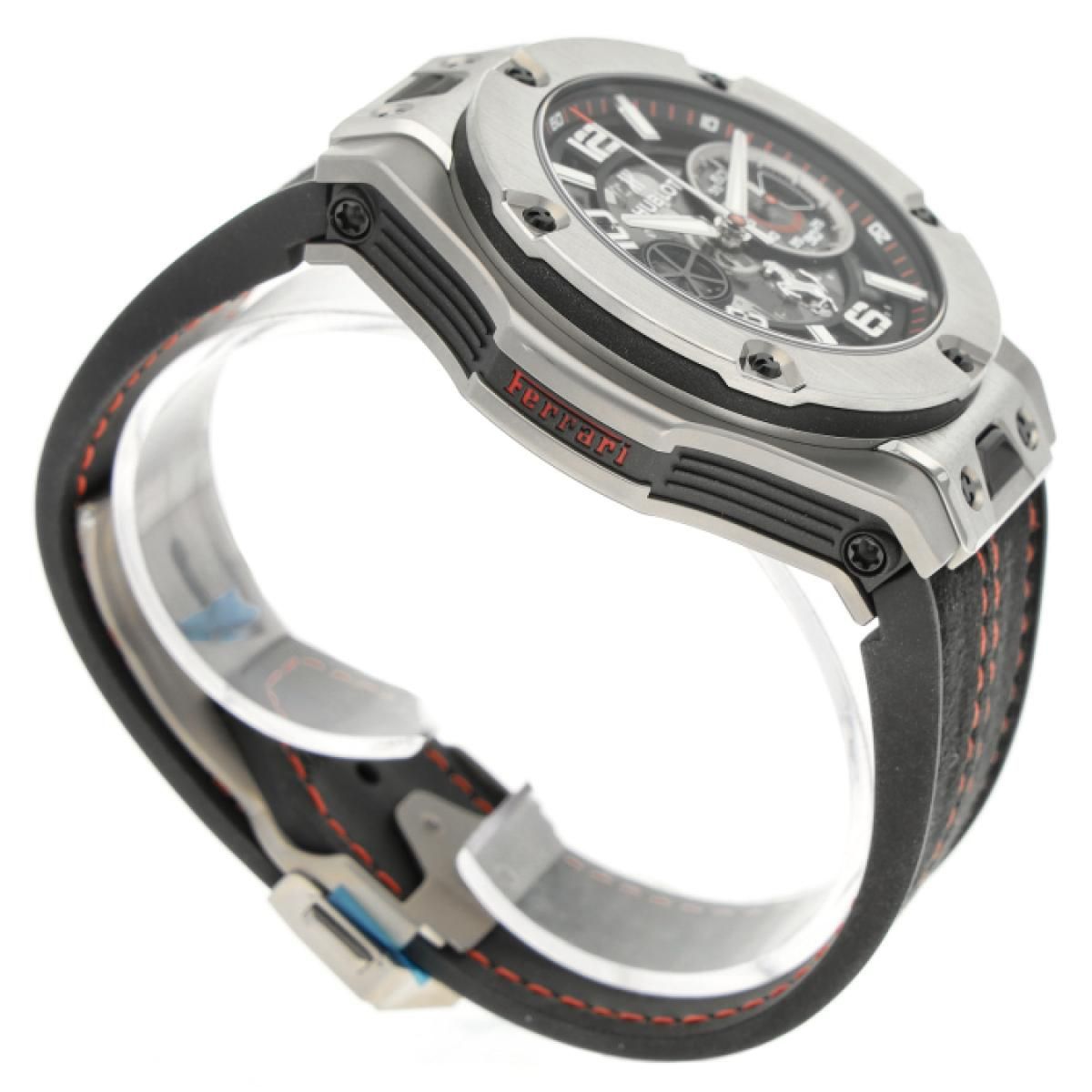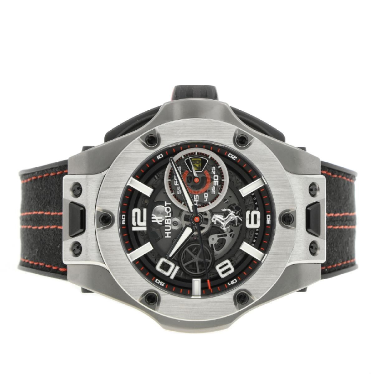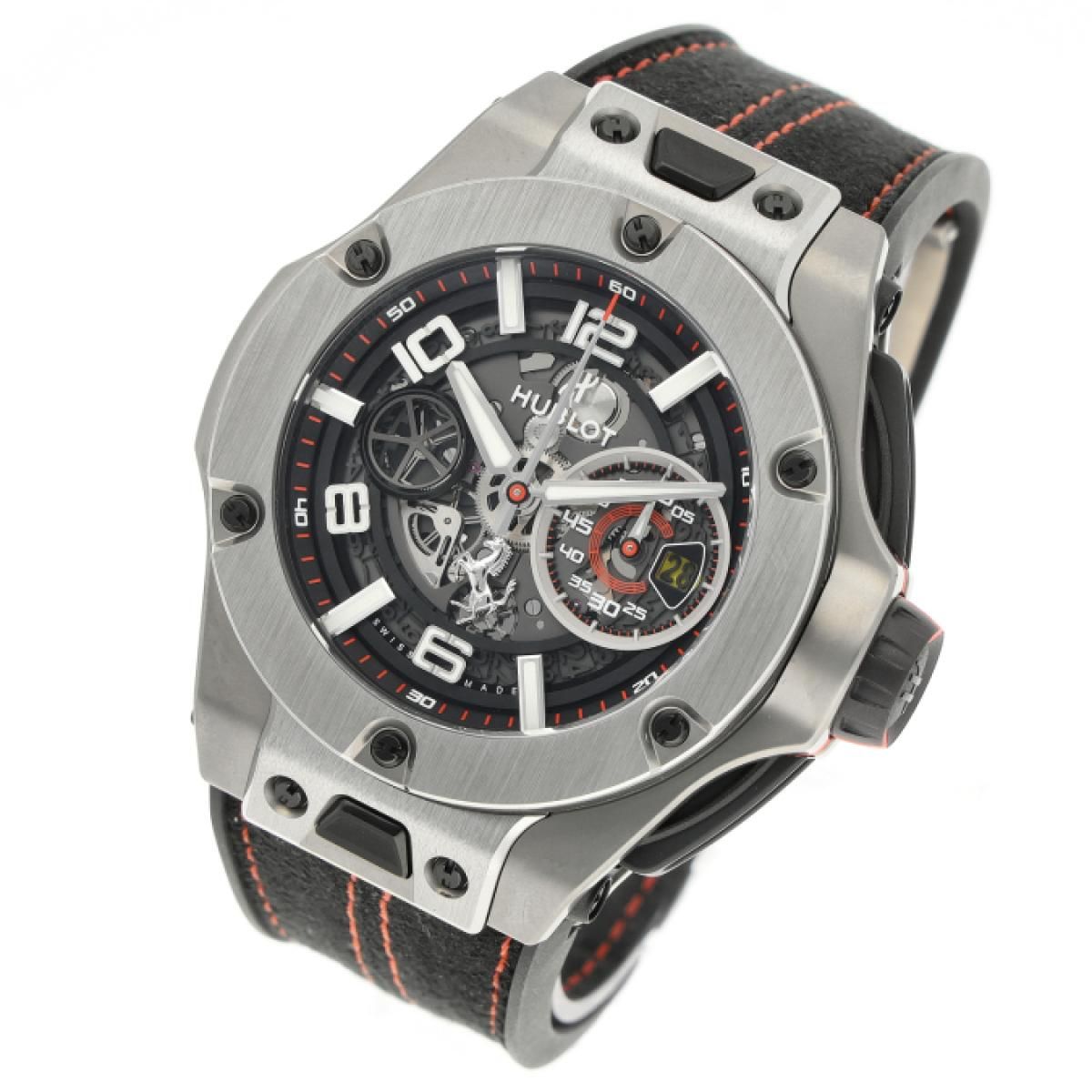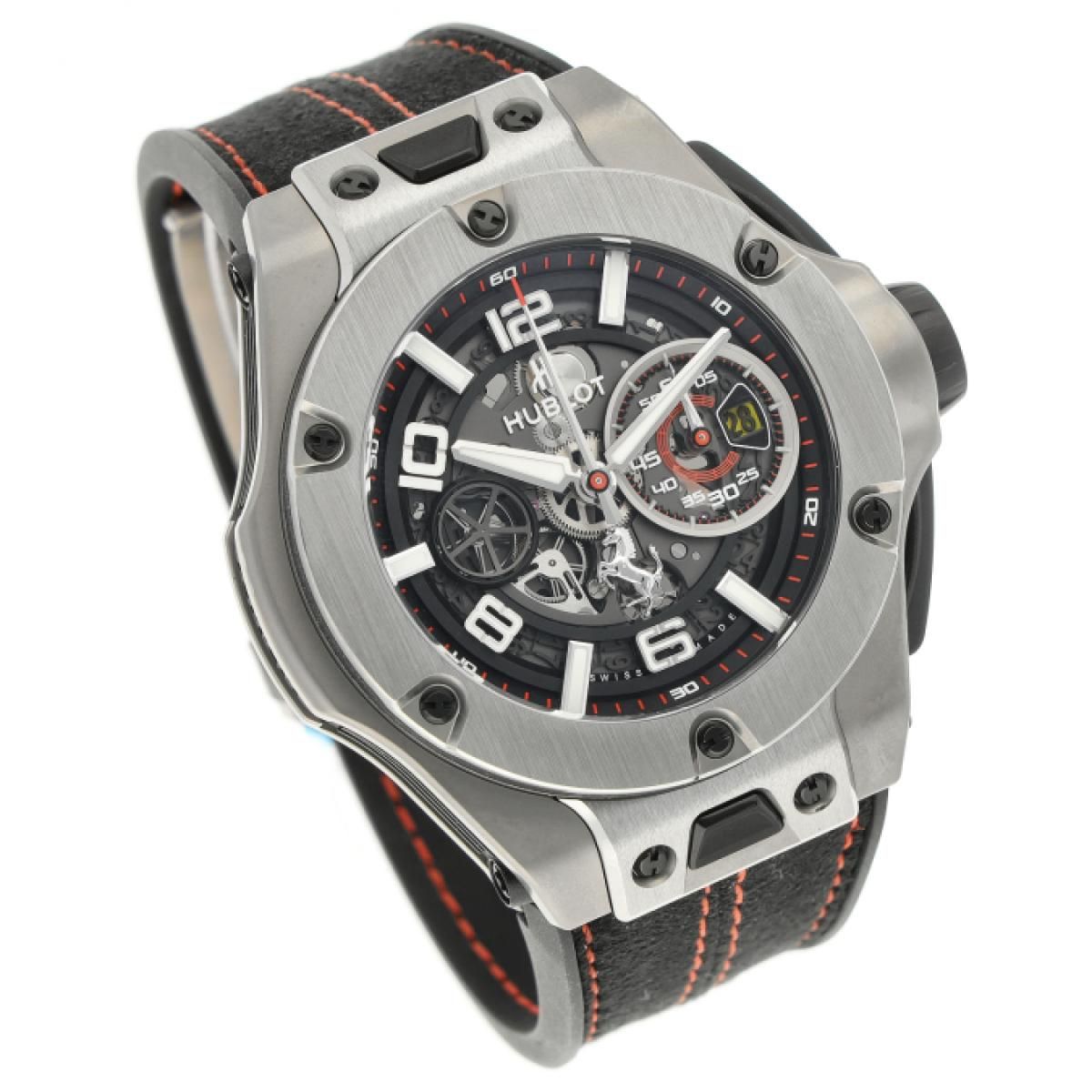 Hublot Unico from 2017 with a 45mm case in titanium and folding clasp. The men's Hublot watch is in unworn condition.UnwornRef. 402.NX.0123.WRBox + original papers45mmdateChronographautomaticTachymeterSkeleton DialGerman deliveryFerrari