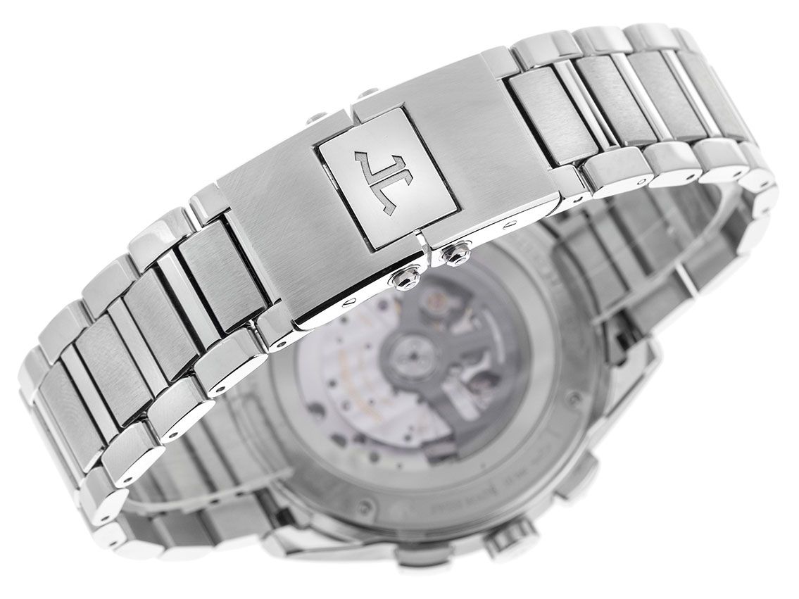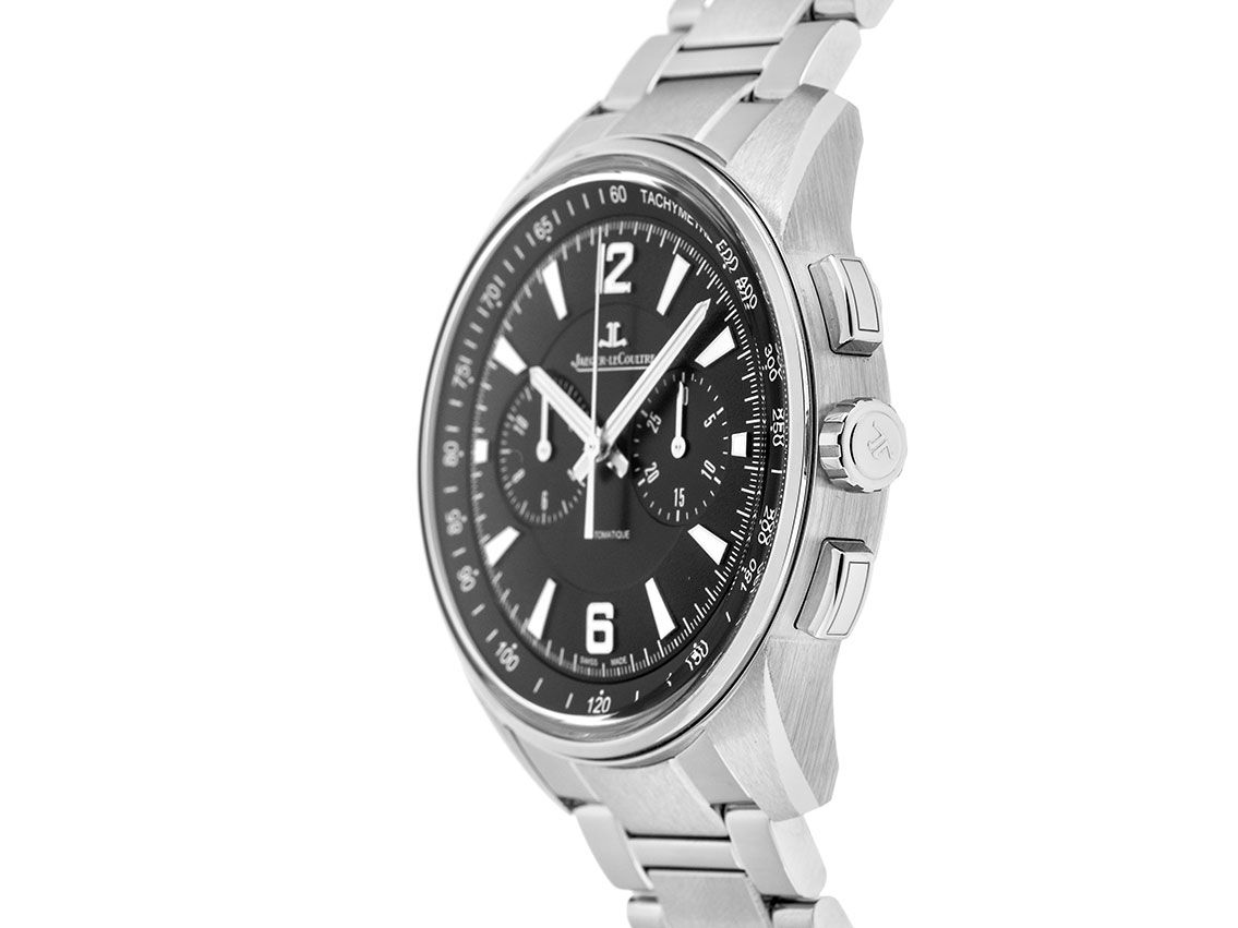 Caixa em aço inoxidável acetinado e polido, diâmetro da caixa sem coroa de 42mm, altura da caixa de 11,7mm. Bezel em aço inoxidável liso e polido, escala taquimétrica sob vidro. Pulseira em aço inoxidável, fecho duplo em aço inoxidável com logotipo do fabricante. Mostrador preto com números árabes em aço inoxidável luminosos e índices luminosos em aço inoxidável, além de ponteiros luminosos em aço inoxidável polido. Movimento automático, cronógrafo, calibre Jaeger-leCoultre 751 com 37 pedras preciosas, reserva de marcha de aproximadamente 65 horas. Exibição de horas e minutos através de ponteiros centrais. Vidro de safira resistente a riscos e curvado. Coroa com logotipo do fabricante. Fundo em aço inoxidável com 4 parafusos e gravado com janela de vidro de safira. Peso do relógio incluindo a pulseira de 153g, comprimento da pulseira incluindo a caixa de 195mm. À prova d'água até 10 ATM. Número de referência: Q902.81.70, ID: ST4657196400823H-16900, número do artigo: 10000071161. Caixa original Jaeger-leCoultre com embalagem e documentos de garantia de 2023, além de descrição, conjunto completo. Sem uso. Prazo de entrega imediato.