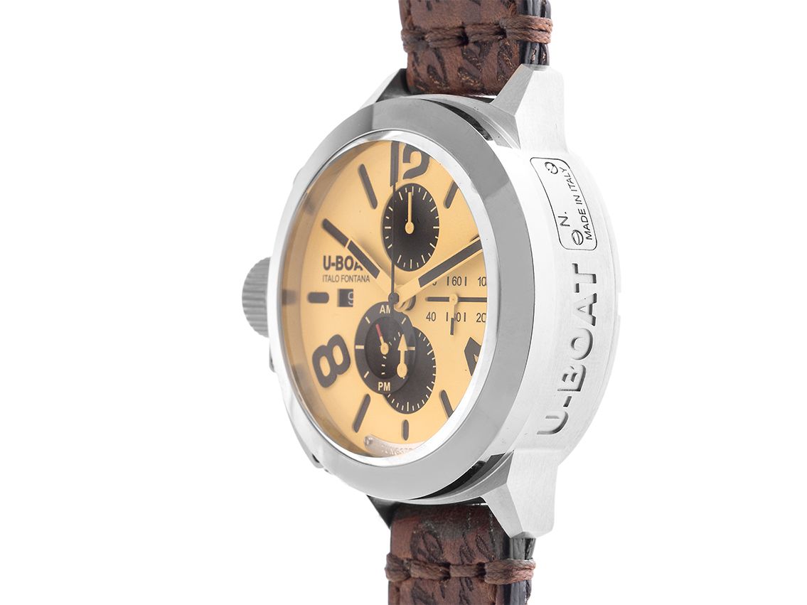 U-Boat Classico Tungsteno Stahl Automatik Chronograph Armband LederGehäuse Edelstahl satiniert, Gehäusedurchmesser ohne Krone 45mm, Gehäusehöhe 17,9mm. Lünette Edelstahl glatt und poliert. Armband Kalbsleder dunkelbraun mit geprägtem Schriftzug, Anstoßbreite 20mm, Stiftschließe Edelstahl mit Hersteller-Logo. Zifferblatt beigefarben mit arabischen Ziffern und Indexen sowie beigefarbenen Zeigern. Uhrwerk Automatik, Chronograph, Kaliber U-Boat mit 25 Edelsteinen. Anzeige von Stunde und Minute über Zeiger aus der Mitte, kleine Sekunde mit Sekundenstopp zur sekundengenauen Einstellung der Uhrzeit bei 3 Uhr, Datumsanzeige mit Schnellverstellung bei 9 Uhr. Saphirglas kratzfest. Krone links bei 9 Uhr mit Spezial Kronenschutz, verschraubbar. Boden Edelstahl 7-fach verschraubt und graviert mit Saphirglas Sichtfenster. Gewicht der Uhr inklusive Armband 170g. Wasserdicht 10 ATM. Referenznummer: 9568, Gehäusenummer: 0XXX, ID: ST115447000224H-3950, Artikelnummer: 10000073438. Original U-Boat Box mit Umkarton und Garantie Papiere, Full Set. Neu. Lieferzeit sofort.