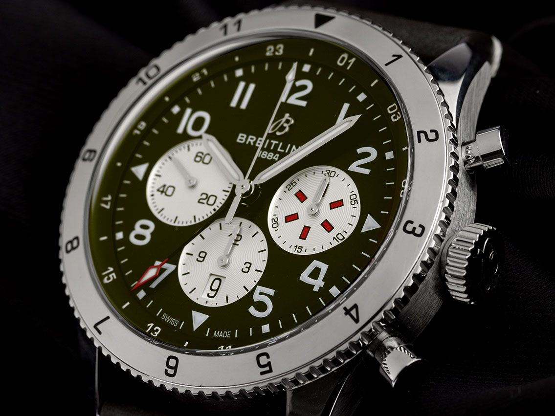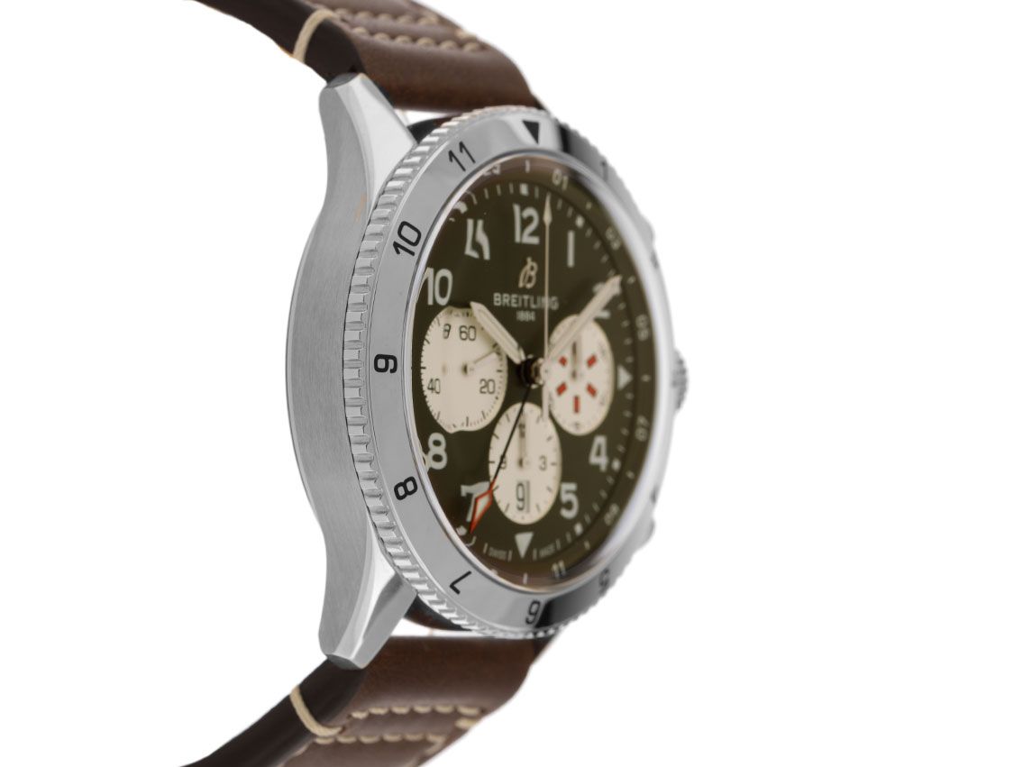 Breitling Super AVI B04 Curtiss Warhawk Stahl Automatik Chronograph Armband Leder FaltschließeGehäuse Edelstahl poliert und satiniert, Gehäusedurchmesser ohne Krone 46mm, Gehäusehöhe 15,9mm. Lünette Edelstahl gerädelt und poliert mit 12-Stunden Skala, beidseitig drehbar. Armband Leder braun mit heller Ziernaht, Anstoßbreite 24mm, Sicherheitsfaltschließe Edelstahl mit Hersteller-Logo. Zifferblatt olivfarben mit arabischen Leuchtziffern und Edelstahl Leuchtzeigern. Uhrwerk Automatik, Chronograph, Chronometer mit Zeugnis, Manufakturkaliber Breitling 04 mit 47 Edelsteinen, Gangreserve ca. 70 Stunden. Anzeige von Stunde und Minute über Zeiger aus der Mitte, kleine Sekunde mit Sekundenstopp zur sekundengenauen Einstellung der Uhrzeit bei 9 Uhr, Datumsanzeige mit Schnellverstellung bei 6 Uhr, GMT (zweite Zeitzone) ablesbar über Zeiger mit roter Spitze aus der Mitte. Saphirglas kratzfest, doppelseitig entspiegelt, bombiert und gewölbt. Krone verschraubbar mit Hersteller-Logo. Boden Edelstahl verschraubt und graviert mit Saphirglas Sichtfenster. Gewicht der Uhr inklusive Armband 138g. Wasserdicht bis 10 ATM. Referenznummer: AB04452A1L1X1, ID: ST1160145741024H-10900, Artikelnummer: 10000076887. Original Breitling Box mit Garantie Papiere von 2024 sowie Beschreibung, Full Set. Ungetragen. Lieferzeit sofort.