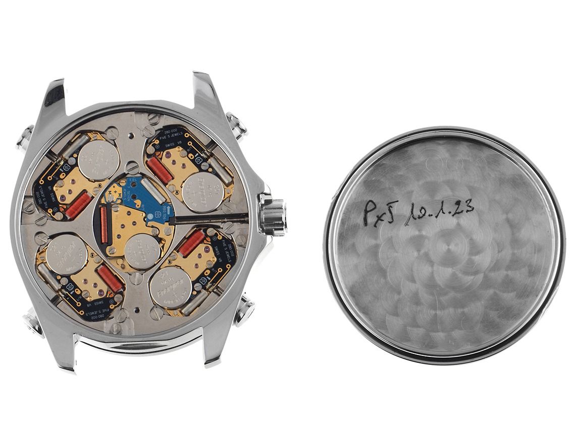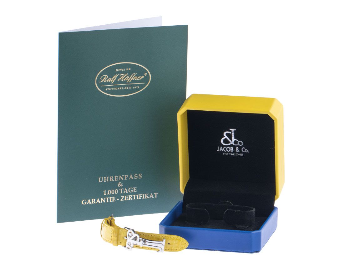 Jacob & Co. 5 Time New York L.A. Paris Tokyo Stahl Perlmutt Quarz Armband Kautschuk FaltschließeGehäuse Edelstahl poliert, Gehäusedurchmesser ohne Krone 40mm, Gehäusehöhe 12,5mm. Lünette Edelstahl glatt und poliert. Jacob & Co Armband Kautschuk Pastell gelb mit Ziernaht, Anstoßbreite 20mm, Jacob & Co. Faltschließe Edelstahl mit Hersteller-Logo. Zifferblatt Perlmutt mit arabischen Ziffern und polierten Edelstahl Zeigern sowie roter Sekundenzeiger. Uhrwerk quarzgesteuert mit 5 verschiedenen Zeitzonen, Kaliber ETA 4x 280.002 mit 5 Edelsteinen und 1x 980.106 mit 7 Edelsteinen. Anzeige von Stunde, Minute und Sekunde über Zeiger aus der Mitte mit Sekundenstopp zur sekundengenauen Einstellung der Uhrzeit, Zeitzonenanzeige bei 2, 4, 8 und 10 Uhr. Saphirglas kratzfest. Krone mit Flankenschutz und Hersteller-Logo. Boden Edelstahl verschraubt und graviert. Gewicht der Uhr inklusive Armband 100g. Gehäusenummer: AXXX, Baujahr: 2000, ID: KD138232000225H-4900, Artikelnummer: 10000078430. Mit Gangkontrolle, neuer Batterie und kompletter äußerlicher Aufarbeitung von Februar 2025, inkl. 1000 Tage Garantie. Original Jacob & Co Box und Uhrenpass sowie ein Wechselband Leder gelb. Superschnäppchen, extrem seltenes Sammlerstück, fast nicht getragen. Sehr guter Zustand. Lieferzeit sofort.