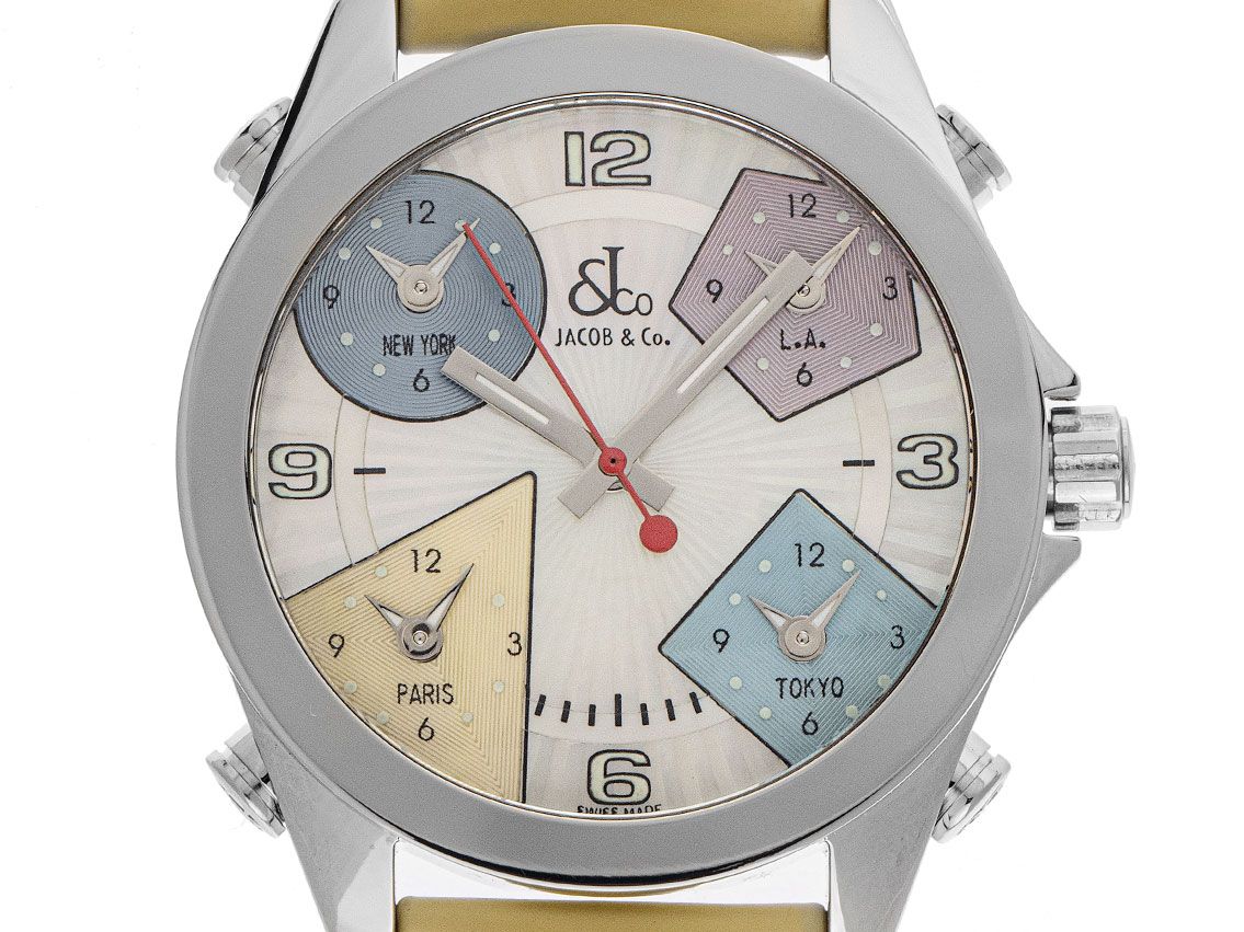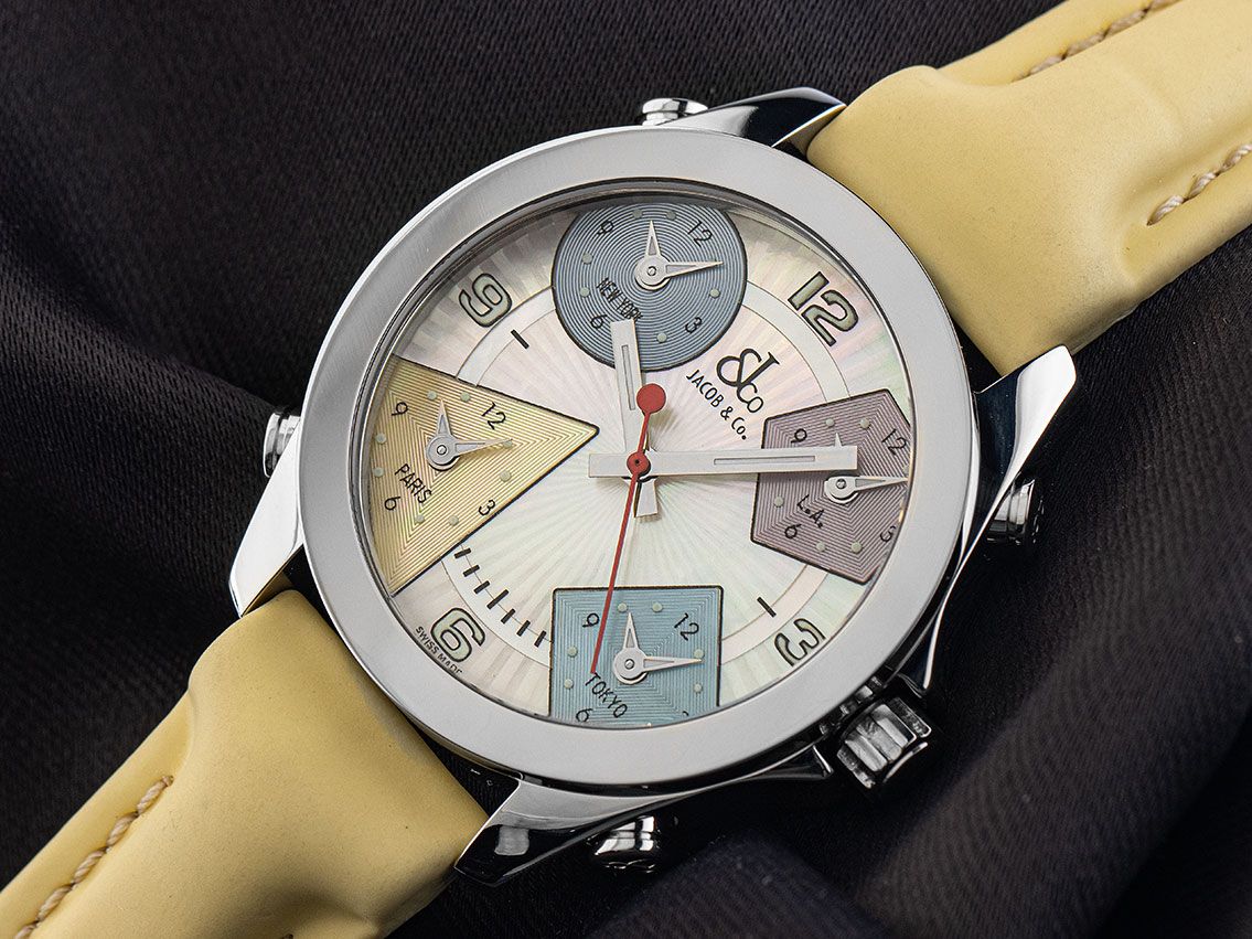 Jacob & Co. 5 Time New York L.A. Paris Tokyo Stahl Perlmutt Quarz Armband Kautschuk Faltschließe