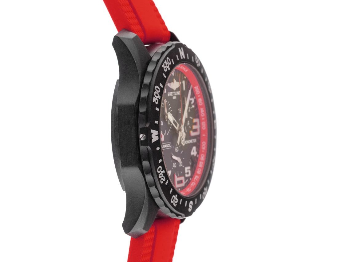 Breitling Endurance Pro Breitlight® Superquarz Chronograph Armband KautschukGehäuse Breitlight® satiniert, Gehäusedurchmesser ohne Krone 38mm, Gehäusehöhe 12,1mm. Lünette Breitlight® mit Windrose, beidseitig drehbar. Armband Kautschuk rot, Anstoßbreite 18mm, Stiftschließe Breitlight® mit Hersteller-Logo. Zifferblatt schwarz mit aufgesetzten arabischen Ziffern und Edelstahl Leuchtzeigern. Uhrwerk Superquartz thermokompensiertes Werk, Chronometer mit Zeugnis, Kaliber Breitling 83 mit 6 Edelsteinen. Anzeige von Stunde und Minute über Zeiger aus der Mitte, kleine Sekunde mit Sekundenstopp zur sekundengenauen Einstellung der Uhrzeit bei 6 Uhr, Datumsanzeige mit Schnellverstellung zwischen 4 und 5 Uhr. Saphirglas kratzfest und doppelseitig entspiegelt. Krone mit Flankenschutz und Hersteller-Logo, 2 Dichtungen. Boden Breitlight® 4-fach verschraubt und graviert. Gewicht der Uhr inklusive Armband 46g. Wasserdicht bis 10 ATM. Referenznummer: X83310D91B2S1, ID: ST116045560325H-3450, Artikelnummer: 10000079374. Original Breitling Box und Garantie Papiere von 2025 sowie Beschreibung, Full Set. Ungetragen. Lieferzeit sofort.