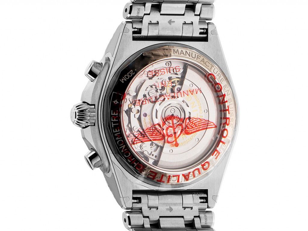 Gehäuse Edelstahl satiniert, Gehäusedurchmesser ohne Krone 42mm, Gehäusehöhe 15,5mm. Lünette Edelstahl mit 60-Minuten Skala und Leuchtpunkt, einseitig drehbar mit Sperre. Braçadeira Rouleaux Edelstahl poliert und satiniert, verdeckte Breitling Doppelfaltschließe Edelstahl mit Hersteller-Logo. Zifferblatt schwarz mit aufgesetzten Edelstahl Leuchtindexen und Edelstahl Leuchtzeigern. Funcionamento automático, cronógrafo, cronómetro com mecanismo de alarme, Manufakturkaliber Breitling 01 com 47 Edelsteinen, reserva de marcha ca. 70 Stunden. Anzeige von Stunde und Minute über Zeiger aus der Mitte, kleine Sekunde mit Sekundenstopp zur sekundengenauen Einstellung der Uhrzeit bei 9 Uhr, Datumsanzeige mit Schnellverstellung bei 6 Uhr. Saphirglas kratzfest, doppelseitig entspiegelt und bombiert. Zwiebelkrone verschraubbar mit Flankenschutz und Hersteller-Logo. Corpo em Edelstahl verschraubt und graviert mit Saphirglas Sichtfenster. Peso da unidade incluindo a braçadeira 198g, comprimento das braçadeiras incluindo a braçadeira 205mm. Gehäuse 205mm. Pressão de água até 20 ATM. Número de referência: AB0134101B1A1, ID: ST116012860425H-8900, Artikelnummer: 10000079861. Caixa original Breitling e papel de garantia, conjunto completo. Não disponível. Lieferzeit sofort.