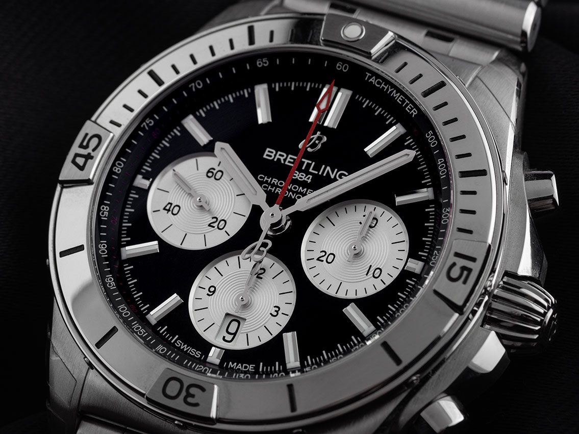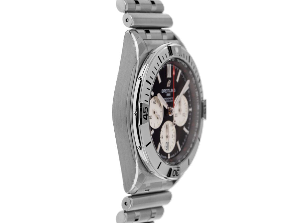 Breitling Chronomat B01 Stahl Automatik Chronograph Armband StahlGehäuse Edelstahl satiniert, Gehäusedurchmesser ohne Krone 42mm, Gehäusehöhe 15,5mm. Lünette Edelstahl mit 60-Minuten Skala und Leuchtpunkt, einseitig drehbar mit Sperre. Rouleaux Armband Edelstahl poliert und satiniert, verdeckte Breitling Doppelfaltschließe Edelstahl mit Hersteller-Logo. Zifferblatt schwarz mit aufgesetzten Edelstahl Leuchtindexen und Edelstahl Leuchtzeigern. Uhrwerk Automatik, Chronograph, Chronometer mit Zeugnis, Manufakturkaliber Breitling 01 mit 47 Edelsteinen, Gangreserve ca. 70 Stunden. Anzeige von Stunde und Minute über Zeiger aus der Mitte, kleine Sekunde mit Sekundenstopp zur sekundengenauen Einstellung der Uhrzeit bei 9 Uhr, Datumsanzeige mit Schnellverstellung bei 6 Uhr. Saphirglas kratzfest, doppelseitig entspiegelt und bombiert. Zwiebelkrone verschraubbar mit Flankenschutz und Hersteller-Logo. Boden Edelstahl verschraubt und graviert mit Saphirglas Sichtfenster. Gewicht der Uhr inklusive Armband 198g, Länge des Armbandes inkl. Gehäuse 205mm. Wasserdicht bis 20 ATM. Referenznummer: AB0134101B1A1, ID: ST116012860425H-8900, Artikelnummer: 10000079861. Original Breitling Box und Garantie Papiere, Full Set. Ungetragen. Lieferzeit sofort.
