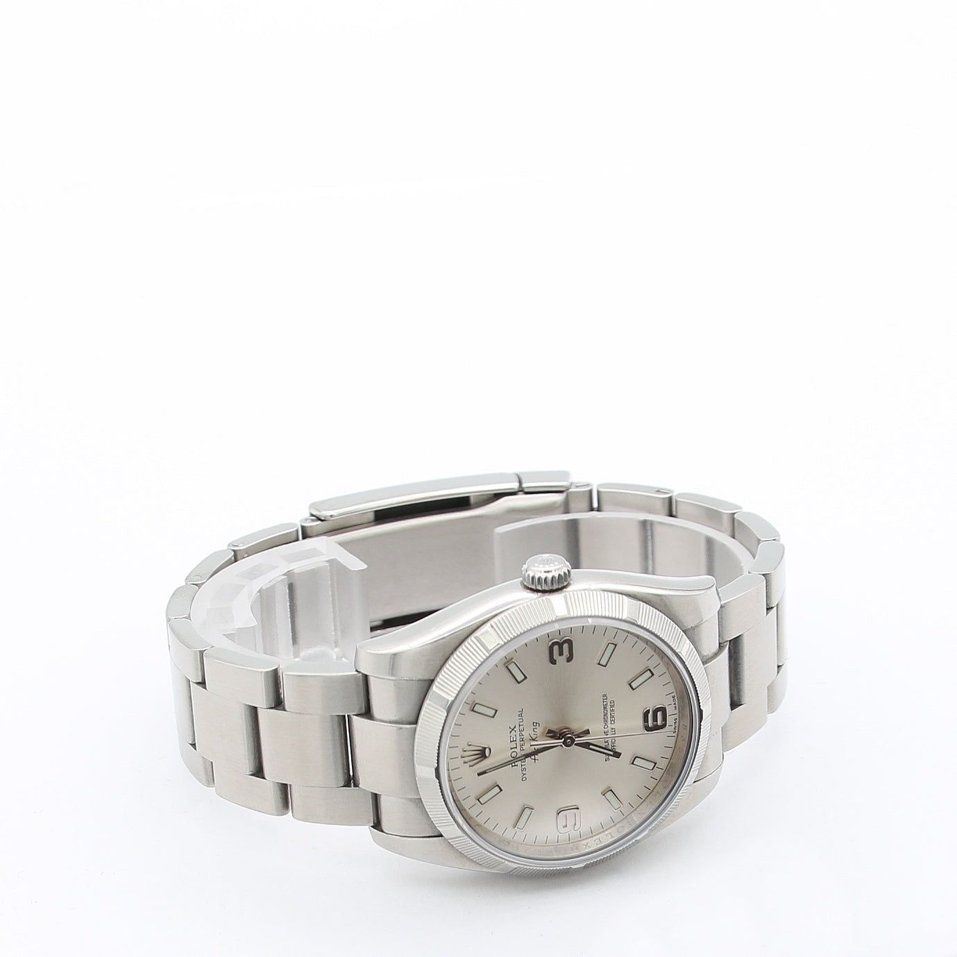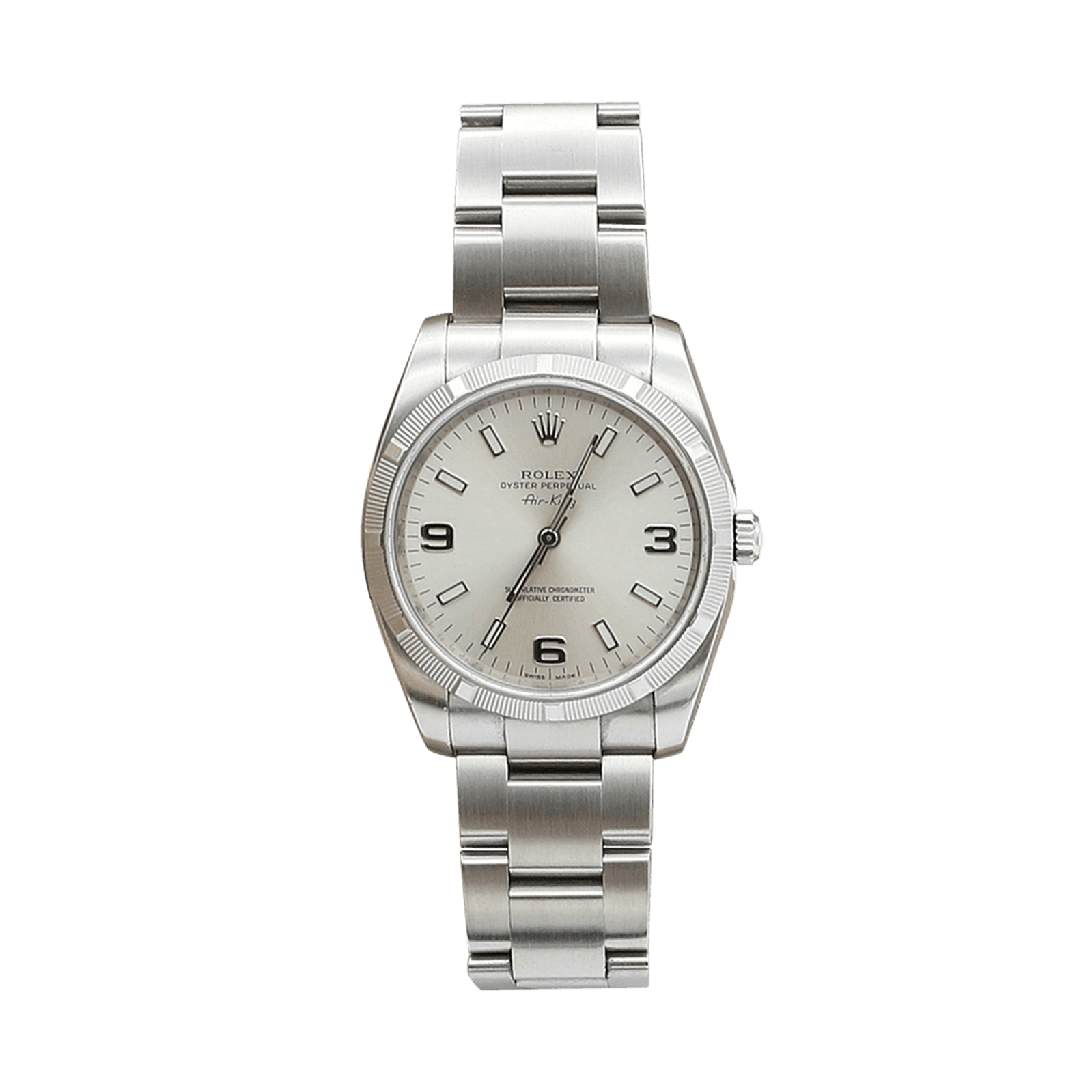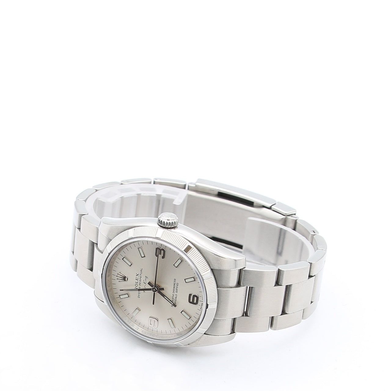 For sale at Debonar Watches: pre-owned Rolex Air-King ref. 114210 with a beautiful silver dial with 3-6-9 numerals, full set. Featuring a 34mm Oystersteel case, this model offers a balanced and versatile size, suitable for both men and women. The watch is equipped with a smooth or engine-turned bezel, adding a distinctive touch to its aesthetic. Powered by the Rolex Caliber 3130, the self-winding movement ensures precise timekeeping. The scratch-resistant sapphire crystal protects the stunning silver dial. With a 100m water resistance, the Oyster case and screw-down crown provide durability for everyday wear. The Oyster bracelet with an Oysterclasp ensures comfort and security on the wrist, making the Rolex 114210 a perfect choice for those seeking an understated yet elegant timepiece. BRAND ROLEX MODEL AIR-KING REFERENCE 114210 CASE MATERIAL STEEL MOVEMENT AUTOMATIC DIMENSION 34 MM DIAL SILVER 3-6-9 BEZEL STEEL CRYSTAL SAPPHIRE BRACELET TYPE OYSTER BRACELET MATERIAL STEEL BRACELET LENGHT 17 CM ORIGINAL BOX YES ORIGINAL PAPERS YES YEAR 2008 CONDITION VERY GOOD