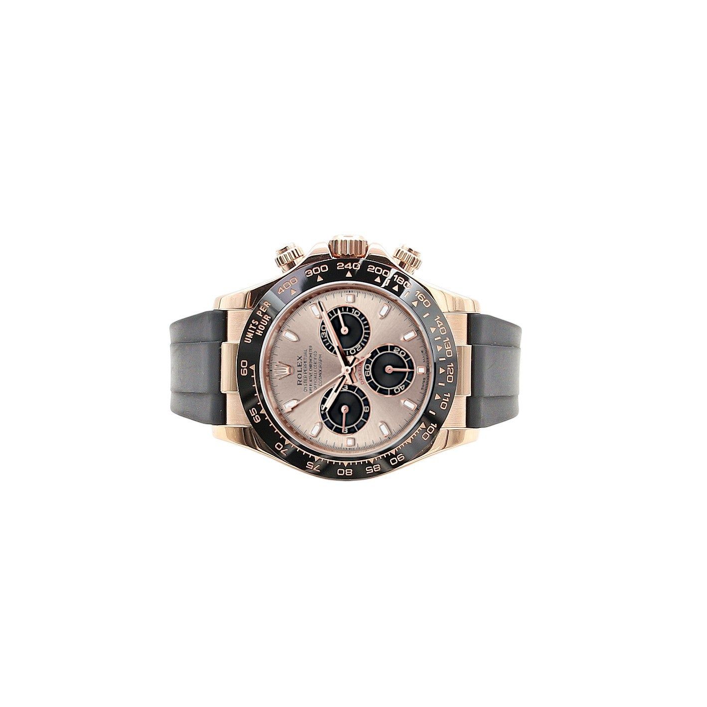 For sale at Debonar Watches: pre-owned Rolex Daytona 116515 in excellent conditions, full set. The strap is an Oysterflex by Rubber B. This 18k gold watch case presents a bright sundust dial with black subdials.The Daytona ref. 116515LN made its debut at Baselworld 2011 with its 40mm Oyster case in 18k rose gold that pairs impeccably well with the black ceramic bezel. A quick note on the gold and ceramic materials; these are not standard “off-the-shelf” varieties, but rather, Rolex-enhanced ones. The metal is the Rolex-exclusive rose gold alloy—aka Everose—which the brand claims will not fade over time. On the other hand, the Cerachrom ceramic bezel is yet another Rolex patent where the material is not only resistant to scratching but will also not fade even after decades of exposure to the sun. As with all versions of the Rolex Daytona, the ref. 116515LN includes an engraved tachymeter on the bezel—an integral component to the chronograph function. This scale, in conjunction with the chronograph, permits the wearer to measure 400 units (whether kilometers or miles) per hour. This is what ultimately makes the Daytona Cosmograph a racecar driver’s watch. BRAND ROLEX MODEL DAYTONA REFERENCE 116515LN CASE MATERIAL PINK GOLD MOVEMENT AUTOMATIC DIMENSION 40 MM DIAL SUNDUST WITH BLACK SUBDIALS BEZEL CERAMIC CRYSTAL SAPPHIRE BRACELET TYPE STRAP BRACELET MATERIAL RUBBER BRACELET LENGHT 17 CM ORIGINAL BOX YES ORIGINAL PAPERS YES YEAR 2016 CONDITION EXCELLENT