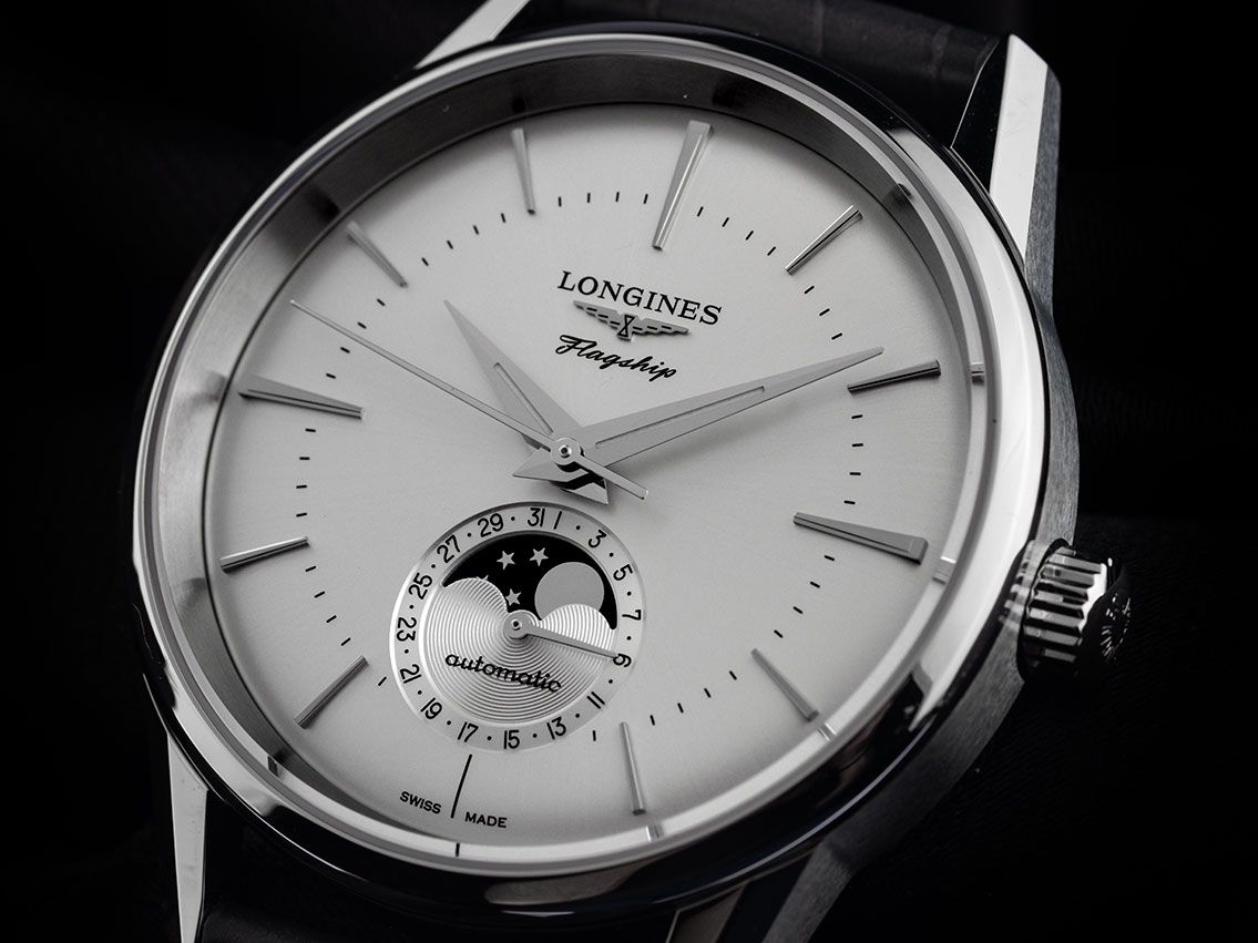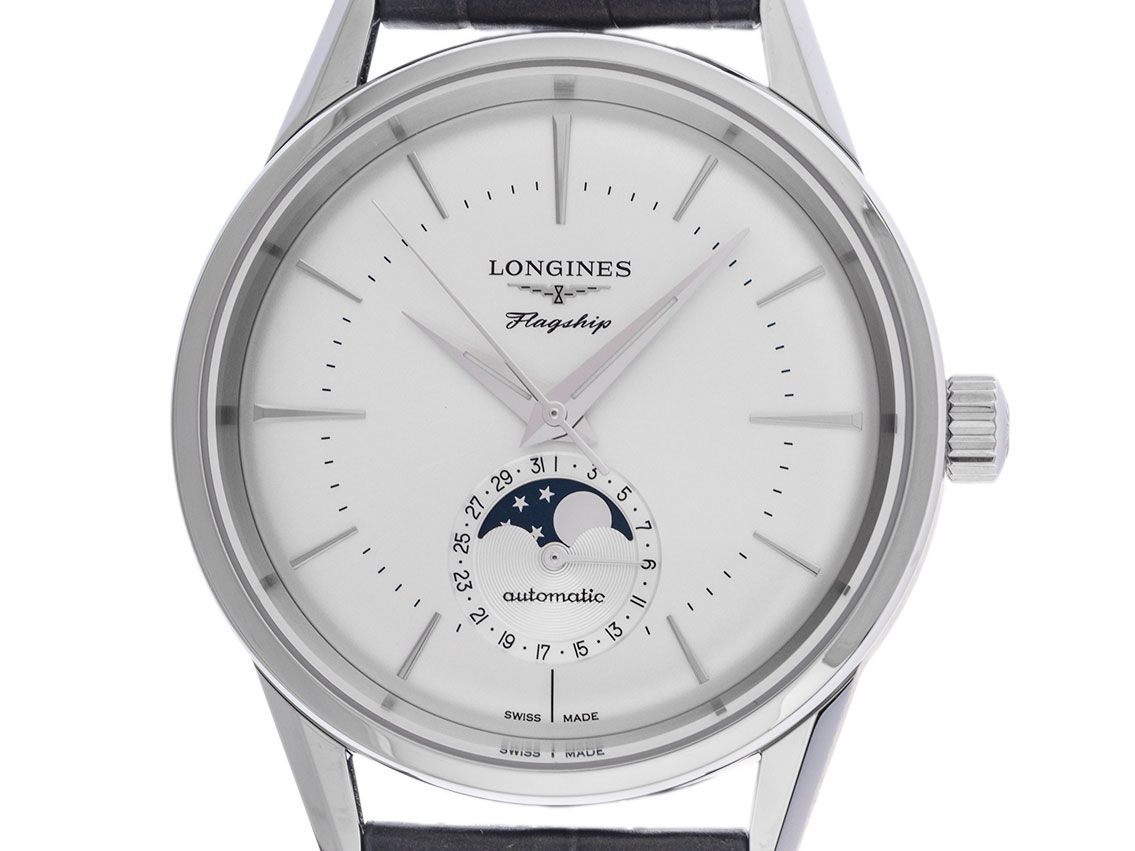 Flagship Heritage Mondphase Automatik Armband LederGehäuse Edelstahl poliert und satiniert, Gehäusedurchmesser ohne Krone 38,5mm, Gehäusehöhe 12,4mm. Lünette Edelstahl glatt und poliert. Armband Leder grau mit Ziernaht, Anstoßbreite 19mm, Stiftschließe Edelstahl mit Hersteller-Logo. Zifferblatt silberfarben mit aufgesetzten Edelstahl Indexen und Edelstahl Zeigern. Uhrwerk Automatik, Kaliber Longines L899, Gangreserve ca. 72 Stunden. Anzeige von Stunde, Minute und Sekunde über Zeiger aus der Mitte, Datumsanzeige mit Schnellverstellung über Zeiger bei 6 Uhr, Mondphasenanzeige bei 6 Uhr. Saphirglas kratzfest. Krone geriffelt mit Hersteller-Logo. Boden Edelstahl verschraubt und graviert. Gewicht der Uhr inklusive Armband 73g. Referenznummer: L4.815.4.72.2, ID: ST116048040425H-3400, Artikelnummer: 10000079976. Original Longines Box mit Umkarton und Garantie Papiere von 2025 sowie Beschreibung, Full Set. Ungetragen. Lieferzeit sofort.