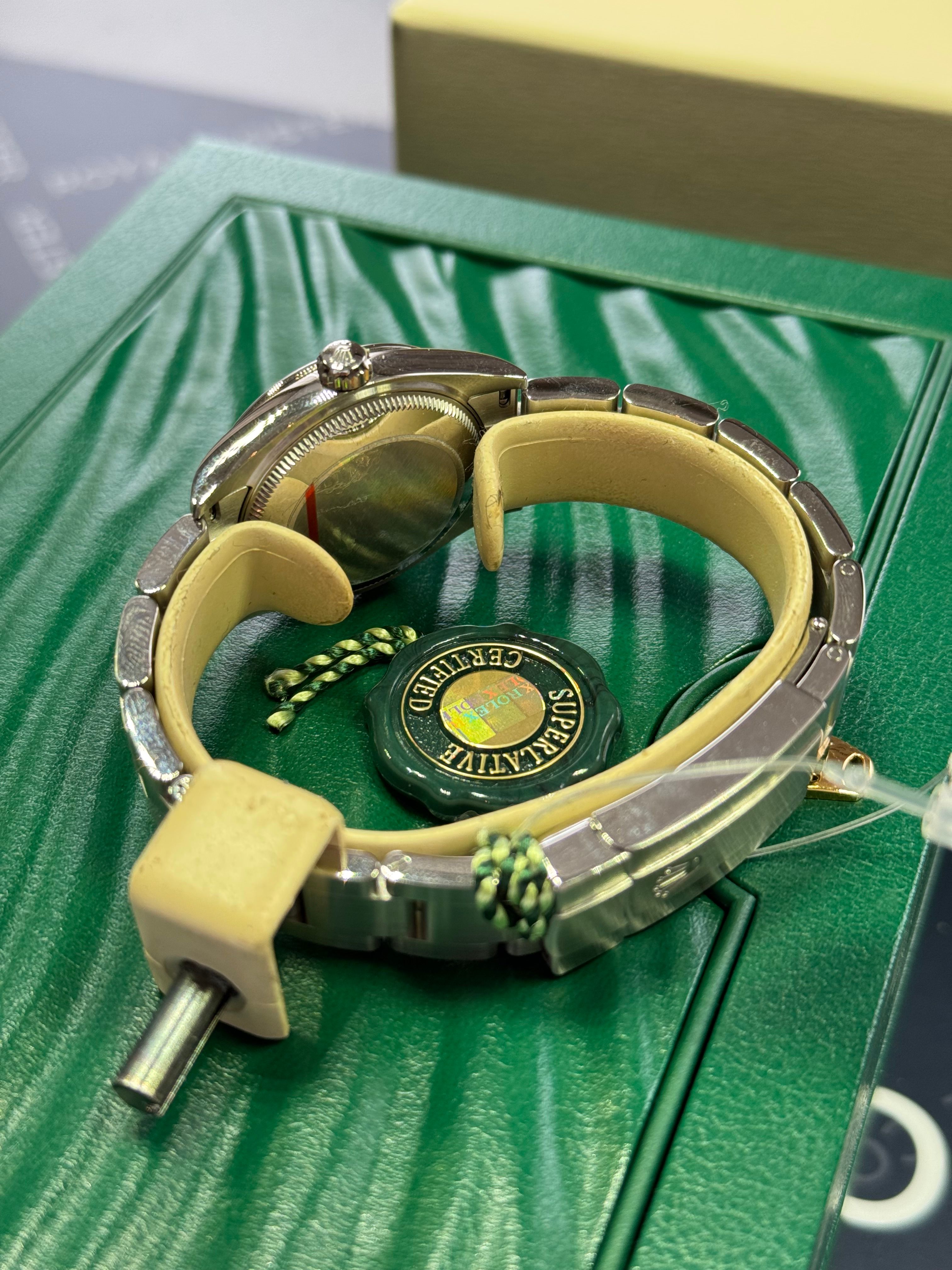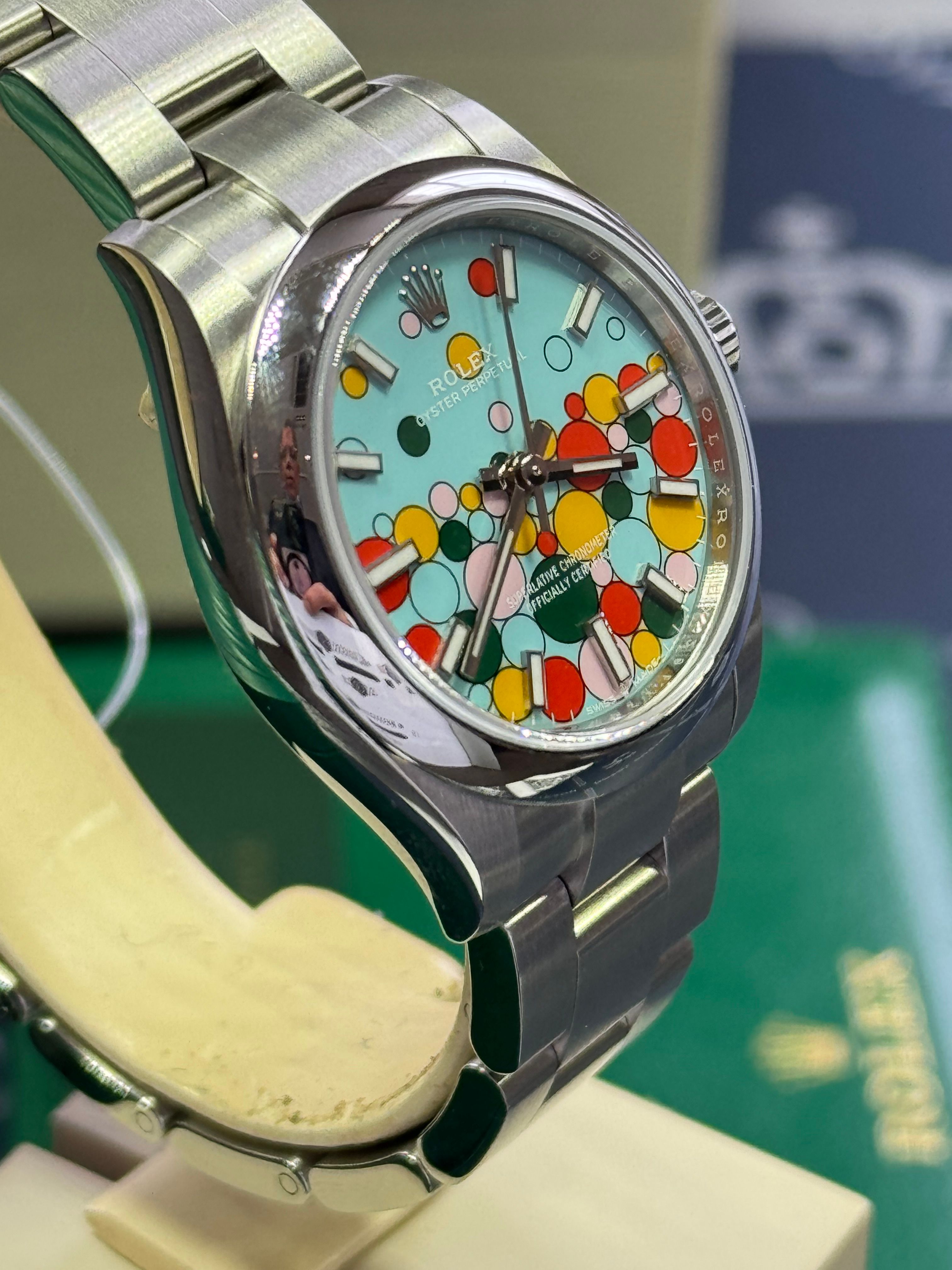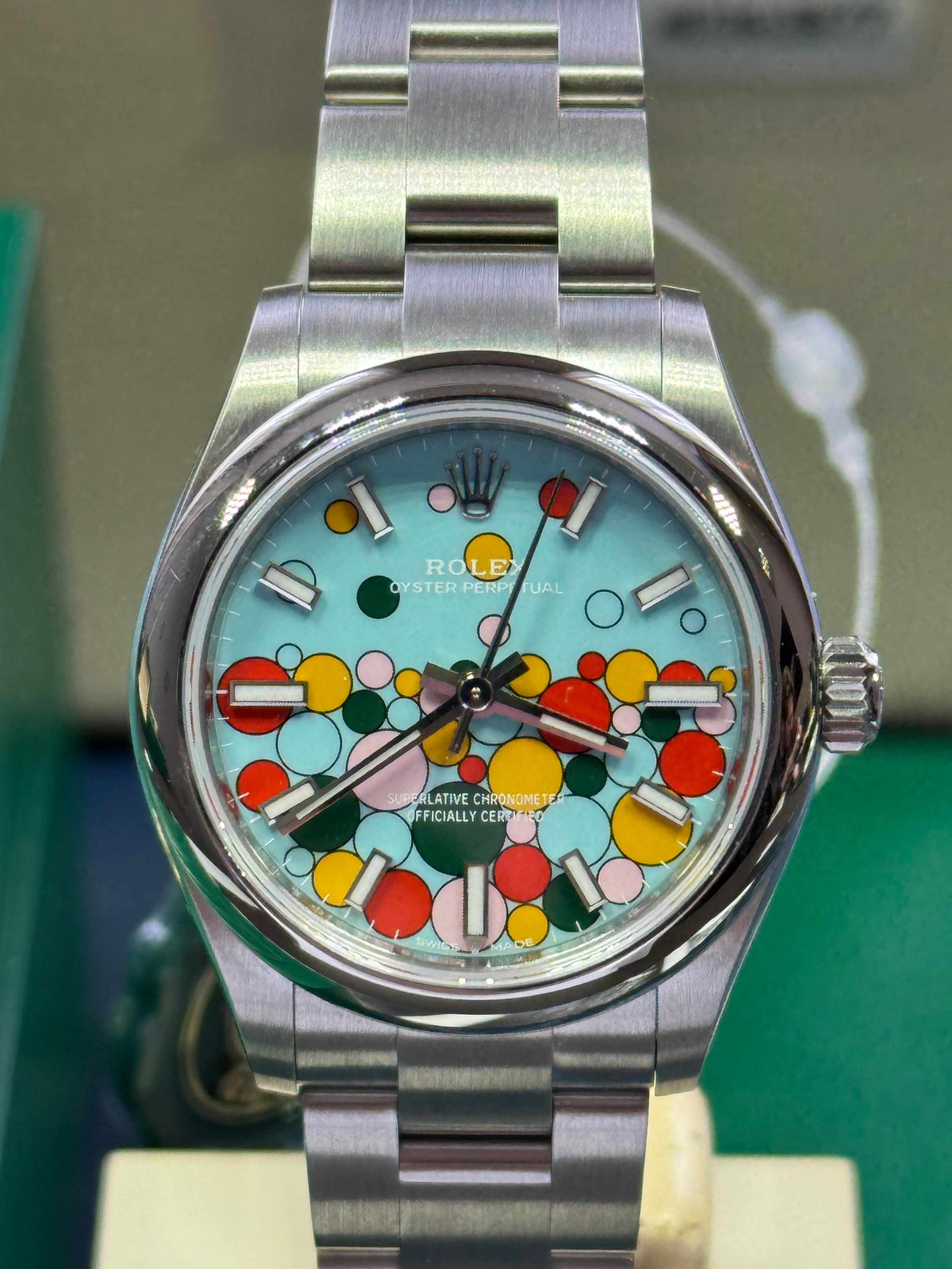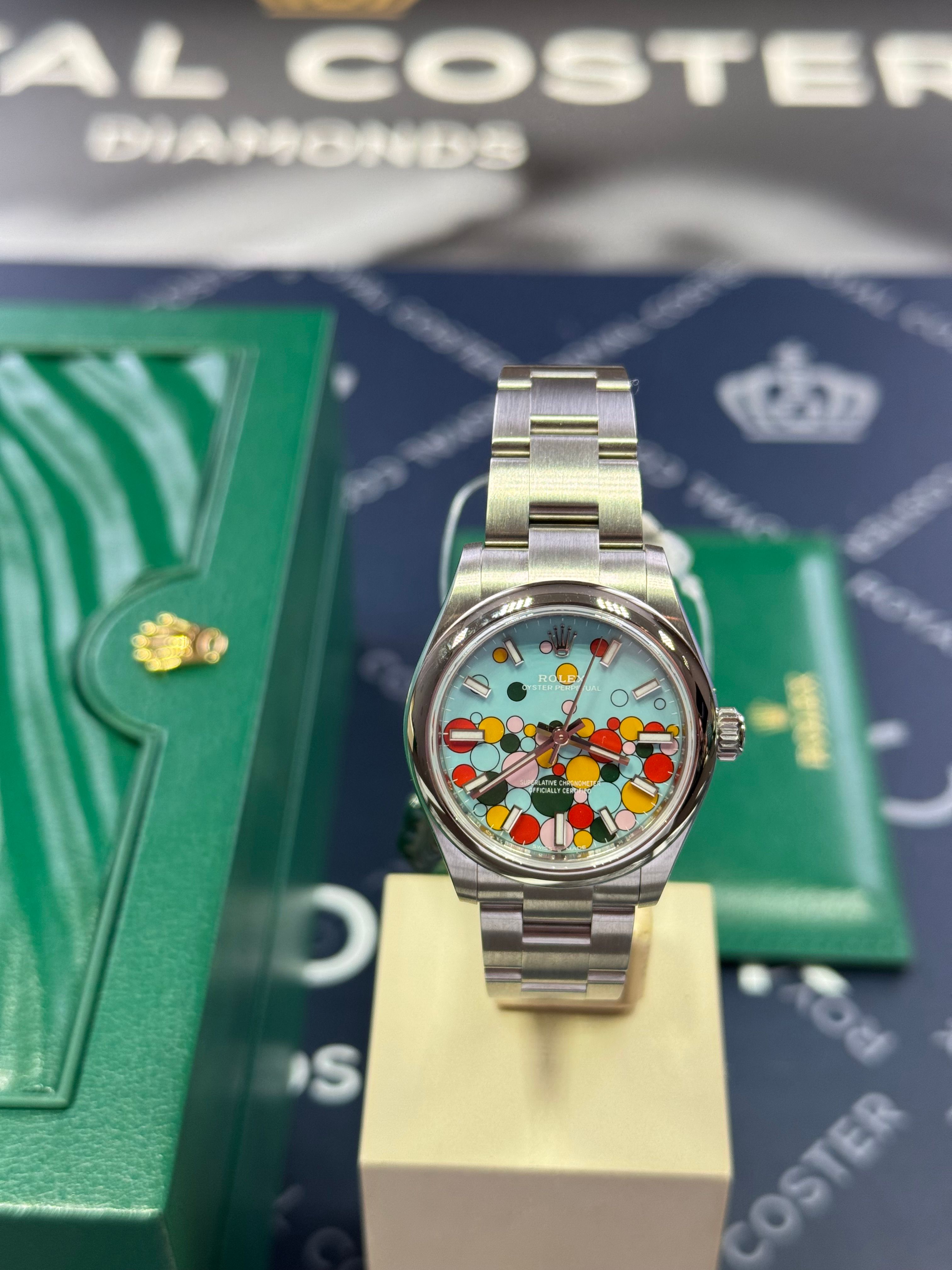 The discontinued "Celebrations" OP 277200 in 31mm. This dial has all the dial colors that Rolex delivered on the OPs until spring 2025. They are now taken of the Rolex website, and it is not possible to purchase anymore other than the second hand market. This watch is basically as good as new and all complete and we offer it for the best price on Wristler and that other site. The guarantee card has been stamped in November of 2023.The watch can be ordered and picked up at Wristler or at Royal Coster Diamonds in Amsterdam (on the Museumplein). Let us know what your preference is so we can make sure the watch is at the correct location.